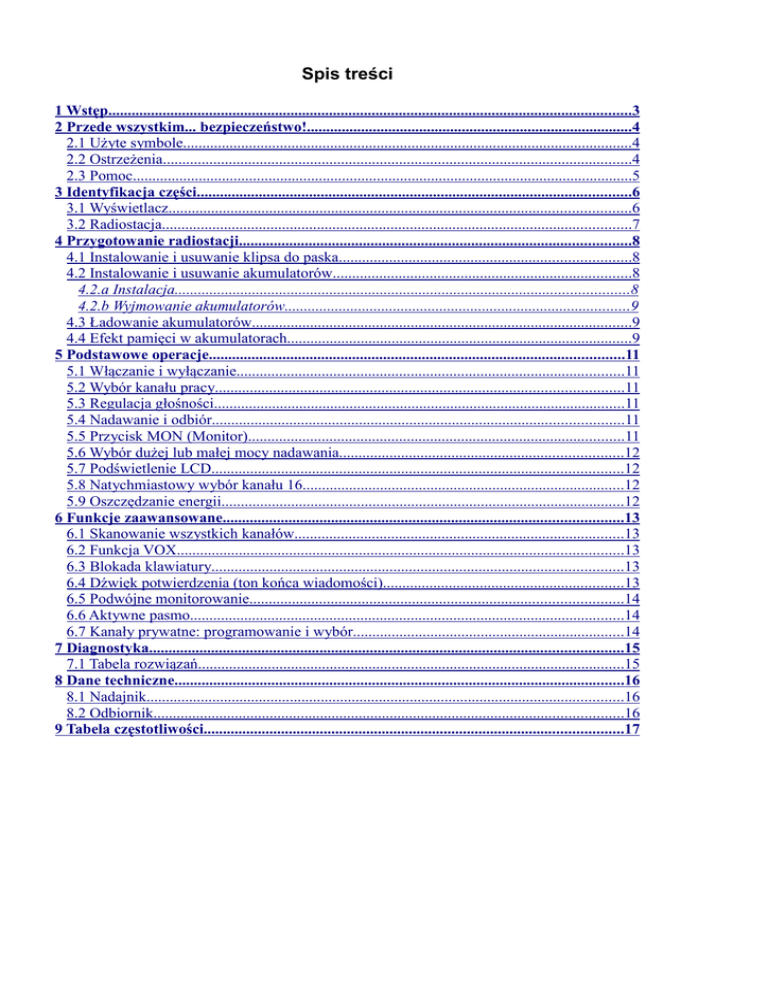 Spis treści 1 Wstęp.......................................................................................................................................3 2 Przede wszystkim... bezpieczeństwo!....................................................................................4 2.1 UŜyte symbole....................................................................................................................4 2.2 OstrzeŜenia.........................................................................................................................4 2.3 Pomoc.................................................................................................................................5 3 Identyfikacja części................................................................................................................6 3.1 Wyświetlacz.......................................................................................................................6 3.2 Radiostacja.........................................................................................................................7 4 Przygotowanie radiostacji.....................................................................................................8 4.1 Instalowanie i usuwanie klipsa do paska...........................................................................8 4.2 Instalowanie i usuwanie akumulatorów.............................................................................8 4.2.a Instalacja.....................................................................................................................8 4.2.b Wyjmowanie akumulatorów.........................................................................................9 4.3 Ładowanie akumulatorów..................................................................................................9 4.4 Efekt pamięci w akumulatorach.........................................................................................9 5 Podstawowe operacje...........................................................................................................11 5.1 Włączanie i wyłączanie....................................................................................................11 5.2 Wybór kanału pracy.........................................................................................................11 5.3 Regulacja głośności..........................................................................................................11 5.4 Nadawanie i odbiór..........................................................................................................11 5.5 Przycisk MON (Monitor).................................................................................................11 5.6 Wybór duŜej lub małej mocy nadawania.........................................................................12 5.7 Podświetlenie LCD..........................................................................................................12 5.8 Natychmiastowy wybór kanału 16...................................................................................12 5.9 Oszczędzanie energii........................................................................................................12 6 Funkcje zaawansowane.......................................................................................................13 6.1 Skanowanie wszystkich kanałów.....................................................................................13 6.2 Funkcja VOX...................................................................................................................13 6.3 Blokada klawiatury..........................................................................................................13 6.4 Dźwięk potwierdzenia (ton końca wiadomości)..............................................................13 6.5 Podwójne monitorowanie................................................................................................14 6.6 Aktywne pasmo................................................................................................................14 6.7 Kanały prywatne: programowanie i wybór......................................................................14 7 Diagnostyka..........................................................................................................................15 7.1 Tabela rozwiązań..............................................................................................................15 8 Dane techniczne....................................................................................................................16 8.1 Nadajnik...........................................................................................................................16 8.2 Odbiornik.........................................................................................................................16 9 Tabela częstotliwości............................................................................................................17 WSTĘP Nowa ręczna radiostacja morska PACIFIC jest w stanie spełnić wymagania komunikacyjne dla wszystkich rodzajów nawigacji, zarówno profesjonalnych, jak i hobbystycznych. PACIFIC jest solidna, zaawansowana elektronicznie oraz umoŜliwia czytelną i pewną komunikację w morskim paśmie VHF na wszystkich kanałach przypisanych przez ITU. Oferuje ona bezpieczeństwo dla wszystkich nawigacyjnych wymagań, między innymi dzięki temu, Ŝe posiada dedykowany przycisk, który daje natychmiastowy dostęp do kanału alarmowego 16. PACIFIC, dyspnująca 57 kanałami oraz posiadająca 5W wyjściowej mocy nadawania, jest wykonana z podzespołów specjalnie zaprojektowanych do tego rodzaju sprzętu. PACIFIC jest szczególnie prosta w uŜyciu i gwarantuje najlepsze działanie we wszystkich sytuacjach, takŜe dzięki blokadzie klawiatury, która zapobiega przypadkowemu naciskaniu przyci