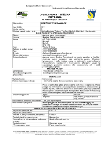 Europejskie Służby Zatrudnienia Wojewódzki Urząd Pracy w Białymstoku OFERTA PRACY – WIELKA BRYTANIA Nr. Referencyjny: DER/25174 Stanowisko: Kod ISCO: Liczba etatów: Miejsce zatrudnienia – kraj: Status: Nazwa: Adres: Kraj: Telefon (z kodem kraju): Fax: E-mail: Strona internetowa: Opis działalności: Lokalizacja: Powód oddelegowania pracownika: Wykształcenie: Doświadczenie zawodowe: RZEŹNIK WYKRAWACZ 7511 5 Wielka Brytania Watton, Thetford, Norfolk, Hull, North Humberside DANE PODMIOTU OFERUJĄCEGO PRACĘ Agencja pracy tymczasowej Quattro Recruitment Ltd 6-7 Guildhall Hill Norwich Norfolk NR2 1JG Wielka Brytania 00441603767617 00441603603400 [email protected] www.quattrorecruitment.co.uk Agencja pracy Quattro Recruitment ma swoją siedzibę w Norfolk i obejmuje swoim zasięgiem całą wschodnią Anglię. Oferujemy tymczasowe i stałe miejsca pracy w sektorach: przemysłowym, transportowym, handlowym i budowlanym. Oferujemy usługi na najwyższym poziomie zarówno dla pracodawców jak i osób poszukujących pracy i MIEJSCE PRACY Pracodawca użytkownik Oddelegowanie przez Agencję WYMAGANIA kierunkowe - minimalne roczne doświadczenie na stanowisku Praca w zakładzie gdzie przetwarzane jest mięso wieprzowe. Praca polega na trybowaniu poszczególnych elementów wieprzowych tj. szynki, łopatki, karkówki oraz uda i oprawiania gotowego produktu. Poszukujemy zmotywowanych kandydatów Rzeźników-Wykrawaczy mięsa wieprzowego na szybkich taśmach rozbioru. Znajomość języków: Język Poziom angielski rozumienie, porozumiewanie się, pisanie Uprawnienia/ dyplomy/ dokumenty - tak, jeśli są dostępne Przed podjęciem pracy odbędzie się test kwalifikacyjny na Inne istotne wymagania: podstawie, którego instruktor oceni zdolność do pracy z nożem Umiejętność posługiwania się nożem rzeźniczym WYNAGRODZENIE I WARUNKI ZATRUDNIENIA Wysokość pensji brutto: 6.50 – 9 Wysokość pensji netto: Waluta, w jakiej wypłacana jest pensja: Funtów Rodzaj stawki wynagrodzenia: Na godzinę Nazwa firmy, z którą zostanie podpisana Quattro Recruitment Ltd umowa: Rodzaj umowy: Umowa o pracę Wymiar czasu pracy Praca na pełen etat EURES (Europejskie Służby Zatrudnienia) to sieć współpracy pomiędzy Komisją Europejską, Publicznymi Służbami Zatrudnienia krajów UE/ EOG oraz innych organizacji partnerskich, w celu dostarczania informacji, usług pośrednictwa pracy i poradnictwa zawodowego dla pracodawców i pracowników chcących skorzystać z zasady wolnego przepływu osób • Inne: • • • • • • • • Jeżeli test przejdą Państwo pomyślnie, zaoferujemy stawki wynagrodzenia: £6.50, £7.25, £8.00, £8.50 do £9.00 na godzinę + możliwość nadgodzin dla zainteresowanych Czas pracy od 40 do 55 godzin tygodniowo Do 28 dni płatnego urlopu rocznie Biuro koordynatora bezpośrednio na miejscu pracy w fabryce Odzież ochronną w pracy Pomoc w otwarciu konta bankowego Pomoc w uzyskaniu obowiązkowego numeru ubezpieczenia zdrowotnego (National Insurance) Pomoc w wypełnieniu wszelkich niezbędnych dokumentów Pomoc w ubieganiu się o świadczenia rodzinne SPOSÓB SKŁADANIA WNIOSKU Wymagane dokumenty CV Język, w którym muszą być sporządzone przedkładane dokumenty: Do kogo należy wysłać dokumenty: (do pracodawcy/ doradcy EURES) angielski Dane teleadresowe doradcy EURES lub przedstawiciela pracodawcy: ( Bezpośrednio do pracodawcy na adres [email protected] oraz do informacji Wojewódzkiego Urzędu Pracy w Lublinie na adres [email protected] Marta Sadlowska Doradca EURES / Eures Adviser tel / fax: 0048 81 472 56 34 e-mail: [email protected] WAŻNOŚĆ Termin przedkładania podań o pracę / zakończenia ważności oferty: Do odwołania Agencja pracy tymczasowej, oświadczyła, że prowadzi działalność zgodnie z przepisami obowiązującymi w swoim kraju. Uprzejmie informujemy, że skontaktujemy się wyłącznie z wybranymi kandydatami. UWAGA: Umowa z zagranicznym pracodawcą zostanie zawarta zgodnie z prawem kraju zatrudnienia. Oznacza to, że wszystkie roszczenia odnośnie do warunków, które obejmuje umowa, można kierować wyłącznie do odpowiedniego sądu w kraju zatrudnienia. Publiczne służby zatrudnienia (EURES) nie mogą pośredniczyć ani reprezentować pracownika w sądzie kraju zatrudnienia w przypadku sporu z pracodawcą. Publiczne służby zatrudnienia (EURES) dokładają wszelkich starań, aby zapewnić rzetelność i wiarygodność ofert pracy zgłoszonych w lokalnym urzędzie pracy. Należy wyjaśnić, że oferta pracy została zgłoszona przez stronę trzecią i EURES nie odpowiada za ewentualne rozbieżności między warunkami pracy określonymi w ofercie pracy i warunkami oferowanymi przez potencjalnego pracodawcę. Publiczne służby zatrudnienia (EURES) informują, że będą zbierać, przetwarzać i przekazywać potencjalnym pracodawcom zgodnie z przepisami dotyczącymi ochrony danych osobowych wszystkie dane osobowe dostarczone przez osoby poszukujące pracy. i Miejsce, w którym będzie wykonywana praca. Należy wypełnić w przypadku gdy: 1) miejsce wykonywania pracy jest inne niż siedziba podmiotu oferującego pracę, 2) pracę oferuje agencja pośrednictwa pracy/ agencja pracy tymczasowej. EURES (Europejskie Służby Zatrudnienia) to sieć współpracy pomiędzy Komisją Europejską, Publicznymi Służbami Zatrudnienia krajów UE/ EOG oraz innych organizacji partnerskich, w celu dostarczania informacji, usług pośrednictwa pracy i poradnictwa zawodowego dla pracodawców i pracowników chcących skorzystać z zasady wolnego przepływu osób