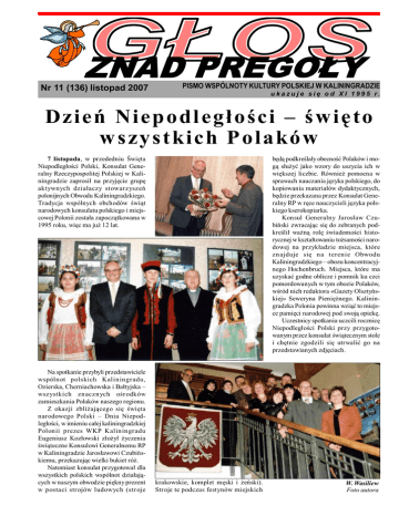 Nr 11 (136) listopad 2007 PISMO WSPÓLNOTY KULTURY POLSKIEJ W KALININGRADZIE u kazu j e się o d X I 1995 r. Dzień Nie po dl eg ł o ści – św ię to w s zy st kic h P o la kó w 7 listopada, w przededniu Święta Niepodległości Polski, Konsulat Generalny Rzeczypospolitej Polskiej w Kaliningradzie zaprosił na przyjęcie grupę aktywnych działaczy stowarzyszeń polonijnych Obwodu Kaliningradzkiego. Tradycja wspólnych obchodów świąt narodowych konsulatu polskiego i miejscowej Polonii została zapoczątkowana w 1995 roku, więc ma już 12 lat. Na spotkanie przybyli przedstawiciele wspólnot polskich Kaliningradu, Ozierska, Cherniachowska i Bałtyjska – wszystkich znacznych ośrodków zamieszkania Polaków naszego regionu. Z okazji zbliżającego się święta narodowego Polski – Dnia Niepodległości, w imieniu całej kaliningradzkiej Polonii prezes WKP Kaliningradu Eugeniusz Kozłowski złożył życzenia świąteczne Konsulowi Generalnemu RP w Kaliningradzie Jarosławowi Czubińskiemu, przekazując wielki bukiet róż. Natomiast konsulat przygotował dla wszystkich polskich wspólnot działających w naszym obwodzie piękny prezent w postaci strojów ludowych (stroje będą podkreślały obecność Polaków i mogą służyć jako wzory do uszycia ich w większej liczbie. Również pomocna w sprawach nauczania języka polskiego, do kopiowania materiałów dydaktycznych, będzie przekazana przez Konsulat Generalny RP w ręce nauczycieli języka polskiego kserokopiarka. Konsul Generalny Jarosław Czubiński zwracając się do zebranych podkreślił ważną rolę świadomości historycznej w kształtowaniu tożsamości narodowej na przykładzie miejsca, które znajduje się na terenie Obwodu Kaliningradzkiego – obozu koncentracyjnego Hochenbruch. Miejsca, które ma uzyskać godne oblicze i pomnik ku czci pomordowanych w tym obozie Polaków, wśród nich redaktora «Gazety Olsztyńskiej» Seweryna Pieniężnego. Kaliningradzka Polonia powinna wziąć to miejsce pamięci narodowej pod swoją opiekę. Uczestnicy spotkania uczcili rocznicę Niepodległości Polski przy przygotowanym przez konsulat świątecznym stole i chętnie zgodzili się utrwalić go na przedstawianych zdjęciach. krakowskie, komplet męski i żeński). Stroje te podczas festynów miejskich W. Wasiliew Foto autora