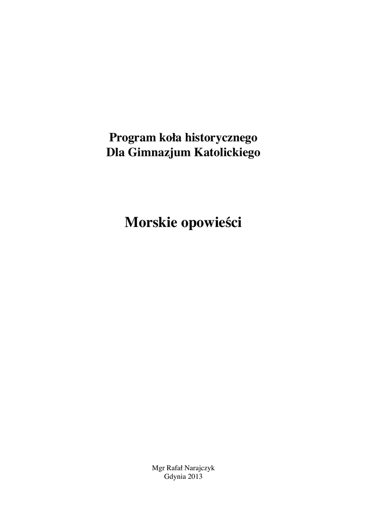 ! ! ! ! ! ! ! ! Program koła historycznego Dla Gimnazjum Katolickiego ! ! ! Morskie opowieści ! ! ! ! ! ! ! ! ! ! ! ! ! Mgr Rafał Narajczyk Gdynia 2013 ! ! I. Wstęp ! Program koła historycznego „Morskie opowieści” skierowany jest do uczniów gimnazjum. Jego realizacja przewidziany jest w roku szkolnym 2013/2014 w wymiarze jednej godziny tygodniowo. Gimnazjum Katolickie w Gdyni wiążą z morzem dwa fakty. Miejsce funkcjonowania – pierwszy polski port zbudowany po odzyskaniu niepodległości oraz bezpośrednia bliskość zabudowań portowych. Autor programu uważa, że warto aby uczniowie poznali także szeroko pojęta historię morza. Stąd tytuł i treści zawarte w programie. Konstrukcja programu pozwala na aktywne uczestnictwo uczniów w zajęciach, a nie jedynie bierny odbiór informacji. II. ! Cele programu ! • • • • • • • • • ! utrwalenie wiedzy i umiejętności nabytych podczas lekcji historii rozwijanie i pogłębianie zainteresowań historycznych rozbudzanie zainteresowania i przekazywanie wiedzy o historii Gdyni oraz regionu pomorza rozwijanie wiedzy o wydarzeniach związanych z morzem kształtowanie umiejętności zdobywania oraz selekcji materiału źródłowego kształtowanie umiejętności analizy tekstu źródłowego rozwijanie globalnego spojrzenia na historię doskonalenie umiejętności interpretacji i oceny wydarzeń historycznych doskonalenie umiejętności pracy w grupie III. Szczegółowe osiągnięcia uczniów ! Wiedza ! • • • • • uczeń zna historię swego miasta i regionu uczeń zna historię wydarzeń na morzach uczeń zna terminologię historyczną i morską uczeń wymienia teksty źródłowe z których korzysta uczeń posiada podstawową wiedzę z historii powszechnej i Polski ! Umiejętności ! • • • • • • • • uczeń analizuje teksty źródłowe uczeń wyszukuje i przeprowadza krytykę źródeł uczeń pracuje z mapą, potrafi umiejscowić wydarzenia w czasie i przestrzeni uczeń przygotowuje prezentacje, referaty uczeń rozwiązuje problemy w sposób twórczy potrafi łączyć wydarzenia z historii powszechnej i Polski uczeń dostrzega związki miedzy konkretnymi wydarzeniami na morzach i oceanach a przemianami społeczno-politycznymi na lądach uczeń zauważa wpływ środowiska morskiego na kształtowanie się gospodarki i polityki regionu pomorskiego ! Postawy ! • ! ! • • • • • uczeń zdobywa silniejsze poczucie związku z miastem i regionem zamieszkania uczeń nabywa szacunku do przeszłości doceniając dorobek poprzedników okazuje przywiązanie do tradycji historycznej krytycznie ocenia wydarzenia historyczne współdziała w grupie, staje się jej liderem tworzy krótkie wypowiedzi używając poprawnej polszczyzny IV. Metody i środki dydaktyczne ! W pracy koła historycznego przewiduje się stosowanie następujących metod dydaktycznych: • Wykład • Praca w grupach • Dyskusja • Analiza tekstów źródłowych • Realizacja projektów • Prezentacja multimedialna ! Do realizacji treści wykorzystane zostaną następujące środki dydaktyczne: • Teksty źródłowe • Opracowania naukowe • Mapy • Prezentacje multimedialne • Filmy V. ! Treści i zagadnienia ! 1. Bitwa pod Salaminą 2. Żeglarze z Fenicji 3. Bitwa pod Akcjum 4. Wikingowie cz. 1 – wyprawa do Ameryki 5. Wikingowie cz. 2 – najazdy Normanów 6. Wikingowie cz. 3 – powstanie Rusi 7. Słowianie na morzach 8. Chińczycy płyną przez oceany 9. Traktat z Tordesillas 10. Franciszek Drake 11. Piraci z Karaibów 12. Flota Rzeczypospolitej 13. Rywalizacja kupców w XVII wieku 14. James Cook 15. Północ – Południe 16. Pierwsze okręty podwodne 17. Skok Pantery do Agadiru 18. Przełamanie blokady w Otranto 19. Mała Wielka Flota 20. Kamikaze 21. Atomowe okręty podwodne 22. Polskie niszczyciele 23. Polska flota handlowa w II wojnie światowej 24. Wielkie katastrofy morskie 25. Wielkie kanały oceaniczne VI. ! Ocenianie osiągnięć uczniów ! Podczas zajęć uczniowie wielokrotnie będą się mogli wykazać zdobytą wiedzą i umiejętnościami prezentując referaty, pracując ze źródłami stawiając tezy i rozwiązując problemy. Przewiduje się pochwały słowne przy grupie uczniów. Aktywny udział w kole jest także jedną z możliwości otrzymania wyższej oceny z przedmiotu historia. ! ! ! ! VII. Ewaluacja ! Najlepszym miernikiem ewaluacyjnym będzie frekwencja, oraz opinie uczniów uczęszczających na zajęcia koła historycznego. Ponadto przewiduje się przeprowadzenie ankiety sprawdzającej osiąganie celów jak i opinie uczestników. Powyższe danę będą analizowane i wpłyną na zmiany w kolejnym roku pracy koła.