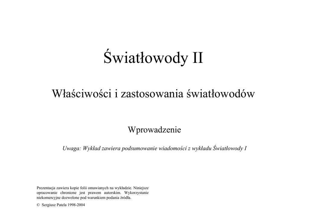 Światłowody II Właściwości i zastosowania światłowodów Wprowadzenie Uwaga: Wykład zawiera podsumowanie wiadomości z wykładu Światłowody I Prezentacja zawiera kopie folii omawianych na wykładzie. Niniejsze opracowanie chronione jest prawem autorskim. Wykorzystanie niekomercyjne dozwolone pod warunkiem podania źródła. © Sergiusz Patela 1998-2004 Schemat systemu światłowodowego Źródło światła (nadajnik) „szum” Detektor światła (odbiornik) Elektryczny sygnał wyjściowy Elektryczny sygnał wejściowy © Sergiusz Patela 1998-2004 Światłowód Swiatłowody II - Wprowadzenie 2 Jak działa światłowód? Efekty i zjawiska, które należy uwzględnić aby w pełni zrozumieć zasadę działania i możliwości światłowodu: • Częstotliwość światła Światło to fala elektromagnetyczna o częstotliwości 3x1014Hz, (prawie milion GHz). • Całkowite wewnętrzne odbicie i bardzo małe tłumienie materiału W światłowodach sygnał może rozchodzić się bez regeneracji na znaczne odległości • Falowa natura światła (interferencja) i mody światłowodu Budowę światłowodu i wiele jego podstawowych parametrów można wyjaśnić tylko uwzględniając fakt, że światło to fala elektromagnetyczna rozchodząca się w falowodzie o małych wymiarach poprzecznych. © Sergiusz Patela 1998-2004 Swiatłowody II - Wprowadzenie 3 Nietelekomunikacyjne zastosowania światłowodów 1. Medycyna: optyczne prowadnice mocy optycznej (chirurgia laserowa), wzierniki(endoskopia) 2. Przemysł samochodowy: niezawodna transmisja danych, wyświetlacze, oświetlacze 3. Czujniki np. Lab-on-a-chip 4. Układy połączeń optycznych, optyczne szyny transmisji danych (tzw. Optical bakcplane) © Sergiusz Patela 1998-2004 Swiatłowody II - Wprowadzenie 4 Włókno - całkowite wewnętrzne odbicie Całkowite wewnętrzne odbicie Średnica rdzenia światłowodu: 10 do 50 mm na długości 1 m daje około 10 000 odbić. Przy współczynniku odbicia 99% doprowadzi to do do wytłumienia sygnału w stosunku 0.9910 000 = 10-44 • Podać prawo Sneliusa, • zdefiniować kąt graniczny, • podać metodę obliczenia kąta granicznego dla granicy szkło-powietrze © Sergiusz Patela 1998-2004 Swiatłowody II - Wprowadzenie 5 10 zalet włókien światłowodowych 1. Ogromna pojemność informacyjna pojedynczego włókna 2. Małe straty = zdolność przesyłania sygnałów na znaczne odległości 3. Całkowita niewrażliwość na zakłócenia elektromagnetyczne 4. Mała waga 5. Małe wymiary 6. Bezpieczeństwo pracy (brak iskrzenia) 7. Utrudniony (prawie niemożliwy) podsłuch przesyłanych danych. 8. Względnie niski koszt (i ciągle spada) 9. Duża niezawodność (poprawnie zainstalowanych łączy światłowodowych) 10 Prostota obsługi. © Sergiusz Patela 1998-2004 Swiatłowody II - Wprowadzenie 6 Krótka historia fotoniki 1876 - Aleksander Graham Bell wynalazł (1880 opatentował) fototelefon. Urządzenie pozwalało komunikować się na odległość 200 m. 1890 - efekt światłowodowy w dielektrykach, Lord Tyndal 1910 - badania i prace teoretyczne nad światłowodami, Lord Rayleigh (Hondros, Debye 1910) 1957 - Wynalezienie lasera (Schawlow, Townes, 1958) 1962 Impulsowy laser GaAs (Hall i in., Nathan i in. 1962) 1965 - propozycja stosowania światłowodów gradientowych w telekomunikacji (Miller 1965) 1966 - Wskazanie, że szkła kwarcowe mogą być stosowane w telekomunikacji do wytwarzania światłowodów o małych stratach (Kao, Hockman 1966) 1968 Publikacja nt małych strat w bryłach topionego kwarcu (Kao, Davis 1968) 1968 Produkcja pierwszego światłowodu telekomunikacyjnego (Uchida i in. 1969) 1970 Produkcja włókna o stratach < 20 dB/km, Corning Glass Company (Kapron i in. 1970) 1985 Opracowanie wzmacniacza światłowodowego (zespół na University of Southampton). Pompowanie laserem półprzewodnikowym = 650nm 3m włókna dało wzmocnienie 125 dB dla fali = 1.55 m. 1998 < Wprowadzenie systemów WDM, włókna plastikowe? © Sergiusz Patela 1998-2004 Swiatłowody II - Wprowadzenie 7 Klasyfikacja światłowodów Klasyfikacja (ze względu na strukturę światłowodu): włókniste - planarne szklane - plastikowe jednomodowe - wielomodowe planarne - paskowe, ... skokowe - gradientowe standardowe - specjalne Inny typ klasyfikacji - ze względu na zastosowanie: telekom, datakom czujniki obrazowody, wzierniki oświetlenie, zdobnictwo © Sergiusz Patela 1998-2004 Swiatłowody II - Wprowadzenie 8 Podstawowe właściwości światłowodów przypomnienie i krótkie podsumowanie •Równania Maxwella • Równanie falowe •Równania modowe i właściwości modowe •Tłumienie •Dyspersja © Sergiusz Patela 1998-2004 Swiatłowody II - Wprowadzenie 9 Podstawowe parametry światłowodów - zestawienie • Optyczne (tłumienie, dyspersja, straty Fresnela, współczynnik załamania, różnica współczynników załamania rdzenia i płaszcza, apertura numeryczna, modowość, częstotliwość (grubość) znormalizowana V, grubość odcięcia modu (długość fali odcięcia), maksymalna moc prowadzona) • Geometryczne • Mechaniczne © Sergiusz Patela 1998-2004 Swiatłowody II - Wprowadzenie 10 Podstawowe parametry światłowodów - dane Tłumienie [dB/km] włókna jednomodowe 1310nm 0,33-0,42 1550nm 0,18-0,25 włókna wielomodowe (gradientowe) 850nm 2,4-2,7 (50/125) 2,7-3,2 (62,5/125) 1300nm 0,5-0,8 0,6-0,9 Dyspersja chromatyczna włókien jednomodowych [ps/km.nm] 1285 - 1330 nm ≤ 3,5 1550nm ≤ 18 Pasmo transmisji włókien wielomodowych [MHz.km] 850nm 400-800 (50/125) 160-400 (62,5/125) 1300nm 400-1500 300-1200 © Sergiusz Patela 1998-2004 Swiatłowody II - Wprowadzenie 11 Równania Maxwella r r ∂B ∇× E = − ∂t r r ∂D r ∇× H = +J ∂t r ∇⋅D = ρ r ∇⋅B = 0 gdzie: J = gęstość prądu [A/m2], ρ = gęstość ładunku [C/m3] r r r r D = ε E = ε0E + P r r r r B = µ H = µ0 H + M © Sergiusz Patela 1998-2004 Swiatłowody II - Wprowadzenie 12 Równania falowe r r ∂ E 2 ∇ E − µ