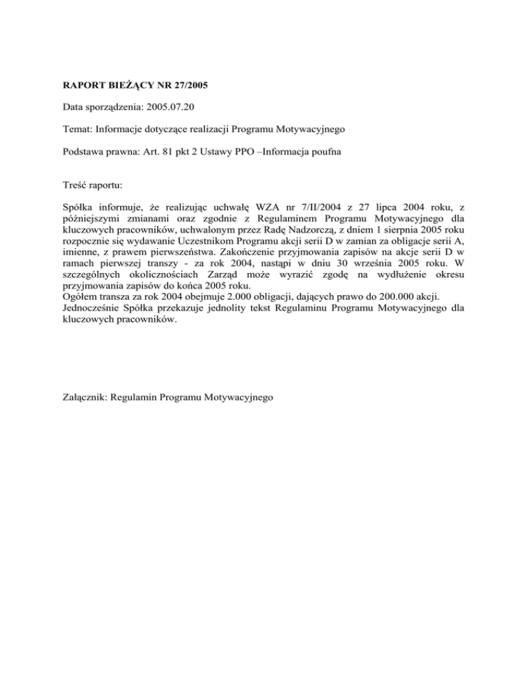 RAPORT BIEŻĄCY NR 27/2005 Data sporządzenia: 2005.07.20 Temat: Informacje dotyczące realizacji Programu Motywacyjnego Podstawa prawna: Art. 81 pkt 2 Ustawy PPO –Informacja poufna Treść raportu: Spółka informuje, że realizując uchwałę WZA nr 7/II/2004 z 27 lipca 2004 roku, z późniejszymi zmianami oraz zgodnie z Regulaminem Programu Motywacyjnego dla kluczowych pracowników, uchwalonym przez Radę Nadzorczą, z dniem 1 sierpnia 2005 roku rozpocznie się wydawanie Uczestnikom Programu akcji serii D w zamian za obligacje serii A, imienne, z prawem pierwszeństwa. Zakończenie przyjmowania zapisów na akcje serii D w ramach pierwszej transzy - za rok 2004, nastąpi w dniu 30 września 2005 roku. W szczególnych okolicznościach Zarząd może wyrazić zgodę na wydłużenie okresu przyjmowania zapisów do końca 2005 roku. Ogółem transza za rok 2004 obejmuje 2.000 obligacji, dających prawo do 200.000 akcji. Jednocześnie Spółka przekazuje jednolity tekst Regulaminu Programu Motywacyjnego dla kluczowych pracowników. Załącznik: Regulamin Programu Motywacyjnego Regulamin Programu Motywacyjnego dla kluczowych pracowników Tekst jednolity po zmianach uchwalonych przez RN 25.02.2005r. I. [Definicje] 1. 2. 3. 4. 5. 6. 7. 8. 9. 10. 11. „Spółka" oznacza „DROZAPOL-PROFIL” S.A. z siedzibą w Bydgoszczy; „Rada Nadzorcza" oznacza Radę Nadzorczą Spółki; „Zarząd” oznacza Zarząd Spółki; „Program" oznacza Program Motywacyjny utworzony na podstawie Uchwały w sprawie Programu; „Uchwała w sprawie Programu" oznacza uchwałę nr 7/II/2004 Walnego Zgromadzenia Spółki z dnia 27 lipca 2004 r., „Uczestnik Programu" oznacza osobę uprawnioną na zasadach Uchwały w sprawie Programu do objęcia akcji Spółki w ramach Programu; „Akcje” oznacza akcje Spółki na okaziciela serii D o wartości nominalnej 1,00 (jeden) złoty każda; „Obligacje” oznaczają obligacje imienne z prawem pierwszeństwa, o wartości nominalnej 1 gr (jeden grosz), które zostaną wyemitowane na podstawie uchwały nr 07/II/2004 Nadzwyczajnego Walnego Zgromadzenia „DROZAPOL-PROFIL” S.A. z dnia 27 lipca 2004 roku w sprawie emisji obligacji z prawem pierwszeństwa do objęcia akcji serii D, warunkowego podwyższenia kapitału zakładowego, zmian Statutu Spółki oraz wyłączenia prawa poboru akcji i z których każda daje prawo do objęcia 100 (stu) Akcji; „Kluczowi Pracownicy” - ilekroć w niniejszym regulaminie jest mowa o pracownikach „DROZAPOL-PROFIL” S.A. i Grupy Kapitałowej tworzonej przez „DROZAPOL-PROFIL” S.A., dotyczy to również Członków Zarządu oraz osób fizycznych związanych z Spółką/Grupą Kapitałową lub współpracujących z nimi na podstawie umów zlecenia, o dzieło lub innych o podobnym charakterze; „Powiernik” – podmiot, któremu zostaną zaoferowane przez Spółkę Obligacje oraz na który zostanie nałożony obowiązek złożenia osobom uprawnionym w ramach Programu ofert zbycia Obligacji, w przypadku spełnienia przesłanek opisanych Uchwałą w sprawie Programu; „Regulamin” oznacza niniejszy regulamin Programu. II. [Postanowienia ogólne] 1. W dniu 27 lipca 2004 roku Nadzwyczajne Walne Zgromadzenie „DROZAPOL-PROFIL” S.A. przyjęło Uchwałę w sprawie Programu, upoważniając i zobowiązując Radę Nadzorczą do przyjęcia Regulaminu Programu na lata 2004 - 2008. 2. Program jest adresowany do kluczowych pracowników Spółki. 3. Program polega na zaoferowaniu Obligacji Powiernikowi, który w ramach Programu złoży osobom uprawnionym oferty zbycia Obligacji, w przypadku spełnienia przesłanek opisanych Uchwałą w sprawie Programu w celu umożliwienia Uczestnikom Programu nabycia w przyszłości do 8.000 Obligacji z prawem objęcia do 800.000 Akcji Spółki w następujących transzach: - za 2004 rok 2.000 sztuk Obligacji - za 2005 rok 3.000 sztuk Obligacji - za 2006 rok 3.000 sztuk Obligacji z tym, że ilość zaoferowanych Obligacji w kolejnych latach może ulec zmianie i przesunięciu na lata kolejne. 4. Wstępna imienna lista osób objętych Programem ustalana będzie odrębnie w każdym roku trwania Programu, zgodnie z wytycznymi określonymi w punkcie 2 i 3 powyżej. Listy takie sporządzi Zarząd Spółki, wskazując liczbę Obligacji z prawem pierwszeństwa do subskrybowania Akcji przysługujących każdemu uprawnionemu w danym roku, a następnie przedstawi je Radzie Nadzorczej Spółki. Rada Nadzorcza zatwierdzi wstępne listy osób objętych Programem i liczbę Obligacji przysługujących każdemu uprawnionemu w danym roku, w terminie do dnia 12.12.2004 r. - za rok obrotowy 2004 i do dnia 28.02 każdego kolejnego roku za dany rok obrotowy. Osobę umieszczoną na zatwierdzonej liście wstępnej, Zarząd zawiadamia o tym fakcie pisemnie, w terminie czternastu dni od daty podjęcia uchwał przez Radę Nadzorczą. Wstępna lista może być uzupełniana i korygowana w ciągu roku przez Zarząd, pod warunkiem, że w ramach listy już zatwierdzonej nie został wykorzystany pełen limit obligacji przeznaczonych do podziału w roku kalendarzowym, którego lista dotyczy (w ramach rezerwy) lub gdy z osobą objętą wstępnym przydziałem rozwiązano umowę o pracę. Zatwierdzenia korekty wstępnej listy dokonuje RN na najbliższym posiedzeniu RN. 5. Po zatwierdzeniu skonsolidowanego sprawozdania finansowego za odpowiednio 2004 rok i kolejne lata, a przed podpisaniem odpowiednich umów z osobami uprawnionymi, Zarząd zobowiązany jest do zweryfikowania liczby Akcji przysługujących każdemu uprawnionemu w danym roku. Zarząd może także pozbawić uczestnika programu prawa do nabycia Obligacji. Zarząd w sposób uznaniowy weryfikuje wykonanie zadań postawionych poszczególnym uprawnionym i w zależności od tej oceny utrzymuje lub zmniejsza liczbę Akcji przysługującą poszczególnym uprawnionym. Tak zweryfikowaną listę uprawnionych z ostateczną liczbą przysługujących poszczególnym uprawnionym Akcji Zarząd przedstaw