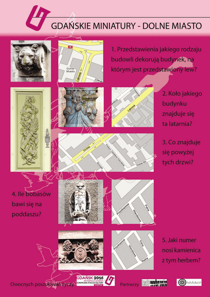 DOLNE MIASTO – PIĘKNO ZAPOMNIANE Od 1647 r. Gdańsk zaczął rozrastać się na wschód od spichlerzy tworząc Dolne Miasto. Jedna z najstarszych nazw tego terenu to Weidengasse czyli „uliczka wierzb”. Dzielnica wyrosła na podmokłym i niebezpiecznym terenie, gdzie wcześniej wypasano krowy i bydło. Z biegiem lat umiejscawiano tu ważne zakłady i fabryki. W XIX w. w Dolnym Mieście mieściły się: rafineria cukru, fabryka wyrobów tytoniowych, odlewnie żelaza, fabryka maszyn, a także przeniesiona z Oliwy Królewska Fabryka Broni. Do dziś można oglądać tu stare magazyny i budynki po zakładach oraz opustoszałą zajezdnię tramwajową. Warto odwiedzić zbudowaną w pierwszych latach XX wieku łaźnię. Obecnie mieści się w niej Centrum Sztuki Współczesnej, które swoją nazwę zawdzięcza dawnej funkcji budynku. 1. Gdańsk z postacią lwa jest związany od dawna. W czasach świetności Ligi Hanzeatyckiej miasto było nazywane „Lwem Hanzy”. Związek Hanzeatycki był porozumieniem miast handlowych Europy Północnej. Zawiązał się w czasach średniowiecza. W okresie świetności Hanza gromadziła niemalże wszystkie miasta pobrzeża Morza Północnego i Bałtyckiego. Przewodziła im Lubeka, przepiękne miasto portowe na północy Niemiec. Liga miała monopol kupiecki, czyli tylko jej członkowie mogli prowadzić handel. Bogate miasta Hanzy umiały się bronić przed przeciwnikami. W razie potrzeby, były w stanie wystawiać większe i silniejsze armie niż niejedne królestwa. Później Związek Hanzeatycki stracił na znaczeniu. Odkryto nowe drogi handlowe m.in. do Ameryki, co zakończyło monopol handlowy miast-państw. 2. Latarnia w wielu kulturach uosabia światło duchowe i boskość. To także znak czujności i gotowości. Można powiedzieć, że Gdańsk był miastem latarń. W 1766 r. było ich na ulicach 868. Wiele z nich zrekonstruowano, czyli zbudowano od nowa na wzór zachowanych szkiców i rysunków. Są one przykładem na to, że piękne przedmioty na co dzień towarzyszyły życiu gdańszczan. A im piękniejsza rzec, tym więcej pracy włożono w jej zrobienie, i tym wyższa też była jej cena. Dlatego wypuszczenie z warsztatu przedmiotu, który był zbyt prosta, za mało złocony, lub ze zbyt małą ilością cennych kamieni, było ujmą na honorze rzemieślników. Warto też pamiętać, że otoczenie pełne drogich przedmiotów, szczególnie bogato złoconych, świadczyło o znaczeniu jego posiadacza. Bogactwo tzw. ”na pokaz” było bardzo ważne dla kupców. 3. Te drzwi prowadzą do dawnego letniego dworku wybitnego rodu gdańskiego - rodziny Uphagenów. Przez lata jej członkowie byli obecni w życiu miasta. Jeden z nich był rajcą w Gdańsku, w czasach gdy II rozbiór Polski odebrał wolność miastu. Na znak protestu Uphagen zrezygnował z pełnienia funkcji w urzędzie i ubrał czarny strój. Strój ten nosił na znak żałoby, po utraconej wolności ukochanego miasta, do śmierci. Dworek odkupiono od rodziny Uphagenów w ok 1853 r. i przekazano siostrom boromeuszkom na szpital. Lecznica była szeroko znana i ceniona. To tu pracował dr Aleksander Majkowski, jeden z najwybitniejszych pisarzy kaszubskich. 4. Widoczny na zdjęciu herb jest typowym sposobem przedstawiania „Lwów Gdańskich”. Tradycyjnie podtrzymują one herb miasta. Gdańszczanie wybrali na symbol miasta lwy nie tylko dlatego, że kojarzą się one z dostojnością i potęgą. Jedno z najważniejszych miast-państw w czasach średniowiecznych - Wenecja, obrała za swój symbol „Lwa św. Marka”. Gdańsk, jako miasto kupieckie, wzorował się na ustroju republiki weneckiej. „Gdańskie Lwy” przypominają, że gdańszczanie chcieli stworzyć miasto tak samo potężne jak Wenecja. 5. Sowa jest symbolem mądrości. Warto przy tej okazji powiedzieć parę słów na temat rozwoju nauki w Gdańsku. W 1227 r. w całym mieście było tylko trzech nauczycieli: Gerwin, Ewrard i Jan. Później przybyli następni. Początkowo uczyli w szkołach przykościelnych, a z biegiem stuleci rozwinęło się szkolnictwo świeckie. W średniowieczu, miasto było na tyle bogate, że mieszkańcy umieli pisać i znali łacinę oraz niemiecki. Języka polskiego natomiast uczyli się tylko bogaci kupcy. W XVI w. typowy budynek szkoły składał się z kuchni i od pięciu do dziesięciu izb. Pracowało tam około ośmiu nauczycieli, a uczniów potrafiło być nawet dwustu. Za złe zachowanie karano: bito rózgą, ale tylko: „po lędźwiach w łagodny sposób, żeby nie było żadnych skarg” (Januszajtis, str.32, 2003). Na szczęście, czasy się zmieniły... Nieopodal stąd znajdują się stare fortyfikacje, które są częścią pierścienia kilkunastu bastionów oraz kamienna śluza, która służyła do regulowania poziomu wód w fosach. Pozwalała ona w razie potrzeby zalać część Żuław i tym samym odciąć nieprzyjacielowi dostęp do miasta. Dziś te tereny zamieniono w miejsce do spacerów. Warto tam odwiedzić m.in. tzw. dziewice, czyli ozdobne wieżyczki kamiennej śluzy. Tkwią one nieprzerwanie, zanurzone w lodowatej wodzie, mimo że żaden rycerz ich od dawna już nie próbuje zdobyć. Dziękujemy za wspólny spacer i zapraszamy w przyszłym tygodniu do odwiedzenia Oliwy. Autorka: Małgorzata Kmicińska Podziękowania dla pani Jolanty Bielawskiej, przewodniczki po Gdańsku. Bibliografia: Januszajtis A. Jujka, Z. (2003). Z uśmiechem przez Gdańsk. Gdańsk: Muzeum Historyczne Miasta Gdańsk. Mamuszka, F. (1988). Trójmiasto. Gdańsk – Sopot – Gdynia. Informator krajoznawczy. Gdańsk: Krajowa Agencja Wydawnicza. Samp, J. (1995),w: Gedanensis Millennii Splendor. Cześć pt.: SPIENTIA. pod red. Klata, M. Mykowski, J. Samp, J. (1996). Miasto Wydawnictwo „Marpress”. czterdziestu bram. Glosariusz Gdański. Gdańsk: Samp, J. (1999). Miasto tysiąca tajemnic. Glosariusza gdańskiego część druga. Gdańsk: Wydawnictwo „Marpress”. Kozłowski, A., Janusza-Dowgiałło, K., 
