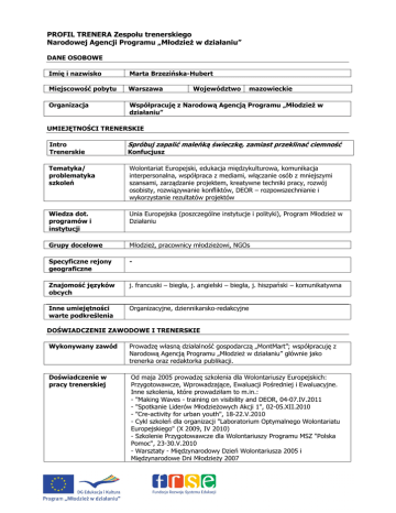 PROFIL TRENERA Zespołu trenerskiego Narodowej Agencji Programu „MłodzieŜ w działaniu” DANE OSOBOWE Imię i nazwisko Marta Brzezińska-Hubert Miejscowość pobytu Warszawa Organizacja Współpracuję z Narodową Agencją Programu „MłodzieŜ w działaniu” Województwo mazowieckie UMIEJĘTNOŚCI TRENERSKIE Intro Trenerskie Spróbuj zapalić maleńką świeczkę, zamiast przeklinać ciemność Tematyka/ problematyka szkoleń Wolontariat Europejski, edukacja międzykulturowa, komunikacja interpersonalna, współpraca z mediami, włączanie osób z mniejszymi szansami, zarządzanie projektem, kreatywne techniki pracy, rozwój osobisty, rozwiązywanie konfliktów, DEOR – rozpowszechnianie i wykorzystanie rezultatów projektów Wiedza dot. programów i instytucji Unia Europejska (poszczególne instytucje i polityki), Program MłodzieŜ w Działaniu Grupy docelowe MłodzieŜ, pracownicy młodzieŜowi, NGOs Specyficzne rejony geograficzne - Znajomość języków obcych j. francuski – biegła, j. angielski – biegła, j. hiszpański – komunikatywna Inne umiejętności warte podkreślenia Organizacyjne, dziennikarsko-redakcyjne Konfucjusz DOŚWIADCZENIE ZAWODOWE I TRENERSKIE Wykonywany zawód Prowadzę własną działalność gospodarczą „MontMart”; współpracuję z Narodową Agencją Programu „MłodzieŜ w działaniu” głównie jako trenerka oraz redaktorka publikacji. Doświadczenie w pracy trenerskiej Od maja 2005 prowadzę szkolenia dla Wolontariuszy Europejskich: Przygotowawcze, Wprowadzające, Ewaluacji Pośredniej i Ewaluacyjne. Inne szkolenia, które prowadziłam to m.in.: - "Making Waves - training on visibility and DEOR, 04-07.IV.2011 - "Spotkanie Liderów MłodzieŜowych Akcji 1", 02-05.XII.2010 - "Cre-activity for urban youth", 18-22.V.2010 - Cykl szkoleń dla organizacji "Laboratorium Optymalnego Wolontariatu Europejskiego" (X 2009, IV 2010) - Szkolenie Przygotowawcze dla Wolontariuszy Programu MSZ "Polska Pomoc", 23-30.V.2010 - Warsztaty - Międzynarodowy Dzień Wolontariusza 2005 i Międzynarodowe Dni MłodzieŜy 2007 ŚcieŜka edukacyjna (zarówno edukacja formalna, jak i uczenie nieformalne) 09.2003-09.2004 Ośrodek Studiów Społecznych Instytutu Filozofii i Socjologii Polskiej Akademii Nauk i Lancaster University: Master of Arts in Sociology 09.1997-03.2003 Akademia Ekonomiczna w Poznaniu: magister Międzynarodowych Stosunków Gospodarczych i Politycznych. Specjalność: Studia Europejskie 05.2001-10.2001 staŜ w ramach Programu Unii Europejskiej „Leonardo da Vinci” w międzynarodowym przedsiębiorstwie Darwin S.A. w Morlaix (Francja) 02.2000 - 07.2000 – Aalborg Universitet (Dania) – stypendium w ramach Programu „Sokrates-Erasmus” (Specjalność: Studia Europejskie) Edukacja pozaformalna: 11.10.2009 – 27.06.2010 Training of Trainers for European Youth in Action Projects (Międzynarodowe Szkolenie dla Trenerów Programu „MłodzieŜ w działaniu”) Graz (Austria), Malaga (Hiszpania), Amendolea (Włochy) 18.11.2008 – 22.11.2008 Szkolenie: „Rozwój kompetencji trenerskich w rozwiązywaniu konfliktów z uwzględnieniem kontekstu międzykulturowego”, Konstancin-Jeziorna, Pracownia Psychologiczna ElŜbieta Sołtys 27-30.11.2007 Szkolenie: „Perspektywa zarządzania róŜnorodnością w pracy trenerskiej”, firma szkoleniowa „Idea zmiany” 28.11.2006 - 02.12.2006 „NEXT STEPS-NEW LIFE?!” – międzynarodowe szkolenie dla trenerów Wolontariatu Europejskiego, Poronin, Narodowa Agencja Programu MŁODZIEś 19-23.04.2006 – „Drama as a tool in youth exchanges” – Międzynarodowy Kurs Szkoleniowy , Jadwisin , Narodowa Agencja Programu MŁODZIEś Stowarzyszenie Praktyków Dramy „STOP-KLATKA” 10-14.12.2005 „Budowanie zespołu”, Nowa Górka, Polski Instytut Ericksonowski 02.2002- 10.2002 Wolontariat Europejski (EVS) we „Foyer des Jeunes Traveilleurs”, Nimes (Francja) 09.1997-03.2001 – udział i organizacja projektów, konferencji i programów międzynarodowych w ramach Międzynarodowego Stowarzyszenia Studentów Nauk Ekonomicznych i Handlowych AIESEC: 6 tygodni w Komitecie Lokalnym AIESEC ESCP w ParyŜu oraz 3 miesiące w Komitecie Lokalnym AIESEC Donostia (Hiszpania) w ramach wymiany międzykulturowej CEED KONTAKT E-mail Tel. Komórkowy [email protected] +48 602 651 581