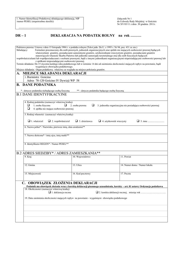 1 DEKLARACJA NA PODATEK ROLNY na rok