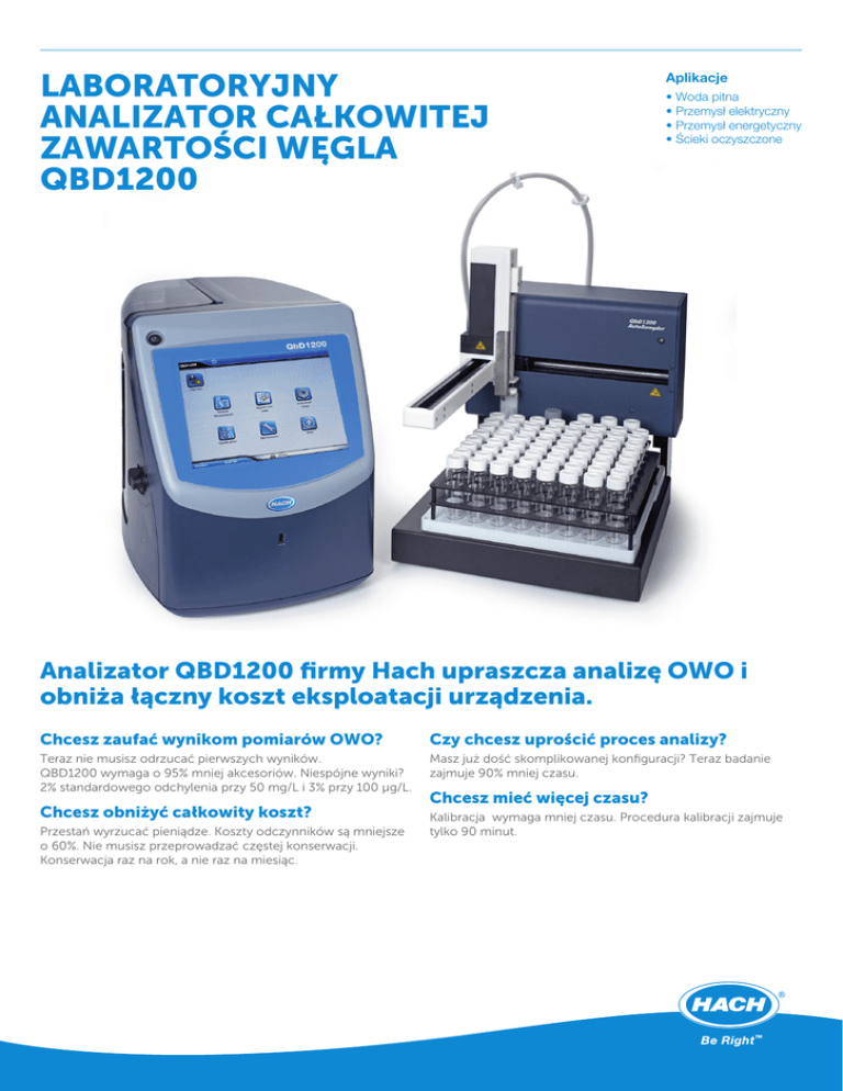 LABORATORYJNY ANALIZATOR CAŁKOWITEJ ZAWARTOŚCI WĘGLA QBD1200 Aplikacje • Woda pitna • Przemysł elektryczny • Przemysł energetyczny • Ścieki oczyszczone Analizator QBD1200 firmy Hach upraszcza analizę OWO i obniża łączny koszt eksploatacji urządzenia. Chcesz zaufać wynikom pomiarów OWO? Czy chcesz uprościć proces analizy? Teraz nie musisz odrzucać pierwszych wyników. QBD1200 wymaga o 95% mniej akcesoriów. Niespójne wyniki? 2% standardowego odchylenia przy 50 mg/L i 3% przy 100 µg/L. Masz już dość skomplikowanej konfiguracji? Teraz badanie zajmuje 90% mniej czasu. Chcesz obniżyć całkowity koszt? Przestań wyrzucać pieniądze. Koszty odczynników są mniejsze o 60%. Nie musisz przeprowadzać częstej konserwacji. Konserwacja raz na rok, a nie raz na miesiąc. Chcesz mieć więcej czasu? Kalibracja wymaga mniej czasu. Procedura kalibracji zajmuje tylko 90 minut. 2 Laboratoryjny analizator całkowitej zawartości węgla QBD1200 Dane techniczne* Zakres pomiarowy 0,4 µg/L - 100 mg/L Metoda kalibracji Automatyczny pomiar: 18 punktów kalibracyjnych z wykorzystaniem KHP (6 stężeń, każde z 3 replikacjami) Precyzja 3% lub 3 µg/L, zależnie od tego, która wartość jest większa Dokładność ±2% Interwał kalibracji 1 rok; czas na kalibrację 90 minut Pozostałość po próbce < 0,2% Certyfiakty zgodności Wielkość cząstek do 100 µm Homogenizacja próbki Osiągalna z autosamplerem Odzysk 1 pomiar ISO 8245 i DIN EN 1484; USP <643> (włączając sterylną wodę SST), JP-16 <2.59>, EP <2.2.44>, IP, CP, KP, US EPA 415.3 i Metoda Standardowa 5310c Węgiel nieorganiczny Brak konieczności stosowania dodatkowego modułu do usuwania nieorganicznego węgla Wymogi energetyczne (napięcie) 100/240 VAC Lampa UV + Gorący Nadsiarczan Wymogi energetyczne (Hz) 47 - 63 Hz Metoda oksydacyjna Gaz nośny Powietrze wolne od CO2, O2 lub N2 410 mm x 320 mm x 507 mm Export danych PDF, CSV Wymiary (wys. x szer. x głęb.) Typ wyświetlacza Kolorowy ekran dotykowy o wysokiej rozdzielczości i przekątnej 10,4" *Może ulec zmianie bez powiadomienia. Zasada działania OWN Dodanie kwasu obniża pH, co powoduje, że nieorganiczny węgiel jest rozpylany jako CO2. Takie rozwiązanie sprawia, że wartość całkowitego nieorganicznego węgla (Total Inorganic Carbon - TIC) nie jest uwzględniana w pomiarze TOC. Utlenianie Przeprowadzenie OWO w CO2. Obecność promieni UV i silnego utleniacza (NH4)2S2O8 powoduje, że, związki organicznego węgla przekształcają się w CO2 wskutek utlenienia. Gaz nośny jest wydmuchiwany przez komorę reakcyjną, przetłaczając cały CO2 przez detektor NDIR. OWO Gazowy CO2 jest wykrywany podczas przepływu przez detektor NDIR. Analiza OWO bazuje na analizie obszaru znajdującego się pod krzywą. Na podstawie kalibracji urządzenia następuje analiza OWO; w tym celu urządzenie przekształca sygnał CO2 (obszaru znajdującego się pod krzywą) na OWO. Informacje do zamówień 9450000 QBD1200 - analizator laboratoryjny OWO QBD1200 - Automatyczny sampler do pobierania próbek 9467100 QBD1200 - automatyczny sampler do pobierania próbek QBD1200 - Części zamienne do urządzenia i autosamplera 9449900 Zestaw do wymiany strzykawek 9449300 Zestaw do wymiany destruktorów ozonu 9459100 Zestaw do wymiany wężyków QBD1200 - Odczynniki/Standardy 9449200 Wymiana reaktora ultrafioletowego 9459400 Roztwór podstawowy, 500 mL 9464200 Zestaw butelki do reagentów/niestandardowa zakrętka 9459500 Roztwór kalibracyjny KHP, 5 mg/L C 9454300 Zasilacz do analizatora QBD1200 9459600 Zestaw do walidacji SBDS 9467200 Tacka do autosamplera do pobierania próbek 9459700 Zestaw do sprawdzania systemu wg USP (500 µg/L) 9454400 9459800 Zestaw do sprawdzania systemu wg USP (8 mg/L) Przejściówka do podłączania przewodów automatu do pobierania próbek QBD1200 9459900 Zestaw do testów specyficzności 9467300 Zasilacz do autosamplera QBD1200 9460000 Zestaw do badań KHP 9467400 Osłonka igły do autosamplera QBD1200 9460100 Zestaw do protokołu walidacji SP6790 Igła do nakłuwania membrany do autosamplera www.pl.hach.com DOC052.60.25005.Jul16 QBD1200 - Laboratoryjny analizator OWO