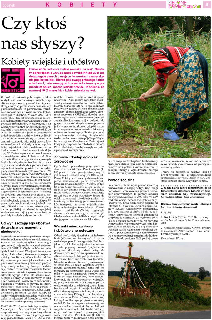 dodatek K O B I E T Y 9 Czy ktoś nas słyszy? Kobiety wiejskie i ubóstwo Blisko 40 % ludności Polski mieszka na wsi1. Niestety, sprawozdanie GUS ze spisu powszechnego 2011 nie dezagreguje danych o miejscu i warunkach zamieszkania pod kątem płci. Biorąc pod uwagę przewagę kobiet w ludności, i równowagę płci na wsi odnotowaną w poprzednim spisie, można jednak przyjąć, iż obecnie co najmniej 40 % wszystkich kobiet mieszka na wsi. W polskim dyskursie publicznym, a także w dyskursie feministycznym kobiety wiejskie nie mają swojego głosu. A jeśli się je dostrzega, to tylko przez neoliberalne okulary przedsiębiorczości i z pominięciem warunków życia na wsi i z wykluczeniem kobiet, które żyją w ubóstwie. W latach 2009 – 2010 zespół Think Tanku Feministycznego prowadził badania partycypatywne z kobietami, w powiecie krośnieńskim, w Wałbrzychu i na wsiach województwa świętokrzyskiego2. Panie, które z nami rozmawiały miały od 17 do 76 lat. W Wałbrzychu jedna z uczestniczek badań pochodziła z rodziny, która po likwidacji PGR-ów przeniosła się do miasta. Ani ona, ani rodzice nie mieli stałej pracy, a kryzys transformacji odbija się w trzecim pokoleniu, bo jej dzieci dzielą z rodzicami bardzo trudne warunki mieszkaniowe i nie dojadają. W Krośnie oprócz mieszkanek miasta rozmawiałyśmy także z kobietami z okolicznych wsi, które straciły pracę w miejscowych farykach, a ich jedynym źródłem utrzymania były niewielkie dochody z pomocy społecznej. W krośnieńskim powiatowym urzędzie pracy zarejestrownych było wówczas 8191 osób, a liczba ofert pracy wynosiła 91. Były to wyłącznie subsydiowane formy zatrudnienia. Podobne doświadczenia, to jest popadnięcie w ubóstwo spowodowane zmianami na rynku pracy i restrukturyzacją gospodarcza było udziałem starszych kobiet ze wsi województwa świętokrzyskiego. Wcześniej ich źródłem utrzymania była praca w gospodarstwie i praca zarobkowa w okolicznych fabrykach, urzędach czy w sklepie. W pierwszych latach transformacji fabryki zostały zlikwidowane, a nowe miejsca pracy, np. w pobliskiej tarnobrzeskiej specjalnej strefie ekonomicznej były niepewne i nie zapewniały trwałych podstaw do życia. Od wyniszczającego ubóstwa do życia w permanentnym niedostatku. Doświadczenia ubóstwa są zróżnicowane pokoleniowo. Starsze kobiety ( z wyjątkiem pani, która utrzymywała się tylko z pracy w gospodarstwie) mają zasoby w postaci emerytur i rent z ZUS i KRUS. Z tych zasobów korzystają ich dzieci i wnuki. W najtrudniejszej sytuacji są młode kobiety, które nie mają wsparcia rodziny. Pani Barbara, która mieszka pod Duklą, wcześniej pracowała jako sanitariuszka i przez krotki czas miała tymczasową pracę w fabryce słodyczy teraz wychowuje troje dzieci. Jej partner, murarz z zawodu bezskutecznie szuka pracy. - Zima to tragiczny okres. Latem człowiek wyżyje z lasu. Do sąsiada można pójść do pracy w polu. Bierzemy ze sobą dzieci do kopania i dostajemy za to ziemniaki. Trzymam je w domu, bo piwnicy nie mam. Przetworów dużo robię, co mogę pcham w słoiki. Mordujemy sie na zeszyt, mówi. „Mordowanie się na zeszyt” oznacza zakupy na kredyt w lokalnym sklepie, gdzie właścicielka czeka na należności od klientów aż przyjdą ich skromne zasiłki z pomocy społecznej. Pani Zofia (76 lat) jest w dużo lepszej sytuacji. Ma rentę z KRUS w wysokości 600 złotych i uzupełnia swoje dochody sprzedażą nabiału na targu w Starachowicach i pomaga córce w jej gospodarstwie. Renta z KRUS i w mia- rę dobre zdrowie chronią ja przed skrajnym ubóstwem. Duża różnicę robi także możliwość produkcji żywności na własne potrzeby. Pani Maria (58 Lat) od 12-ego roku życia pracowała w gospodarstwie i mieszka razem z mężem i chorym na cukrzycę synem. Jej rolnicza emerytura z KRUS (622 złotych) i emerytura męża z pracy w cementowni (która już została zlikwidowana), unijny dodatek do gospodarstwa (600 złotych rocznie) pozwalają im wiązać koniec z końcem, dopóki starcza im sił na pracę w gospodarstwie. - Jak coś się uchowa, to się nie kupuje. Trzeba pracować, żeby z tego wyżyć... jakby tego nie było to by trzeba do sklepu wszystko pójść kupić i byłoby jeszcze gorzej. Z racji na wiek Zofia i jej mąż korzystają z uprawnień nabytych w czasach PRLu. Ich dzieci już nie będą mogły korzystać z podobnych zabezpieczeń. Zdrowie i dostęp do opieki zdrowotnej Oprócz braku pracy druga przyczyna ubóstwa to utrata zdrowia. Pani Gabrysia (48 lat) przeszła dwie operacje tętnicy nogi i jest na zasiłku rehabilitacyjnym 480 złotych. Przez 27 lat pracowała w piekarniach, najpierw państwowych, potem prywatnych, praca na stojąco i dojazdy. - Niestety za tyle lat pracy to jest śmieszne, mówi i niepokoi się o to czy dostanie rentę, jeśli nie będzie mogła wrócić do pracy. Osoby mieszkające na wsi maja o wiele trudniejszy dostęp do opieki zdrowotnej. Likwidacja szpitali nałożyła się na likwidację publicznych środków transportu. A nawet jak jeżdżą autobusy, to barierą jest koszt biletów. Z kolei sytuacja pani Wandy (70 lat), pogorszyła się wraz z chorobą męża, gdy znaczna część ich dochodów z niewielkich emerytur obydwojga przeznaczana jest na lekarstwa. Warunki mieszkaniowe i ubóstwo energetyczne Odkąd skończył się jej zasiłek z tytułu bezrobocia (który można otrzymywać tylko przez 6 miesięcy) pani Elżbieta głoduje. Podobnie jak u innych kobiet w tej sytuacji jej warunki życia pogorszył rozwód. Ryzyko utraty pracy nie rozłożyło się na dwie osoby. Ma dorosłe dzieci, więc nie ma uprawnień do zasiłków rodzinnych. Nie gotuje obiadów, bo to kosztuje drożej niż chleb i coś do chleba. Mieszka w dużym domu, wybudowanym w czasie PRL-u i teraz współdzielonym z innymi członkami rodziny. Zimą nie ma pieniędzy na ogrzewanie i zimą włącza gaz tylko w czasie najgorszych mrozów, albo kiedy do k