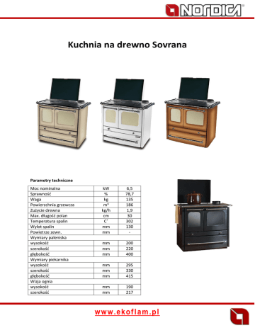 Kuchnia na drewno Sovrana Parametry techniczne Moc nominalna Sprawnośd Waga Powierzchnia grzewcza Zużycie drewna Max. długośd polan Temperatura spalin Wylot spalin Powietrze zewn. Wymiary paleniska wysokośd szerokośd głębokośd Wymiary piekarnika wysokośd szerokośd głębokośd Wizja ognia wysokośd szerokośd kW % kg m³ kg/h cm C˚ mm mm 6,5 78,7 135 186 1,9 30 302 130 - mm mm mm 200 220 400 mm mm mm 295 330 415 mm mm 190 217 www .e kof l am .p l Wymiary www .e kof l am .p l