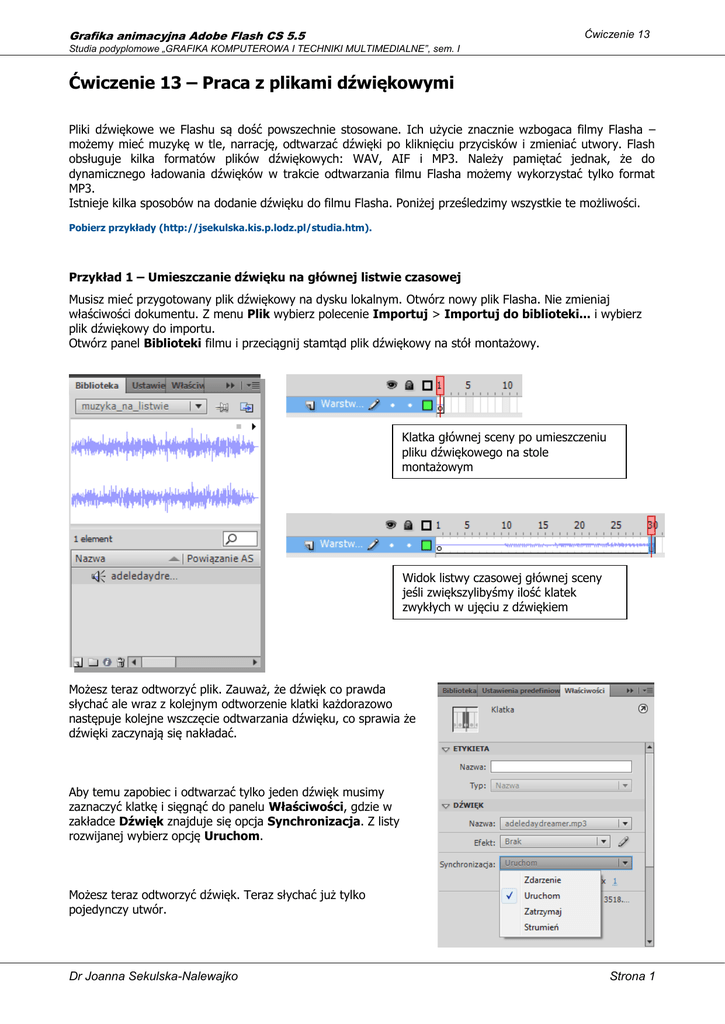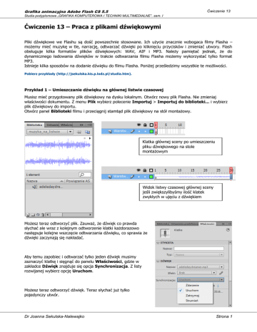 Grafika animacyjna Adobe Flash CS 5.5 Ćwiczenie 13 Studia podyplomowe „GRAFIKA KOMPUTEROWA I TECHNIKI MULTIMEDIALNE”, sem. I Ćwiczenie 13 – Praca z plikami dźwiękowymi Pliki dźwiękowe we Flashu są dość powszechnie stosowane. Ich użycie znacznie wzbogaca filmy Flasha – możemy mieć muzykę w tle, narrację, odtwarzać dźwięki po kliknięciu przycisków i zmieniać utwory. Flash obsługuje kilka formatów plików dźwiękowych: WAV, AIF i MP3. Należy pamiętać jednak, że do dynamicznego ładowania dźwięków w trakcie odtwarzania filmu Flasha możemy wykorzystać tylko format MP3. Istnieje kilka sposobów na dodanie dźwięku do filmu Flasha. Poniżej prześledzimy wszystkie te możliwości. Pobierz przykłady (http://jsekulska.kis.p.lodz.pl/studia.htm). Przykład 1 – Umieszczanie dźwięku na głównej listwie czasowej Musisz mieć przygotowany plik dźwiękowy na dysku lokalnym. Otwórz nowy plik Flasha. Nie zmieniaj właściwości dokumentu. Z menu Plik wybierz polecenie Importuj > Importuj do biblioteki... i wybierz plik dźwiękowy do importu. Otwórz panel Biblioteki filmu i przeciągnij stamtąd plik dźwiękowy na stół montażowy. Klatka głównej sceny po umieszczeniu pliku dźwiękowego na stole montażowym Widok listwy czasowej głównej sceny jeśli zwiększylibyśmy ilość klatek zwykłych w ujęciu z dźwiękiem Możesz teraz odtworzyć plik. Zauważ, że dźwięk co prawda słychać ale wraz z kolejnym odtworzenie klatki każdorazowo następuje kolejne wszczęcie odtwarzania dźwięku, co sprawia że dźwięki zaczynają się nakładać. Aby temu zapobiec i odtwarzać tylko jeden dźwięk musimy zaznaczyć klatkę i sięgnąć do panelu Właściwości, gdzie w zakładce Dźwięk znajduje się opcja Synchronizacja. Z listy rozwijanej wybierz opcję Uruchom. Możesz teraz odtworzyć dźwięk. Teraz słychać już tylko pojedynczy utwór. Dr Joanna Sekulska-Nalewajko Strona 1 Grafika animacyjna Adobe Flash CS 5.5 Ćwiczenie 13 Studia podyplomowe „GRAFIKA KOMPUTEROWA I TECHNIKI MULTIMEDIALNE”, sem. I W panelu Właściwości jest jeszcze jedna przydatna opcja do ręcznej modyfikacji dźwięku – narzędzie Efekt. Służy ono do ustalania efektów dźwiękowych (pogłośnienie, wyciszenie dźwięku, odtwarzanie pojedynczych kanałów stereo itp.). Teraz utworzymy własny efekt dźwiękowy – stopniowe zwiększanie głośności. W warstwie z dźwiękiem staw zwykłe klatki aż do klatki nr 300. Zaznacz klatkę i w panelu Właściwości w sekcji Efekt zaznacz symbol ołówka. Otworzy się okno edycji dźwięku. Na dole tego okna znajdują się opcje wyświetlania listwy czasowej – możemy zmienić powiększenie oraz ustawić wyświetlanie w kontekście czasu lub klatek. Wybierz opcje wyświetlania numerów klatek. W obydwu oknach ze ścieżką dźwiękową (okna symbolizują kanał prawy i lewy dźwięków) wstaw na ciągłej linii dwa punkty do edycji linii – jeden na początku listwy, drugi umieść w klatce nr 100. Złap punkt początkowy i pociągnij linię na sam dół. Ten zabieg spowoduje wyciszenie dźwięku na samym początku i stopniowy wzrost głośności. Przetestuj film (Ctrl + ENTER). Przykład 2 – Umieszczanie dźwięku na listwie czasowej przycisku Otwórz nowy plik i zaimportuj do biblioteki dźwięk lub po prostu skopiuj plik dźwiękowy z biblioteki pliku flasha z poprzedniego ćwiczenia (w nowym pliku skopiowany dźwięk wklej także do biblioteki). Utwórz przycisk i na jego listwie czasowej umieść dźwięk w klatce HIT (taki jak pokazano na ilustracji): Dr Joanna Sekulska-Nalewajko Strona 2 Grafika animacyjna Adobe Flash CS 5.5 Ćwiczenie 13 Studia podyplomowe „GRAFIKA KOMPUTEROWA I TECHNIKI MULTIMEDIALNE”, sem. I Aby dźwięk mógł się odtworzyć musimy jeszcze w panelu Właściwości zmienić opcję Synchronizacja na Zdarzenie: Przetestuj film (Ctrl+ENTER). Przykład 3 – Dodawanie dźwięku z biblioteki w trakcie odtwarzania filmu Otwórz nowy plik i umieść w jego bibliotece dźwięk. Teraz udostępnimy plik z biblioteki po to aby mógł on być dynamicznie pobierany. Procedura, którą za chwilę wykonamy polega na utworzeniu nowej klasy dla naszego symbolu dźwiękowego będącej rozszerzeniem istniejącej już klasy Sound. Dzięki temu będziemy mogli tworzyć nowe instancje danego symbolu dynamicznie. Nazwę tworzonej klasy można utworzyć w oknie Właściwości dźwięku na zakładce ActionScript. Do okna Właściwości dźwięku dostajemy się poprzez menu podręczne wywołane na obiekcie dźwiękowym w bibliotece: W oknie Właściwości dźwięku przejdź na zakładkę ActionScript i zaznacz opcję Eksportuj dla ActionScript. Pozostaw włączoną opcję Eksportuj w klatce 1. W polu tekstowym Klasa wpisz nazwę klasy. W polu tekstowym Klasa bazowa pozostaw klasę flash.media.Sound. Dr Joanna Sekulska-Nalewajko Strona 3 Grafika animacyjna Adobe Flash CS 5.5 Ćwiczenie 13 Studia podyplomowe „GRAFIKA KOMPUTEROWA I TECHNIKI MULTIMEDIALNE”, sem. I Wciśnij OK. Jeśli pojawi się ostrzeżenie, że klasa o takiej nazwie nie została znaleziona i zostanie utworzona, zignoruj je i wciśnij OK. Teraz zaznacz klatkę na listwie czasowej i otwórz panel Operacje. W pierwszej linii kodu utworzymy nowy egzemplarz naszego symbolu dźwiękowego posługując się nazwą klasy dla niego utworzoną. W drugiej linii wywołamy metodę play() dla danego egzemplarza, co spowoduje odtworzenie dźwięku: Przetestuj film (Ctrl+ENTER). Dźwięk powinien się odtwarzać. Przykład 4 – Odtwarzanie zewnętrznych dźwięków Pliki dźwiękowe umieszczane w bibliotece filmu znacznie zwiększają rozmiar wynikowego pliku SWF. Najlepszym rozwiązaniem jest więc osobne przechowywanie dźwięków i wczytywanie ich tylko w momencie, gdy powinny być odtwarzane. Służy do tego metoda load(). Wymaga ona podania tylko jednego parametru. Jest nim obiekt URLRequest, który zawiera ścieżke dostępu do pliku MP3. Otwórz nowy plik f