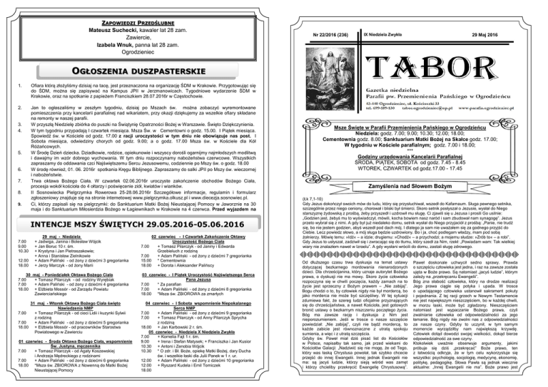 ZAPOWIEDZI PRZEDŚLUBNE Mateusz Suchecki, kawaler lat 28 zam. Zawiercie, Izabela Wnuk, panna lat 28 zam. Ogrodzieniec OGŁOSZENIA Ofiara któr zło yli my dzisiaj na tacę, jest przeznaczona na organizację DM w Krakowie. Przygotowuj c się do DM, mo na się zapisywać na Kampus JPII w Jerzmanowicach. Tygodniowe wydarzenie DM w Krakowie, oraz na spotkanie z papie em Żranciszkiem 28.07.2016r w Częstochowie. 2. Jan to ogłaszali my w zeszłym tygodniu, dzisiaj po Mszach w. mo na zobaczyć wyremontowane pomieszczenia przy kancelarii parafialnej nad wikariatem, przy okazji dziękujemy za wszelkie ofiary składane na remonty w naszej parafii. W przyszł Niedzielę zbiórka do puszki na wi tynię Opatrzno ci Bo ej w Warszawie. więto Dziękczynienia. W tym tygodniu przypadaj I czwartek miesi ca. Msza w. w Cementowni o godz. 15.00. I Pi tek miesi ca. Spowied w. w Ko ciele od godz. 17.00 z racji uroczysto ci w tym dniu nie obowiązuje nas post. I Sobota miesi ca, odwiedziny chorych od godz. 9.00ś a o godz. 17.00 Msza w. w Ko ciele dla Kół Ró ańcowych. W rodę Dzień dziecka. Dziadkowie, rodzice, opiekunowie i wszyscy doro li ogarnijmy najmłodszych modlitw i dawajmy im wzór dobrego wychowania. W tym dniu rozpoczynamy nabo eństwa czerwcowe. Wszystkich zapraszamy do oddawania czci Naj więtszemu Sercu Jezusowemu, codziennie po Mszy w. o godz. 18.00 W rodę równie , 01. 06. 2016r spotkania Kręgu Biblijnego. Zapraszamy do salki JPII po Mszy w. wieczornej i nabo eństwie. Trwa oktawa Bo ego Ciała. W czwartek 02.06.2016r uroczyste zakończenie obchodów Bo ego Ciała, procesja wokół ko cioła do 4 ołtarzy i po więcenie ziół, kwiatów i wianków. II Sosnowiecka Pielgrzymka Rowerowa 25-28.06.2016r Szczegółowe informacje, regulamin i formularz zgłoszeniowy znajduje się na stronie internetowej www.pielgrzymka.olkusz.pl i www.diecezja.sosnowiec.pl. Ci, którzy zapisali się na pielgrzymkiŚ do Sanktuarium Matki Bo ej Nieustaj cej Pomocy w Jaworznie na 30 maja i do Sanktuarium Miłosierdzia Bo ego w Łagiewnikach w Krakowie na 4 czerwca. Przed wyjazdem na 5. 6. 7. 8. 9. INTENCJE MSZY ŚWIĘTYCH 29.05.2016-05.06.2016 7.00 9.00 10.30 12.00 18.00 29 maj - Niedziela + Jadwiga, Janina i Bolesław Wójcik + Jan Boruc 10 r. m. + Krystyna i Jan Pietraszakowieś + Anna i Stanisław Zielnikowie + Adam Paliński - od ony z dziećmi 3 gregorianka + Jerzy Marczyk - od ony Marii 02 czerwiec - I Czwartek Zakończenie Oktawy Uroczysto ć Bożego Ciała 7.00 + Tomasz Pilarczyk - od Janiny i źdwarda żrzebieluch z rodzin 7.00 + Adam Paliński - od ony z dziećmi 7 gregorianka 15.00 * Cementownia 18.00 + Dorota i Aleksander Palińscy 30 maj - Poniedziałek Oktawa Bożego Ciała 7.00 + Tomasz Pilarczyk - od rodziny Wyrębiak 7.00 + Adam Paliński - od ony z dziećmi 4 gregorianka 18.00 + źl bieta Mossór - od Zarz du Powiatu Zawierciańskiego 03 czerwiec - I Piątek Uroczysto ć Naj więtszego Serca Pana Jezusa 7.00 * Za parafian 7.00 + Adam Paliński - od ony z dziećmi 8 gregorianka 18.00 *Msza w. ZBIOROWA za zmarłych 31 maj - Wtorek Oktawa Bożego Ciała więto Nawiedzenia NMP 7.00 + Tomasz Pilarczyk - od cioci Lidii i kuzynki Sylwii z rodzin 7.00 + Adam Paliński - od ony z dziećmi 5 gregorianka 18.00 + źl bieta Mossór - od pracowników Starostwa Powiatowego w Zawierciu 04 czerwiec - I Sobota wspomnienie Niepokalanego Serca NMP 7.00 + Adam Paliński - od ony z dziećmi 9 gregorianka 7.00 + Tomasz Pilarczyk - od Anny Pilarczyk Sprycha z rodzin 18.00 + Jan Karbowski 2 r. m. 05 czerwiec - Niedziela X Niedziela Zwykła 7.00 + Kornelia Żajt 1 r. m. 9.00 + Irena i Stefan Matysekś + Żranciszka i Jan Kusior 10.30 + Antoni i Zenobia Wójcik 10.30 * O zdr. i Bł. Bo e, opiekę Matki Bo ej, dary Ducha w. i wszelkie łaski dla Julii Panek w 1 r. ur. 12.00 + Adam Paliński - od ony z dziećmi 10 gregorianka 12.00 + Ryszard Kudela i źmil Tomiczek 18.00 01 czerwiec 7.00 7.00 18.00 IX Niedziela Zwykła 29 Maj 2016 DUSZPASTERSKIE 1. 3. 4. Nr 22/2016 (236) roda Oktawa Bożego Ciała, wspomnienie w. Justyna, męczennika + Tomasz Pilarczyk - od Agaty Koszewskiej i Andrzeja Mędreckiego z rodzinami + Adam Paliński - od ony z dziećmi 6 gregorianka *Msza w. ZBIOROWA z Nowenn do Matki Bo ej Nieustaj cej Pomocy Msze więte w Parafii Przemienienia Pańskiego w Ogrodzieńcu NiedzielaŚ godz. 7.00ś 9.00ś 10.30ś 12.00ś 18.00ś Cementownia godz. 8.00ś Sanktuarium Matki Bożej na Skałce godz. 17.00ś W tygodniu w Ko ciele parafialnymś godz. 7.00 i 18.00ś *** Godziny urzędowania Kancelarii Parafialnej RODA, PI TźK, SOBOTA od godz. 7.45 - 8.45 WTORźK, CZWARTźK od godz.17.00 - 17.45 Zamy lenia nad Słowem Bożym (Łk 7,1-10) żdy Jezus dokończył swoich mów do ludu, który się przysłuchiwał, wszedł do Kafarnaum. Sługa pewnego setnika, szczególnie przez niego ceniony, chorował i bliski był mierci. Skoro setnik posłyszał o Jezusie, wysłał do Niego starszyznę ydowsk z pro b , eby przyszedł i uzdrowił mu sługę. Ci zjawili się u Jezusa i prosili żo usilnieŚ „żodzien jest, eby mu to wy wiadczył, mówili, kocha bowiem nasz naród i sam zbudował nam synagogę”. Jezus przeto wybrał się z nimi. A gdy był ju niedaleko domu, setnik wysłał do Niego przyjaciół z pro b Ś „Panie, nie trud się, bo nie jestem godzien, aby wszedł pod dach mój. I dlatego ja sam nie uwa ałem się za godnego przyj ć do Ciebie. Lecz powiedz słowo, a mój sługa będzie uzdrowiony. Bo i ja, choć podlegam władzy, mam pod sob ołnierzy. Mówię temuŚ »Id « – a idzieś drugiemuŚ »Chod « – a przychodziś a mojemu słudzeŚ »Zrób to« – a robi”. żdy Jezus to usłyszał, zadziwił się i zwracaj c się do tłumu, który szedł za Nim, rzekłŚ „Powiadam wamŚ Tak wielkiej wiary nie znalazłem nawet w Izraelu”. A gdy wysłani wrócili do domu, zastali sługę zdrowego. Od dłu szego czasu trwa dyskusja na temat ustawy dotycz cej bezkarnego mordowania nienarodzonych dzieci. Dla chrze cijanina