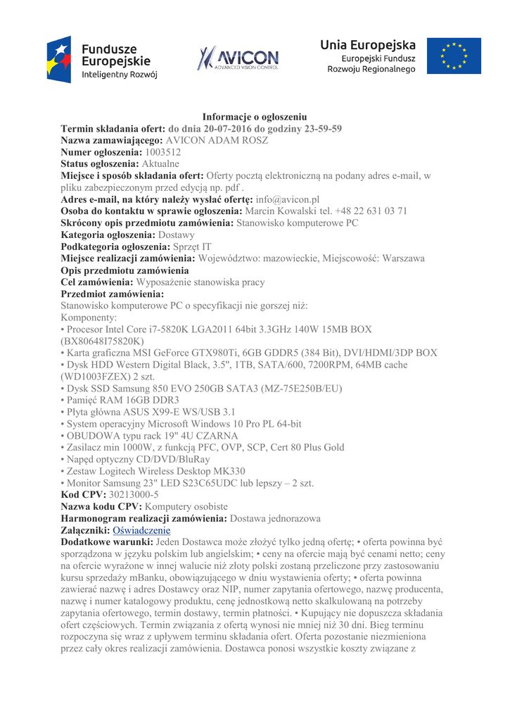 Informacje o ogłoszeniu Termin składania ofert: do dnia 20-07-2016 do godziny 23-59-59 Nazwa zamawiającego: AVICON ADAM ROSZ Numer ogłoszenia: 1003512 Status ogłoszenia: Aktualne Miejsce i sposób składania ofert: Oferty pocztą elektroniczną na podany adres e-mail, w pliku zabezpieczonym przed edycją np. pdf . Adres e-mail, na który należy wysłać ofertę: [email protected] Osoba do kontaktu w sprawie ogłoszenia: Marcin Kowalski tel. +48 22 631 03 71 Skrócony opis przedmiotu zamówienia: Stanowisko komputerowe PC Kategoria ogłoszenia: Dostawy Podkategoria ogłoszenia: Sprzęt IT Miejsce realizacji zamówienia: Województwo: mazowieckie, Miejscowość: Warszawa Opis przedmiotu zamówienia Cel zamówienia: Wyposażenie stanowiska pracy Przedmiot zamówienia: Stanowisko komputerowe PC o specyfikacji nie gorszej niż: Komponenty: • Procesor Intel Core i7-5820K LGA2011 64bit 3.3GHz 140W 15MB BOX (BX80648I75820K) • Karta graficzna MSI GeForce GTX980Ti, 6GB GDDR5 (384 Bit), DVI/HDMI/3DP BOX • Dysk HDD Western Digital Black, 3.5'', 1TB, SATA/600, 7200RPM, 64MB cache (WD1003FZEX) 2 szt. • Dysk SSD Samsung 850 EVO 250GB SATA3 (MZ-75E250B/EU) • Pamięć RAM 16GB DDR3 • Płyta główna ASUS X99-E WS/USB 3.1 • System operacyjny Microsoft Windows 10 Pro PL 64-bit • OBUDOWA typu rack 19" 4U CZARNA • Zasilacz min 1000W, z funkcją PFC, OVP, SCP, Cert 80 Plus Gold • Napęd optyczny CD/DVD/BluRay • Zestaw Logitech Wireless Desktop MK330 • Monitor Samsung 23" LED S23C65UDC lub lepszy – 2 szt. Kod CPV: 30213000-5 Nazwa kodu CPV: Komputery osobiste Harmonogram realizacji zamówienia: Dostawa jednorazowa Załączniki: Oświadczenie Dodatkowe warunki: Jeden Dostawca może złożyć tylko jedną ofertę; • oferta powinna być sporządzona w języku polskim lub angielskim; • ceny na ofercie mają być cenami netto; ceny na ofercie wyrażone w innej walucie niż złoty polski zostaną przeliczone przy zastosowaniu kursu sprzedaży mBanku, obowiązującego w dniu wystawienia oferty; • oferta powinna zawierać nazwę i adres Dostawcy oraz NIP, numer zapytania ofertowego, nazwę producenta, nazwę i numer katalogowy produktu, cenę jednostkową netto skalkulowaną na potrzeby zapytania ofertowego, termin dostawy, termin płatności. • Kupujący nie dopuszcza składania ofert częściowych. Termin związania z ofertą wynosi nie mniej niż 30 dni. Bieg terminu rozpoczyna się wraz z upływem terminu składania ofert. Oferta pozostanie niezmieniona przez cały okres realizacji zamówienia. Dostawca ponosi wszystkie koszty związane z przygotowaniem i złożeniem oferty. Kupujący nie przewiduje zwrotu kosztów udziału w postępowaniu. Lista dokumentów/oświadczeń wymaganych od Wykonawcy: Podmioty działające przez reprezentantów nieujawnionych w KRS lub CEiDG zobowiązane są również załączyć do oferty dokumenty wskazujące na umocowanie osób podpisanych pod treścią oferty. 2. Oświadczenie o braku powiązań osobowych i kapitałowych – według wzoru stanowiącego załącznik do niniejszego ogłoszenia (załącznik – Oświadczenie). Ocena oferty - Kryteria oceny i opis sposobu przyznawania punktacji: Kryteria oceny ofert: cena – 90% , czas dostawy – 10%. Do porównania ofert będzie brana cena netto. Za najkorzystniejszą zostanie uznana oferta, która uzyska najwyższą liczbą punktów, obliczoną według poniższego wzoru: C = Cena najtańszej oferty/Oferowana cena x 90pkt. D = Najkrótszy oferowany termin dostawy/Oferowany czas dostawy x 10pkt. Całkowita liczba punktów, jaką otrzyma dana oferta, zostanie obliczona wg poniższego wzoru: L = C + D gdzie: L – całkowita liczba punktów, C – punkty uzyskane w kryterium „Cena”, D – punkty uzyskane w kryterium „Czas dostawy”. Wykluczenia: Z udziału w postępowaniu wykluczone są podmioty powiązane osobowo i kapitałowo z Zamawiającym. Przez powiązania kapitałowe lub osobowe rozumie się wzajemne powiązania między Zamawiającym lub osobami upoważnionymi do zaciągania zobowiązań w imieniu zamawiającego lub osobami wykonującymi w imieniu zamawiającego czynności związane z przygotowaniem i przeprowadzaniem procedury wyboru wykonawcy, a Wykonawcą, polegające w szczególności na: 1) uczestniczeniu w spółce, jako wspólnik spółki cywilnej lub spółki osobowej, 2) posiadaniu co najmniej 10 % udziałów lub akcji, 3) pełnieniu funkcji członka organu nadzorczego lub zarządzającego, prokurenta, pełnomocnika, 4) pozostawaniu w związku małżeńskim, w stosunku pokrewieństwa lub powinowactwa w linii prostej, pokrewieństwa drugiego stopnia lub powinowactwa drugiego stopnia w linii bocznej lub w stosunku przysposobienia, opieki lub kurateli. Każdy z oferentów, odpowiadając na zapytanie ofertowe, powinien złożyć Oświadczenie o braku powiązań osobowych i kapitałowych – według wzoru stanowiącego załącznik nr 1 do niniejszego ogłoszenia. Zamawiający (beneficjent): AVICON ADAM ROSZ Tytuł projektu: Maszyna do sortowania z wykorzystaniem techniki wizji maszynowej 2D/3D Numer projektu: POIR.01.01.01-00-0392/15-00