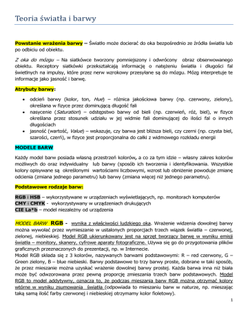 Teoria światła i barwy Powstanie wrażenia barwy – Światło może docierać do oka bezpośrednio ze źródła światła lub po odbiciu od obiektu. Z oka do mózgu – Na siatkówce tworzony pomniejszony i odwrócony obraz obserwowanego obiektu. Receptory siatkówki przekształcają informację o natężeniu światła i długości fal świetlnych na impulsy, które przez nerw wzrokowy przesyłane są do mózgu. Mózg interpretuje te informacje jako jasność i barwę. Atrybuty barwy: odcień barwy (kolor, ton, Hue) – różnica jakościowa barwy (np. czerwony, zielony), określana w fizyce przez dominującą długość fali nasycenie (Saturation) – odstępstwo barwy od bieli (np. czerwień, róż, biel), w fizyce określana przez stosunek udziału w jej widmie fali dominującej do ilości fal o innych długościach jasność (wartość, Value) – wskazuje, czy barwa jest bliższa bieli, czy czerni (np. czysta biel, szarości, czerń), w fizyce jest proporcjonalna do całki z widmowego rozkładu energii MODELE BARW Każdy model barw posiada własną przestrzeń kolorów, a co za tym idzie – własny zakres kolorów możliwych do oraz indywidualny lub barwy (sposób ich tworzenia i identyfikowania. Wszystkie kolory opisywane są określonymi wartościami liczbowymi, wzrost lub obniżenie powoduje zmianę odcienia (zmiana jednego parametru) lub barwy (zmiana więcej niż jednego parametru). Podstawowe rodzaje barw: RGB i HSB – wykorzystywane w urządzeniach wyświetlających, np. monitorach komputerów CMY i CMYK - wykorzystywany w urządzeniach drukujących CIE La*b – model niezależny od urządzenia MODEL BARW RGB - wynika z właściwości ludzkiego oka. Wrażenie widzenia dowolnej barwy można wywołać przez wymieszanie w ustalonych proporcjach trzech wiązek światła – czerwonej, zielonej, niebieskiej. Model RGB ukierunkowany jest na sprzęt tworzący barwę w wyniku emisji światła – monitory, skanery, cyfrowe aparaty fotograficzne. Używa się go do przygotowania plików graficznych przeznaczonych do prezentacji, np. w Internecie. Model RGB składa się z 3 kolorów, nazywanych barwami podstawowymi: R – red czerwony, G – Green zielony, B – blue niebieski. Barwy podstawowe to trzy barwy proste, dobrane w taki sposób, że przez mieszanie można uzyskać wrażenie dowolnej barwy prostej. Każda barwa inna niż biała może być odwzorowana przez pewną proporcję zmieszania trzech barw podstawowych. Model RGB to model addytywny, oznacza to, że podczas mieszania barw RGB można otrzymać kolory wtórne w wyniku zsumowania światła (odpowiada to mieszaniu barw w naturze, np. mieszając taką samą ilość farby czerwonej i niebieskiej otrzymamy kolor fioletowy). 1 Wartości liczbowe barw RGB są przedstawiane w skali od 0 do 255 (jeśli wybierzemy wartości trzech składowych po 255 to otrzymamy kolor biały, jeśli wybierzemy wartości trzech składowych po 0 to otrzymamy kolor czarny. Oznacza to, że im wyższe są wartości składowych tym jaśniejsza jest barwa). Każda z barw reprezentowana jest przez jeden bajt, zatem może przyjmować 256 wartości (bo 28=256). W rezultacie mieszając trzy barwy, możemy otrzymać 16 777 216 kolorów. Model HSB – zwany także modelem HSL lub HSV Punktem wyjścia jest percepcja kolorów u człowieka. W modelu HSB nie stosuje się mieszania kolorów składowych i jest on niezależny od urządzenia. Poszczególne atrybuty modelu HSB to: H – Hue – JASNOŚĆ – odcień lub inaczej ton barwy, określający potocznie kolor, niezależnie od czystości i jasności barwy. Zakres skali składowej obejmuje wszystkie kolory tęczy od czerwonego do fioletowego i wyrażany jest w stopniach od 0-360o S – Saturation – NASYCENIE – określa siłę koloru, bądź inaczej jego odległość od koloru szarego. Nasycenie mierzone jest w skali 0%-100% Wartość 0% ustawia odcień szarości dla koloru, a wartość 100% oznacza maksymalne nasycenie barwą. B – Brightness – JASNOŚĆ - określa udział bieli w danym kolorze. Jest ona mierzona w skali 0%-100% Wartość 0% tego atrybutu ustawia kolor czarny, a wartość 100% kolor biały (jasność może być opisana jako oddalenie od czerni, a zbliżenie do bieli, inaczej przyciemnienie lub rozjaśnienie). 2 Model CMY – to model substraktywnego mieszania barw, oparty o trzy podstawowe barwy proste: Cyan C (turkusowa) Magenta M (purpurowa) Yellow Y (żółta) Model CMY ukierunkowany jest na sprzęt drukujący: drukarki, maszyny drukarskie. Model CMYK – zawiera oprócz podstawowych barwy prostych Cyan C (turkusowa) Magenta M (purpurowa) Yellow Y (żółta) dodatkową barwę K – blacK (czarna) Farby czarnej używa się dla wydobycia głębi kolorów i podkreślenia kontrastów. Model CMYK jest powszechnie stosowany w urządzeniach drukujących, głównie w przemyśle poligraficznym. W oparciu o niego przygotowuje się pliki graficzne przeznaczone do druku. Wartości liczbowe barw w CMYK przedstawiane są w skali od 0-100 (jeśli weźmiemy maksymalne wartości wszystkich składowych kolorów to otrzymamy kolor czarny, natomiast wszystkie wartości minimalne spowodują kolor wynikowy biały, oznacza to, że im wyższe są wartości składowych, tym ciemniejsza barwa. Prawo Grassmana: Każdą dowolnie wybraną barwę można otrzymać za pomocą trzech niezależnych liniowo barw. Trzy barwy tworzą układ niezależnych liniowo barw, jeżeli dowolne zsumowanie dwóch z nich nie może dać barwy trzeciej. Między barwami RGB i CMY zachodzi szczególna współzależność. Każde dwie barwy jednego zestawu składają się (odpowiednio: addytywnie lub substraktywnie) na jedną z drugiego zestawu. W wyniku zmieszania farby żółtej (Y) z purpurową (M), otrzymamy czerwień taką jak światło czerwone R. Z kolei zmieszanie światła niebieskiego (B) z zielonym (G) da światło turkusowe, jak kolor Cyan (C). 3 Model CIE LA*B* (Lab, Lab Color) to teoretyczny model kolorów zawierający wsz