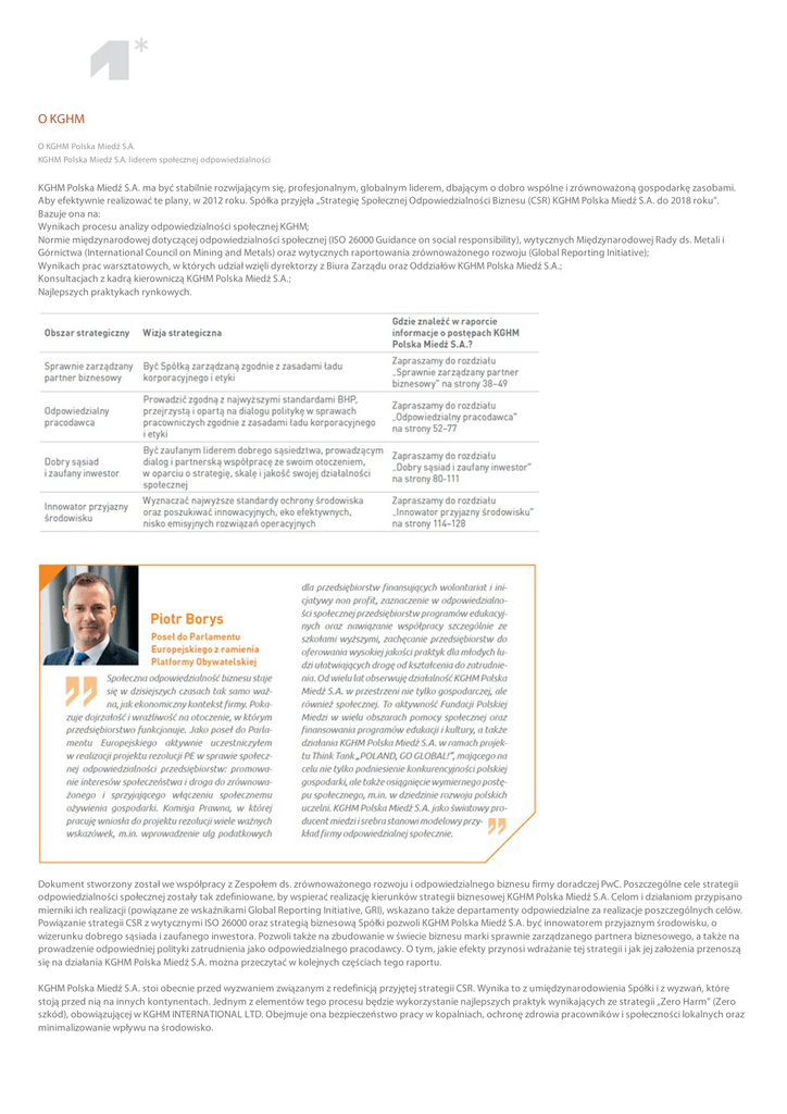 O KGHM O KGHM Polska Miedź S.A. KGHM Polska Miedź S.A. liderem społecznej odpowiedzialności KGHM Polska Miedź S.A. ma być stabilnie rozwijającym się, profesjonalnym, globalnym liderem, dbającym o dobro wspólne i zrównoważoną gospodarkę zasobami. Aby efektywnie realizować te plany, w 2012 roku. Spółka przyjęła „Strategię Społecznej Odpowiedzialności Biznesu (CSR) KGHM Polska Miedź S.A. do 2018 roku”. Bazuje ona na: Wynikach procesu analizy odpowiedzialności społecznej KGHM; Normie międzynarodowej dotyczącej odpowiedzialności społecznej (ISO 26000 Guidance on social responsibility), wytycznych Międzynarodowej Rady ds. Metali i Górnictwa (International Council on Mining and Metals) oraz wytycznych raportowania zrównoważonego rozwoju (Global Reporting Initiative); Wynikach prac warsztatowych, w których udział wzięli dyrektorzy z Biura Zarządu oraz Oddziałów KGHM Polska Miedź S.A.; Konsultacjach z kadrą kierowniczą KGHM Polska Miedź S.A.; Najlepszych praktykach rynkowych. Dokument stworzony został we współpracy z Zespołem ds. zrównoważonego rozwoju i odpowiedzialnego biznesu firmy doradczej PwC. Poszczególne cele strategii odpowiedzialności społecznej zostały tak zdefiniowane, by wspierać realizację kierunków strategii biznesowej KGHM Polska Miedź S.A. Celom i działaniom przypisano mierniki ich realizacji (powiązane ze wskaźnikami Global Reporting Initiative, GRI), wskazano także departamenty odpowiedzialne za realizacje poszczególnych celów. Powiązanie strategii CSR z wytycznymi ISO 26000 oraz strategią biznesową Spółki pozwoli KGHM Polska Miedź S.A. być innowatorem przyjaznym środowisku, o wizerunku dobrego sąsiada i zaufanego inwestora. Pozwoli także na zbudowanie w świecie biznesu marki sprawnie zarządzanego partnera biznesowego, a także na prowadzenie odpowiedniej polityki zatrudnienia jako odpowiedzialnego pracodawcy. O tym, jakie efekty przynosi wdrażanie tej strategii i jak jej założenia przenoszą się na działania KGHM Polska Miedź S.A. można przeczytać w kolejnych częściach tego raportu. KGHM Polska Miedź S.A. stoi obecnie przed wyzwaniem związanym z redefinicją przyjętej strategii CSR. Wynika to z umiędzynarodowienia Spółki i z wyzwań, które stoją przed nią na innych kontynentach. Jednym z elementów tego procesu będzie wykorzystanie najlepszych praktyk wynikających ze strategii „Zero Harm” (Zero szkód), obowiązującej w KGHM INTERNATIONAL LTD. Obejmuje ona bezpieczeństwo pracy w kopalniach, ochronę zdrowia pracowników i społeczności lokalnych oraz minimalizowanie wpływu na środowisko.
