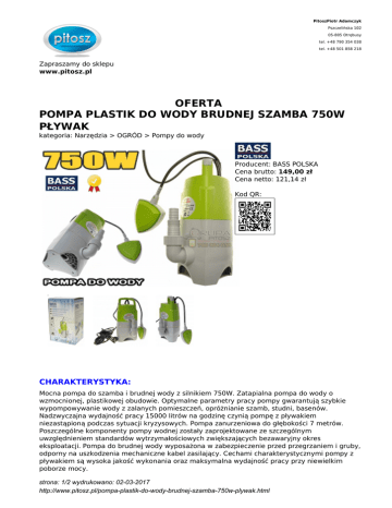 PitoszPiotr Adamczyk Pszczelińska 102 05-805 Otrębusy tel. +48 790 354 038 tel. +48 501 858 218 Zapraszamy do sklepu www.pitosz.pl OFERTA POMPA PLASTIK DO WODY BRUDNEJ SZAMBA 750W PŁYWAK kategoria: Narzędzia > OGRÓD > Pompy do wody Producent: BASS POLSKA Cena brutto: 149,00 zł Cena netto: 121,14 zł Kod QR: CHARAKTERYSTYKA: Mocna pompa do szamba i brudnej wody z silnikiem 750W. Zatapialna pompa do wody o wzmocnionej, plastikowej obudowie. Optymalne parametry pracy pompy gwarantują szybkie wypompowywanie wody z zalanych pomieszczeń, opróżnianie szamb, studni, basenów. Nadzwyczajna wydajność pracy 15000 litrów na godzinę czynią pompę z pływakiem niezastąpioną podczas sytuacji kryzysowych. Pompa zanurzeniowa do głębokości 7 metrów. Poszczególne komponenty pompy wodnej zostały zaprojektowane ze szczególnym uwzględnieniem standardów wytrzymałościowych zwiększających bezawaryjny okres eksploatacji. Pompa do brudnej wody wyposażona w zabezpieczenie przed przegrzaniem i gruby, odporny na uszkodzenia mechaniczne kabel zasilający. Cechami charakterystycznymi pompy z pływakiem są wysoka jakość wykonania oraz maksymalna wydajność pracy przy niewielkim poborze mocy. strona: 1/2 wydrukowano: 02-03-2017 http://www.pitosz.pl/pompa-plastik-do-wody-brudnej-szamba-750w-plywak.html DANE TECHNICZNE: Napięcie zasilające: 230V/50Hz Moc: 750W Wysokość podnoszenia wody: 13m Max. wydajność: 15000l/h Max zatapialność: 7m strona: 2/2 wydrukowano: 02-03-2017 http://www.pitosz.pl/pompa-plastik-do-wody-brudnej-szamba-750w-plywak.html