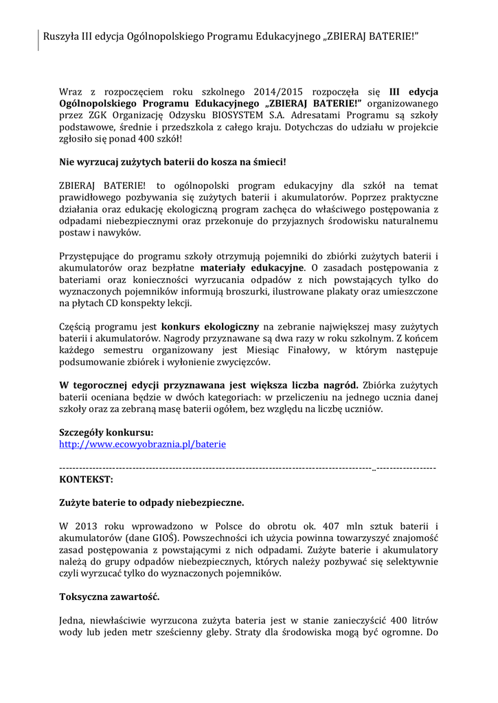 Ruszyła III edycja Ogólnopolskiego Programu Edukacyjnego „ZBIERAJ BATERIE!” Wraz z rozpoczęciem roku szkolnego 2014/2015 rozpoczęła się III edycja Ogólnopolskiego Programu Edukacyjnego „ZBIERAJ BATERIE!” organizowanego przez ZGK Organizację Odzysku BIOSYSTEM S.A. Adresatami Programu są szkoły podstawowe, średnie i przedszkola z całego kraju. Dotychczas do udziału w projekcie zgłosiło się ponad 400 szkół! Nie wyrzucaj zużytych baterii do kosza na śmieci! ZBIERAJ BATERIE! to ogólnopolski program edukacyjny dla szkół na temat prawidłowego pozbywania się zużytych baterii i akumulatorów. Poprzez praktyczne działania oraz edukację ekologiczną program zachęca do właściwego postępowania z odpadami niebezpiecznymi oraz przekonuje do przyjaznych środowisku naturalnemu postaw i nawyków. Przystępujące do programu szkoły otrzymują pojemniki do zbiórki zużytych baterii i akumulatorów oraz bezpłatne materiały edukacyjne. O zasadach postępowania z bateriami oraz konieczności wyrzucania odpadów z nich powstających tylko do wyznaczonych pojemników informują broszurki, ilustrowane plakaty oraz umieszczone na płytach CD konspekty lekcji. Częścią programu jest konkurs ekologiczny na zebranie największej masy zużytych baterii i akumulatorów. Nagrody przyznawane są dwa razy w roku szkolnym. Z końcem każdego semestru organizowany jest Miesiąc Finałowy, w którym następuje podsumowanie zbiórek i wyłonienie zwycięzców. W tegorocznej edycji przyznawana jest większa liczba nagród. Zbiórka zużytych baterii oceniana będzie w dwóch kategoriach: w przeliczeniu na jednego ucznia danej szkoły oraz za zebraną masę baterii ogółem, bez względu na liczbę uczniów. Szczegóły konkursu: http://www.ecowyobraznia.pl/baterie ----------------------------------------------------------------------------------------------..-----------------KONTEKST: Zużyte baterie to odpady niebezpieczne. W 2013 roku wprowadzono w Polsce do obrotu ok. 407 mln sztuk baterii i akumulatorów (dane GIOŚ). Powszechności ich użycia powinna towarzyszyć znajomość zasad postępowania z powstającymi z nich odpadami. Zużyte baterie i akumulatory należą do grupy odpadów niebezpiecznych, których należy pozbywać się selektywnie czyli wyrzucać tylko do wyznaczonych pojemników. Toksyczna zawartość. Jedna, niewłaściwie wyrzucona zużyta bateria jest w stanie zanieczyścić 400 litrów wody lub jeden metr sześcienny gleby. Straty dla środowiska mogą być ogromne. Do Ruszyła III edycja Ogólnopolskiego Programu Edukacyjnego „ZBIERAJ BATERIE!” produkcji baterii wykorzystuje się szereg substancji, w tym mocno toksycznych i szkodliwych dla organizmów żywych, takich jak ołów, rtęć, kadm czy nikiel. Wyrzucanie zużytych baterii do kosza na śmieci, kieruje te grupę odpadów na składowisko śmieci, na którym nie powinny znajdować się toksyczne substancje. Z uszkodzonej obudowy zalegającej na składowisku baterii, szkodliwe substancje przedostają się do gleby, wód powierzchniowych lub emitują toksyczne opary do atmosfery. ----------------------------------------------------------------------------------------------------------------ORGANIZATOR PROGRAMU „ZBIERAJ BATERIE!” Zakład Gospodarki Komunalnej Organizacja Odzysku BIOSYSTEM S.A. – firma z branży ochrony środowiska i gospodarki odpadami. Jedna z największych organizacji odzysku w Polsce, inwestująca również w przedsięwzięcia mające na celu wzrost świadomości ekologicznej konsumentów oraz promowanie zasad selektywnego pozbywania się odpadów. PARTNER GŁÓWNY: Biosystem S.A. – firma sprawująca m.in. nadzór właścicielski nad dwoma organizacjami odzysku wspierającymi przedsiębiorców w zakresie realizacji ustawowych obowiązków zbiórki, recyklingu i odzysku odpadów opakowaniowych, zużytych baterii oraz sprzętu elektrycznego i elektronicznego.