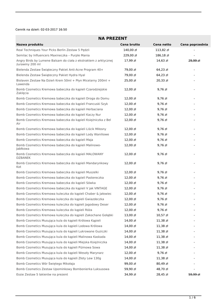Cennik na dzień: 02-03-2017 16:50 NA PREZENT Nazwa produktu Cena brutto Cena netto Cena poprzednia Real Techniques Your Picks Berlin Zestaw 5 Pędzli 140,00 zł 113,82 zł - Semilac by Influencers Maxineczka – Purple Mania 229,00 zł 186,18 zł - Angry Birds by Lumene Balsam do ciała z ekstraktem z arktycznej żurawiny 200 ml 17,99 zł 14,63 zł 29,99 zł Bielenda Zestaw Świąteczny Pakiet Anti-Acne Program 40+ 79,00 zł 64,23 zł - Bielenda Zestaw Świąteczny Pakiet Hydra Hyal 79,00 zł 64,23 zł - Biolaven Zestaw Na Dzień Krem 50ml + Płyn Micelarny 200ml + Lawenda 25,00 zł 20,33 zł - Bomb Cosmetics Kremowa babeczka do kąpieli Czarodziejskie Zaklęcia 12,00 zł 9,76 zł - Bomb Cosmetics Kremowa babeczka do kąpieli Droga do Domu 12,00 zł 9,76 zł - Bomb Cosmetics Kremowa babeczka do kąpieli Francuski Szyk 12,00 zł 9,76 zł - Bomb Cosmetics Kremowa babeczka do kąpieli Herbaciana 12,00 zł 9,76 zł - Bomb Cosmetics Kremowa babeczka do kąpieli Kaczy Nur 12,00 zł 9,76 zł - Bomb Cosmetics Kremowa babeczka do kąpieli Księżniczka z Bel Air 12,00 zł 9,76 zł - Bomb Cosmetics Kremowa babeczka do kąpieli Liścik Miłosny 12,00 zł 9,76 zł - Bomb Cosmetics Kremowa babeczka do kąpieli Lody Waniliowe 12,00 zł 9,76 zł - Bomb Cosmetics Kremowa babeczka do kąpieli Maja 12,00 zł 9,76 zł - Bomb Cosmetics Kremowa babeczka do kąpieli MalinowoJabłkowa 12,00 zł 9,76 zł - Bomb Cosmetics Kremowa babeczka do kąpieli MALOWANY DZBANEK 12,00 zł 9,76 zł - Bomb Cosmetics Kremowa babeczka do kąpieli Mandarynkowy Kot 12,00 zł 9,76 zł - Bomb Cosmetics Kremowa babeczka do kąpieli Muszelki 12,00 zł 9,76 zł - Bomb Cosmetics Kremowa babeczka do kąpieli Pastereczka 12,00 zł 9,76 zł - Bomb Cosmetics Kremowa babeczka do kąpieli Sówka 12,00 zł 9,76 zł - Bomb Cosmetics Kremowa babeczka do kąpieli V jak VINTAGE 12,00 zł 9,76 zł - Bomb Cosmetics Kremowa kuleczka do kąpieli Chaber & Jałowiec 12,00 zł 9,76 zł - Bomb Cosmetics Kremowa kuleczka do kąpieli Gwiazdeczka 12,00 zł 9,76 zł - Bomb Cosmetics Kremowa kuleczka do kąpieli Jagodowy Deser 12,00 zł 9,76 zł - Bomb Cosmetics Kremowa kuleczka do kąpieli Róża 12,00 zł 9,76 zł - Bomb Cosmetics Kremowa kuleczka do kąpieli Zakochane Gołąbki 13,00 zł 10,57 zł - Bomb Cosmetics Musująca kula do kąpieli Królowa Kąpieli 14,00 zł 11,38 zł - Bomb Cosmetics Musująca kula do kąpieli Lodowa Królowa 14,00 zł 11,38 zł - Bomb Cosmetics Musująca kula do kąpieli Lukrowane Guziczki 14,00 zł 11,38 zł - Bomb Cosmetics Musująca kula do kąpieli Malinowa Kaskada 14,00 zł 11,38 zł - Bomb Cosmetics Musująca kula do kąpieli Miejska Księżniczka 14,00 zł 11,38 zł - Bomb Cosmetics Musująca kula do kąpieli Piżmowa Sowa 14,00 zł 11,38 zł - Bomb Cosmetics Musująca kula do kąpieli Wesoły Marynarz 12,00 zł 9,76 zł - Bomb Cosmetics Musująca kula do kąpieli Złoty Lew 130g 14,00 zł 11,38 zł - Bomb Cosmetics Wór Świętego Mikołaja 99,00 zł 80,49 zł - Bomb Cosmetics Zestaw Upominkowy Bombonierka Luksusowa 59,90 zł 48,70 zł - Essie Zestaw 5 lakierów na prezent 34,99 zł 28,45 zł 59,99 zł 1/6 Gillette Fusion Proshield Maszynka Najnowsza 39,99 zł 32,51 zł 59,99 zł Gillette Fusion Proshield ostrza 4 sztuki 54,99 zł 44,71 zł 59,99 zł Gillette Mach 3 Maszynka z 1 strzem 16,99 zł 13,81 zł - Gillette Mach 3 Wkłady 8 ostrzy 56,99 zł 46,33 zł 79,99 zł Gillette Mach 3 zestaw maszynka 1 up + 8 ostrzy 71,99 zł 58,53 zł 79,99 zł Gillette Venus Breeze Spa Maszynka + 2 Ostrza 43,99 zł 35,76 zł 59,99 zł HELLO KITTY Płyn / Żel do kąpieli 400ml 9,99 zł 8,12 zł - HELLO KITTY SZAMPON I ŻEL DO KĄPIELI 300ml 8,99 zł 7,31 zł - Holika Holika Hand Mask Sheet - Nawilżająca Maseczka do Rąk 15,49 zł 12,59 zł - Indigo Arôme 99 balsam do ciała 100 ml 22,00 zł 17,89 zł - Indigo Arôme 99 balsam do ciała 300 ml 34,00 zł 27,64 zł - Indigo diamentowa baza do paznokci 10 ml 16,00 zł 13,01 zł - Indigo Egoista Balsam do ciała 300 ml 34,00 zł 27,64 zł - Indigo Egoista balsam do ciała 100 ml 22,00 zł 17,89 zł - Indigo Femme Fatale Balsam do ciała 300 ml 34,00 zł 27,64 zł - Indigo Indigolicious balsam do ciała 100ml 22,00 zł 17,89 zł - Indigo Indigolicious Balsam do ciała 300 ml 34,00 zł 27,64 zł - Indigo Krem do Rąk Pop Sugar 30 ml 15,00 zł 12,20 zł - Indigo lakier do paznokci Bad Red 10 ml 16,00 zł 13,01 zł - Indigo lakier do paznokci Bloody Mary 10 ml 16,00 zł 13,01 zł - Indigo lakier do paznokci Blue Bamboo 10 ml 16,00 zł 13,01 zł - Indigo lakier do paznokci Ciao Bella 10 ml 16,00 zł 13,01 zł - Indigo lakier do paznokci Elegance 10 ml 16,00 zł 13,01 zł - Indigo lakier do paznokci Fly High 10 ml 16,00 zł 13,01 zł - Indigo lakier do paznokci I'm Indigo 10 ml 16,00 zł 13,01 zł - Indigo lakier do paznokci I'm The Boss 10 ml 16,00 zł 13,01 zł - Indigo lakier do paznokci Jungle Trip 10 ml 16,00 zł 13,01 zł - Indigo lakier do paznokci Kiwi 10 ml 16,00 zł 13,01 zł - Indigo lakier do paznokci Lemon Ice 10 ml 16,00 zł 13,01 zł - Indigo lakier do paznokci Mango 10 ml 16,00 zł 13,01 zł - Indigo lakier do paznokci Mint & Soda 10 ml 16,00 zł 13,01 zł - Indigo lakier do paznokci Peach Tulip 10 ml 16,00 zł 13,01 zł - Indigo lakier do paznokci Summer Mint 10 ml 16,00 zł 13,01 zł - Indigo Olejek Arganowy Arôme 99 100 ml 34,00 zł 27,64 zł - Indigo Olejek Arganowy Bling-Bling Seventh Heaven ze złotymi drobinkami 100 ml 34,00 zł 27,64 zł - Indigo Olejek Arganowy Indigolicious 100 ml 34,00 zł 27,64 zł - Indigo Olejek Arganowy Pop Sugar 100 ml 34,00 zł 27,64 zł - Indigo Olejek Arganowy Seventh Heaven 100 ml 34,00 zł 27,64 zł - Indigo Olejek Arganowy Sunset Beach 100 ml 34,00 zł 27,64 zł - Indigo oliwka do skórek zapach Arome 99 8 ml 9,99 zł 8,12 zł - Indigo oliwka do skórek zapach Bella Vita 8 ml 9,99 zł 8,12 zł - Indigo oliwka do skórek zapach Egoista 8 ml 9,99 zł 8,12 zł - Indigo oliwka do skórek zapach Femme Fatale 8 ml 9,99 zł 8,12 zł - Indigo o