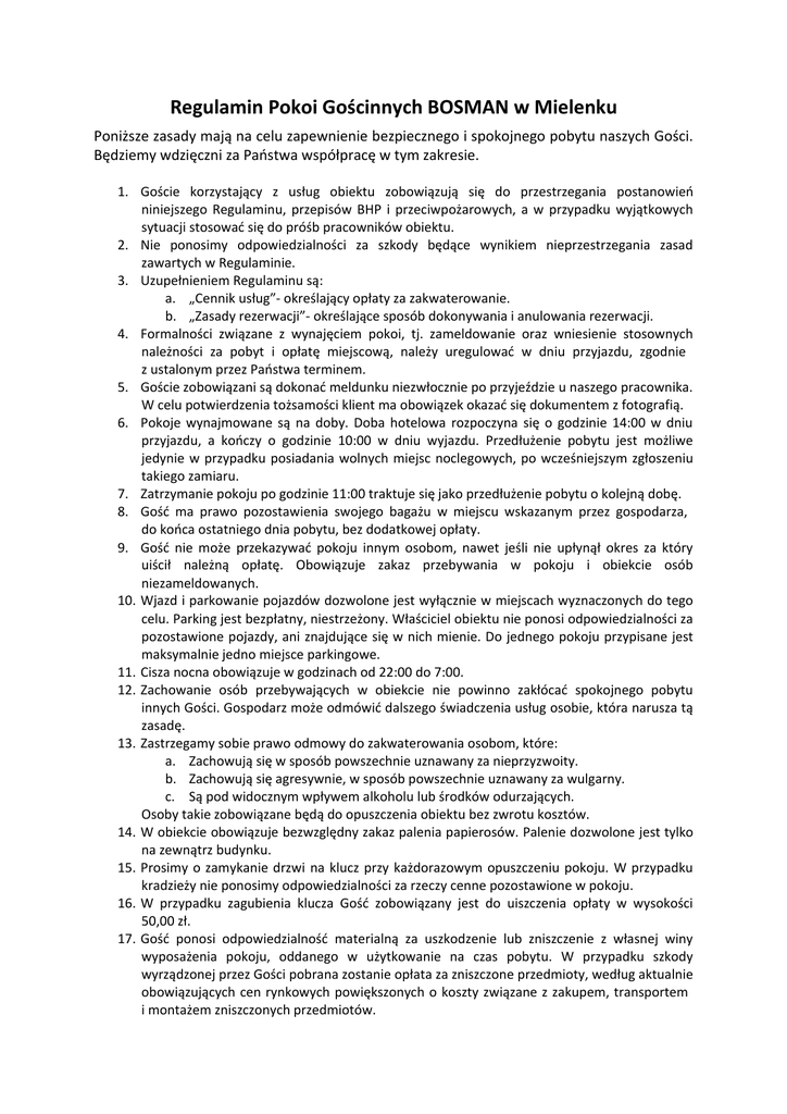 Regulamin Pokoi Gościnnych BOSMAN w Mielenku Poniższe zasady mają na celu zapewnienie bezpiecznego i spokojnego pobytu naszych Gości. Będziemy wdzięczni za Państwa współpracę w tym zakresie. 1. Goście korzystający z usług obiektu zobowiązują się do przestrzegania postanowień niniejszego Regulaminu, przepisów BHP i przeciwpożarowych, a w przypadku wyjątkowych sytuacji stosować się do próśb pracowników obiektu. 2. Nie ponosimy odpowiedzialności za szkody będące wynikiem nieprzestrzegania zasad zawartych w Regulaminie. 3. Uzupełnieniem Regulaminu są: a. „Cennik usług”- określający opłaty za zakwaterowanie. b. „Zasady rezerwacji”- określające sposób dokonywania i anulowania rezerwacji. 4. Formalności związane z wynajęciem pokoi, tj. zameldowanie oraz wniesienie stosownych należności za pobyt i opłatę miejscową, należy uregulować w dniu przyjazdu, zgodnie z ustalonym przez Państwa terminem. 5. Goście zobowiązani są dokonać meldunku niezwłocznie po przyjeździe u naszego pracownika. W celu potwierdzenia tożsamości klient ma obowiązek okazać się dokumentem z fotografią. 6. Pokoje wynajmowane są na doby. Doba hotelowa rozpoczyna się o godzinie 14:00 w dniu przyjazdu, a kończy o godzinie 10:00 w dniu wyjazdu. Przedłużenie pobytu jest możliwe jedynie w przypadku posiadania wolnych miejsc noclegowych, po wcześniejszym zgłoszeniu takiego zamiaru. 7. Zatrzymanie pokoju po godzinie 11:00 traktuje się jako przedłużenie pobytu o kolejną dobę. 8. Gość ma prawo pozostawienia swojego bagażu w miejscu wskazanym przez gospodarza, do końca ostatniego dnia pobytu, bez dodatkowej opłaty. 9. Gość nie może przekazywać pokoju innym osobom, nawet jeśli nie upłynął okres za który uiścił należną opłatę. Obowiązuje zakaz przebywania w pokoju i obiekcie osób niezameldowanych. 10. Wjazd i parkowanie pojazdów dozwolone jest wyłącznie w miejscach wyznaczonych do tego celu. Parking jest bezpłatny, niestrzeżony. Właściciel obiektu nie ponosi odpowiedzialności za pozostawione pojazdy, ani znajdujące się w nich mienie. Do jednego pokoju przypisane jest maksymalnie jedno miejsce parkingowe. 11. Cisza nocna obowiązuje w godzinach od 22:00 do 7:00. 12. Zachowanie osób przebywających w obiekcie nie powinno zakłócać spokojnego pobytu innych Gości. Gospodarz może odmówić dalszego świadczenia usług osobie, która narusza tą zasadę. 13. Zastrzegamy sobie prawo odmowy do zakwaterowania osobom, które: a. Zachowują się w sposób powszechnie uznawany za nieprzyzwoity. b. Zachowują się agresywnie, w sposób powszechnie uznawany za wulgarny. c. Są pod widocznym wpływem alkoholu lub środków odurzających. Osoby takie zobowiązane będą do opuszczenia obiektu bez zwrotu kosztów. 14. W obiekcie obowiązuje bezwzględny zakaz palenia papierosów. Palenie dozwolone jest tylko na zewnątrz budynku. 15. Prosimy o zamykanie drzwi na klucz przy każdorazowym opuszczeniu pokoju. W przypadku kradzieży nie ponosimy odpowiedzialności za rzeczy cenne pozostawione w pokoju. 16. W przypadku zagubienia klucza Gość zobowiązany jest do uiszczenia opłaty w wysokości 50,00 zł. 17. Gość ponosi odpowiedzialność materialną za uszkodzenie lub zniszczenie z własnej winy wyposażenia pokoju, oddanego w użytkowanie na czas pobytu. W przypadku szkody wyrządzonej przez Gości pobrana zostanie opłata za zniszczone przedmioty, według aktualnie obowiązujących cen rynkowych powiększonych o koszty związane z zakupem, transportem i montażem zniszczonych przedmiotów. 18. Ze względu na bezpieczeństwo przeciwpożarowe zabronione jest używanie w pokoju grzałek, żelazek, kuchenek elektrycznych i gazowych. 19. Żelazko udostępniane jest u gospodarza. Prosimy prasować tylko i wyłącznie w miejscu do tego wyznaczonym. 20. Z uwagi na to, że nie wchodzimy do pokoi w trakcie ich wynajmowania, prosimy o segregowanie i wyrzucanie śmieci w miejscu do tego wyznaczonym na zewnątrz obiektu. Woreczki na śmieci, odkurzacz, szczotki do zamiatania i środki czystości dostępne są u gospodarza. 21. Po zakończeniu pobytu pokój odbiera upoważniony przez gospodarza pracownik. 22. Obiekt nie jest przystosowany do przebywania zwierząt. 23. Regulamin podaje się do wiadomości poprzez zamieszczenie: a. Na stronie internetowej: www.bosman.mielno.pl b. W drodze indywidualnego zapoznania się przez klienta w trakcie czynności meldunkowych na tablicy informacyjnej. 24. Niniejszy Regulamin jest umową zawartą między stronami. Gość zgadza się z warunkami umowy w chwili wpłacenia zadatku lub w momencie zapłaty na miejscu całości należności, jeżeli zadatek nie był wymagany. 25. Regulamin zatwierdzony został przez właściciela oraz pracowników obiektu i obowiązuje od 1 maja 2012 roku. Życzymy miłego i spokojnego wypoczynku! Pokoje Gościnne Bosman Ireneusz Dębski, Mielenko, ul. Sosnowa 7, 76-032 Mielno