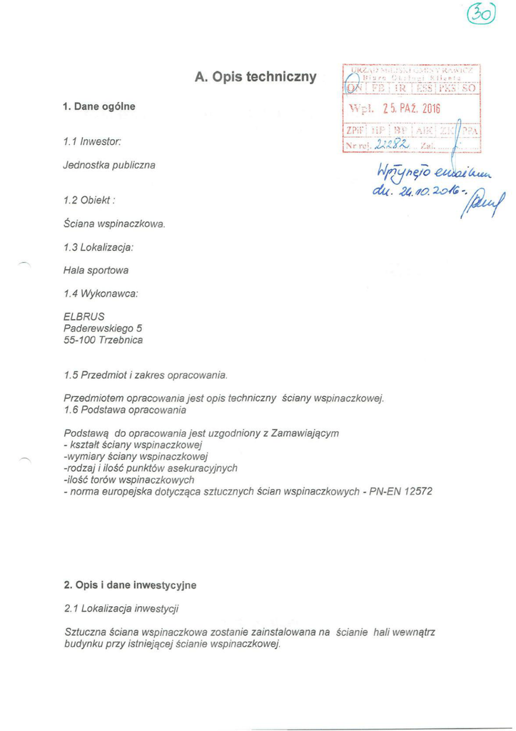 A. Opis techniczny 1. Dane ogólne 1. 1 Inwestor: Jednostka publiczna 1.2 Obiekt: Ściana wspinaczkowa. 1.3 Lokalizacja: Hala sportowa 1.4 Wykonawca : ELBRUS Paderewskiego 5 55-100 Trzebnica 1. 5 Przedmiot i zakres opracowania. Przedmiotem opracowania jest opis techniczny 1. 6 Podstawa opracowania ściany wspinaczkowej. Podstawą do opracowania jest uzgodniony z Zamawiającym - kształt ściany wspinaczkowej -wymiary ściany wspinaczkowej -rodzaj i ilość punktów asekuracyjnych -ilość torów wspinaczkowych - norma europejska dotycząca sztucznych ścian wspinaczkowych - PN-EN 12572 2. Opis i dane inwestycyjne 2. 1 Lokalizacja inwestycji Sztuczna ściana wspinaczkowa zostanie zainstalowana na budynku przy istniejącej ścianie wspinaczkowej. ścianie hali we wnątrz OPIS TECHNICZNY ściany wspinaczkowej . Gimnazjum w Sierakowie. Modernizacja i rozbud owa Zamawi aj ąc y : Wykonawca dokumentacji: ELBRUS Gimnazjum w Sierakowie , 63 -900 Rawicz, ul.Przyjemskiego35. Ul. Paderewskiego 5 55-100 Trzebnica www.elbrussport.pl [email protected] Tel. 508-508-804 "-../ Październik 2016 5.2 Serwis i badania kontrolne. Wykonawca zapewni serwis kontrolnych. urządzenia sportowego oraz będzie dokonywał badań 5.3 Atesty Wykonawca dostarczy : - projekt. - deklarację zgodności - instrukcję prawidłowego użytkowania ściany - kartę gwarancyjną do PN-EN 12572. i zasady serwisu oraz -protokół wspinaczkowej badań okresowych. z badań odbiorczych wykonywanych po pierwszym zainstalowaniu wspinaczkowej -tabliczka znamionowa 6. Wycena inwestycji. 150 OOO zł brutto ściany 2. 2 Opis konstrukcji ściany wspinaczkowej. Konstrukcję wsporczą bezpośrednio ściana dla paneli wspinaczkowych stanowi konstrukcja stalowa oraz budynku. 2. 3 Ogólna charakterystyka ściany. Obiekt ma charakter sporlowo - rekreacyjny. 2.4 Wyposażenie ściany A )Chwyty wspinaczkowe ( 2. 5 Powierzchnia więcej informacji patrz punkt 3) ściany. - formacje pionowe, przewieszone, połogie 2.6 Podstawowe wymiary ściany wspinaczkowej. - wysokość 1O m - szerokość podstawy 17 m - powierzchnia około 200 m2 2. 7 Punkty asekuracyjne Ściana posiada 12 tras wspinaczkowych przystosowanych do wspinaczki na II wędkę", W tym 10 tras wspinaczkowych z możliwością wspinaczki na prowadzeniu". - układ indywidua lnej asekuracji górnej : 12 szt. -punkty asekuracyjne: 70szt 11 3. Panele wspinaczkowe: ściany tworzą panele wspinaczkowe na bazie sklejki wodoodpornej o grubości 18 mm spełniające warunki normy : PN-EN 12572. Ilość gniązd na chwyty wspinaczkowe- 20 na m2. Ilość chwytów- 5 na 1 m2. Pokrycie 4. Sprzęt asekuracyjny. Podstawowy asekuracyjny dla 12 tras wspinaczkowych. 5. Gwarancje i atesty. 5.1 Gwarancja Wykonawca udzieli 24 miesięcznej gwarancji na produkt. ._/ Przykładowa I ' ,, . : ' , • • ... • realizacja : ••