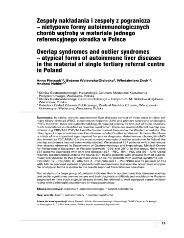 Zespoły nakładania i zespoły z pogranicza – nietypowe formy autoimmunologicznych chorób wątroby w materiale jednego referencyjnego ośrodka w Polsce Overlap syndromes and outlier syndromes – atypical forms of autoimmune liver diseases in the material of single tertiary referral centre in Poland Anna Pietrzak1,2, Bożena Walewska-Zielecka3, Włodzimierz Zych1,2, Andrzej Habior1,2 Klinika Gastroenterologii i Hepatologii, Centrum Medyczne Kształcenia Podyplomowego, Warszawa, Polska 2 Klinika Gastroenterologii, Centrum Onkologii – Instytut im. M. Skłodowskiej-Curie, Warszawa, Polska 3 Katedra i Zakład Zdrowia Publicznego, Wydział Nauki o Zdrowiu, Warszawski Uniwersytet Medyczny, Warszawa, Polska 1 Summary: In adults, chronic autoimmune liver diseases consist of three main entities: primary biliary cirrhosis (PBC), autoimmune hepatitis (AIH) and primary sclerosing cholangitis (PSC). However, there are patients fulfilling all required criteria for two out of three diseases. Such coincidence is classified as “overlap syndrome”. There are several different overlap syndromes, e.g. PBC/AIH, PSC/AIH and the former is most frequent in the Western countries. The other type of atypical autoimmune liver disease is called “outlier syndrome”. It means that there is a lack of one important sign required for proper diagnosis. Autoimmune cholangitis (AIC) also termed as PBC AMA (–) is the most common example of outlier syndrome. In Poland the overlap syndromes has not been widely studied. We analysed 737 patients with autoimmune liver disease observed in Department of Gastroenterology and Hepatology, Medical Centre for Postgraduate Education in Warsaw between 1995 and 2010. In this group, there were 657 patients diagnosed with only one disease (397 – PBC, 164 – PSC and 96 – AIH). Using recently recommended criteria we found 80 (10.8%) patients with atypical form of autoimmune liver disease. In this group there were 64 (8.7%) patients with overlap syndrome (35 – PBC/AIH, 17 – PSC/AIH, 9 – AIC/AIH, 2 – PSC/AIC and 1 – PSC/PBC) and 16 patients (2.1%) with AIC. In analysed material of patients with autoimmune diseases the occurrence and profile of atypical forms is similar to the results reported from Western countries. - Our analysis of a large group of patients indicates that in autoimmune liver diseases overlap and outlier syndromes are not so rare and their diagnosis is difficult and troublesome. Patients suspected to have such atypical disease should be referred to well equipped centre collaborating with pathologist experienced in hepatopathology. Słowa kluczowe: wątroba • autoimmunologia • zespół nakładania Adres do korespondecji: Anna Pietrzak, Klinika Gastroenterologii i Hepatologii CMKP Centrum Onkologii, ul. Roentgena 5, 02-781 Warszawa, Polska, e-mail: [email protected] - - - - Key words: liver • autoimmunity • overlap syndrome 25 Do przewlekłych chorób wątroby, w których etiopatogenezie istotną rolę odgrywają mechanizmy autoimmunologiczne należą trzy jednostki: autoimmunologiczne zapalenie wątroby (ang. autoimmune hepatitis, AIH), pierwotna żółciowa marskość wątroby (ang. primary biliary cirrhosis, PBC) i pierwotne stwardniające zapalenie dróg żółciowych (ang. primary sclerosing cholangitis, PSC). W populacji dorosłych autoimmunologiczne zapalenia stanowią niewielką część wszystkich przewlekłych chorób wątroby. W skali globalnej zapadalność na AIH wynosi 0,1–1,9/100 000/rok [1], a na PSC – 0,9–1,3/100 000/rok [2]. Zapadalność na PBC jest nieco wyższa i wskaźniki w poszczególnych krajach różnią się dość znacznie, wahając się od 0,33 do 3,1/100 000/rok [3]. Zapadalność na autoimmunologiczne choroby jest znacznie niższa od zapadalności na przewlekłe choroby wątroby wywołane zakażeniami wirusami hepatotropowymi (HBV, HCV) lub spowodowane toksycznym działaniem alkoholu etylowego. Choroby autoimmunologiczne są też znacznie rzadsze niż niealkoholowe stłuszczeniowe uszkodzenie wątroby, które w krajach rozwiniętych uznawane jest obecnie za najczęstszą przewlekłą chorobę wątroby. PBC rozpoznaje się na podstawie klinicznych i laboratoryjnych objawów cholestazy (zwiększona aktywność fosfatazy alkalicznej [FA] i gamma glutamylo-transpeptydazy [GGTP]) oraz na podstawie obecności autoprzeciwciał przeciw mitochondrialnych (ang. antimitochondrial autoantibody, AMA). Rozpoznanie winno być potwierdzone badaniem histopatologicznym punktatu wątroby [4–6]. PSC rozpoznaje się podobnie jak PBC – na podstawie obrazu klinicznego i badań laboratoryjnych wskazujących na cholestazę, ale rozstrzygające jest wykazanie w badaniach obrazowych (cholangiografia rezonansu magnetycznego [MRCP] lub endoskopowa cholangio-pankreatografia wsteczna [ECPW]) charakterystycznych nieprawidłowości w drogach żółciowych [6,7]. W przypadkach z obrazem klinicznym wskazującym na PSC, ale bez zmian w badaniach obrazowych, należy wykonać biopsję wątroby, ponieważ badanie histopatologiczne może rozstrzygnąć o rozpoznaniu „wewnątrzwątrobowego PSC” (ang. small ducts PSC). Jest to nietypowa forma PSC polegająca na wyłącznym zajęciu małych przewodzików żółciowych. Największe problemy diagnostyczne stwarza AIH. Choroba ta ma wyjątkowo zmienną symptomatologię i przebiega bez objawów patognomonicznych ani charakterystycznej konstelacji parametrów laboratoryjnych. Podstawowym elementem diagnostyki AIH jest wykluczenie innych chorób wywołujących podobne uszkodzenie wątroby. Sądzono, że rozpoznawanie AIH ułatwią kryteria diagnostyczne oparte na systemie punktowym opracowane przez światowych ekspertów (International Autoimmune Hepatitis Group, IAIHG) w 1993 roku [8]. Nie było to jednak narzędzie doskonałe i korzystano z niego głównie w badaniach naukowych, natomiast w praktyce klinicznej przydatność pierwszego systemu punktowego rozpoznawania AIH była ograniczona. W nas
