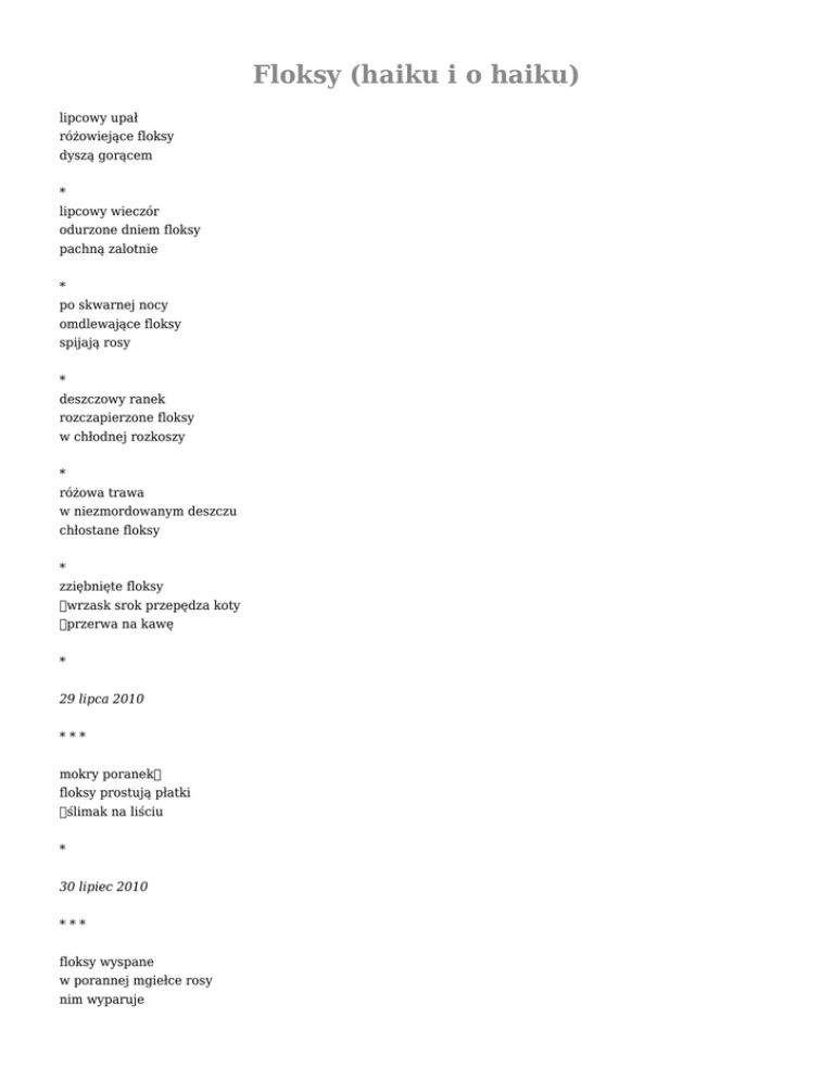 Floksy (haiku i o haiku) lipcowy upał różowiejące floksy dyszą gorącem * lipcowy wieczór odurzone dniem floksy pachną zalotnie * po skwarnej nocy omdlewające floksy spijają rosy * deszczowy ranek rozczapierzone floksy w chłodnej rozkoszy * różowa trawa w niezmordowanym deszczu chłostane floksy * zziębnięte floksy wrzask srok przepędza koty przerwa na kawę * 29 lipca 2010 *** mokry poranek floksy prostują płatki ślimak na liściu * 30 lipiec 2010 *** floksy wyspane w porannej mgiełce rosy nim wyparuje * w sierpniowym słońcu stary mur od garażu błysk białych floksów * fiołkowe floksy w powietrzu brzęczenie os pies się ogania * pachnące floksy pod koniec dnia upał wzrósł dziś nie popada * floksy i róża oszałamiająca woń pośród pszczół osa * 16 sierpnia 2013 * bieluśkie floksy schłostane nocnym deszczem wrześniowa klęska * 3 września 2013 *** HAIKU "Haiku nie jest wierszem, nie jest literaturą, jest to skinięcie, półotwarte drzwi, wytarcie lustra do czysta" mówi znawca haiku R. H. Blyth. A Czesław Miłosz, tłumacz haiku na polski (z angielskiego) dodaje: Żeby wytłumaczyć czym jest haiku, trzeba byłoby odtworzyć świato-ogląd towarzyszący jego pisaniu. Linia prowadzi od buddyzmu w Indiach do buddyzmu w Chinach i stamtąd do buddyzmu w Japonii. Zbiega się z nią linia wiodąca od chińskiego taoizmu do chińskiego Zen i japońskiego Zen. Nie każde haiku jest wyrazem medytacji Zen, a nawet zawsze odzywa się jego pochodzenie od igraszki słownej, ale mistrzowie Zen upodobali sobie jego paradoksalną zwięzłość i pokrewieństwa haiku z buddyzmem Zen są silne. Inna jeszcze linia wiodłaby od chińskiego konfucjanizmu i jego wpływów w Japonii. Tak więc w haiku zawarte są niejako wszystkie główne nurty myśli Wschodu o człowieku i świecie, a ta myśl, Indii, Chin, Japonii, ofiarowuje inne propozycje niż myśl zachodnia. (wprowadzenie do "Haiku", wydawnictwo Księgarnia Haiku, Kraków 2001) Haiku trafiło zatem do Japonii. I zadomowiło się. Czym jest więc haiku? W haiku chodzi o przekazanie pewnego ideału życia. Japońskiego mianowicie. Czyli nam, Europejczykom, obcego. "Hai" znaczy zabawa, gra, żart. Ktoś, kto nosi w sobie taki ideał, to "haijin", "człowiek hai", tak jak jest "chajin", "człowiek herbaty". Tak jak postawa "człowieka herbaty " odnosi się do "drogi herbaty" (rytuały obchodzenia się z herbatą), tak postawa "haijin" odnosi się do umiejętności życia w ideale "hai" i przekazywania tego. Te w 5-7-5 sylab ułożone słowa budzą w umyśle japońskim całą paletę skojarzeń opartych na długiej tradycji (jak w nas pisanka - głęboko w tył aż do pogaństwa włącznie). Nie budzą tego w nas, nawet jeśli wiemy o co chodzi, bo ktoś przetłumaczył, wytłumaczył itd. Nie znaczy to, że nie możemy tej formy "przetransponować" na naszą słyszalność. Możemy. I wielu poetów to robi. Tak jak Japończycy przejęli alfabet (znaki) chiński, dorobili do tego jeszcze dwa alfabety, już na swój użytek, i używają tak jak im pasuje. Chińczyk widząc napis japoński nie rozumie go, ale rozpoznaje w nim swoje znaki i stąd jest w stanie domyślić się o czym mowa. Tak nasze, europejskie "haiku" jest odległe od japońskiego oryginału. Coś jak dalekie echo, impresja. Nie chcę powiedzieć tu "siódma woda po kisielu" (przepraszam miłośników haiku) - to po prostu trochę inna sztuka poezji wywodząca się od haiku. W haiku nie musi być nic ujmującego, a obraz może składać się z samych li tylko oczywistości. Język wcale nie musi być niecodzienny, może być wręcz banalny, nastroju niezwykłego w naszym europejskim tego słowa znaczeniu też nie musi tworzyć. I jest tu jeszcze jedna trudność. W haiku nie tylko słowa mają znaczenie, ale także pismo. A ostatecznie obraz, znaczenie i dźwięk razem wzięte. Japończycy przejęli od Chińczyków jeszcze coś. Ideał "potrójnego mistrzostwa", "sanzetsu", jedność malarstwa, poezji i kaligrafii. Twórcy haiku dążyli do tej jedności. W każdym razie nie tylko umiejętność znalezienia odpowiednich słów i ułożenia w wiersz, ale również sztuka (za)pisania tego się liczy(ła). Artysta haiku ma wyrazić w słowach, piśmie i obrazie elegancką prostotę (prostą elegancję), fascynacje nieszkolonego, nie zepsutego przez coś sztucznego itd. Mamy więc kaligrafię, ale jest jeszcze problem języka jako takiego. Co dla Japończyka "sylaba", to dla nas też coś innego. W języku japońskim tworzy się sylaby w ten sposób: samogłoski a, i, u, e, o łączy się ze spółgłoskami k, s, t, n, h, m, r wg schematu: ka, ki, ku, ke, ko - y - tylko z a, - u - z o, - w - tylko z a. Do tego czasami można jakąś spółgłoskę podwoić, czasami dołączyć "n", same samogłoski są też sylabami. I to tyle. Z tych cegiełek buduje się słowa. Więc zabawa (hai) japońskimi sylabami jest zupełnie czymś innym dla ucha niż zabawa naszymi, indogermańskimi, sylabami. Przypomnijmy sobie parę przykładów: kimono, kawasaki, harakiri, kamika(d)ze, geisha, yamaha, sake, Tokio, sushi, toyota... itd. Dlatego jeżeli już "zachodnie" (europejskie, amerykańskie, polskie...) haiku, to czasami może nawet nie zgadzać się liczba sylab, bo idea hai stoi ponad to. haiku - gatunek sylabicznej poezji japońskiej, nierymowany, 17-zgłoskowy epigramat*, początkowo o treści komicznej (haikai), następnie lirycznej; uprawiany i popularny w Japonii do dziś, naśladowany w literaturze zachodniej, także polskiej. *epigramat - krótki, dowcipny utwór poetycki o zaskakującej puencie, zazwyczaj oparty na paradoksalnym koncepcie, często o charakterze satyrycznym. Trzeba by jeszcze wprowadzić pojęcie "mora", czyli "fonetyczno-czasowej głoski" w jęz. japońskim, co nie jest dokładnym odpowiednikiem naszej sylaby i tak dalej, i tym podobne... wymiana jednej głoski na inną powoduje zmiany w znaczeniu, a sztuka (= zabawa) polegała na tym, żeby