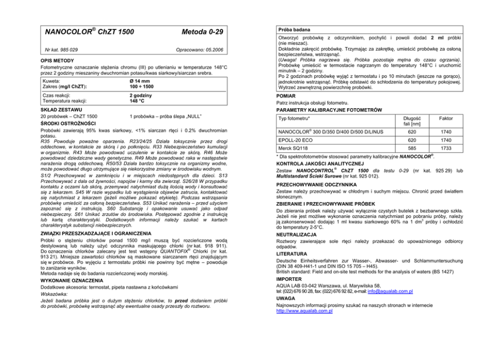 NANOCOLOR® ChZT 1500 Nr kat. 985 029 Metoda 0-29 Opracowano: 05.2006 OPIS METODY Fotometryczne oznaczanie stężenia chromu (III) po utlenianiu w temperaturze 148°C przez 2 godziny mieszaniny dwuchromian potasu/kwas siarkowy/siarczan srebra. Kuweta: Zakres (mg/l ChZT): Ø 14 mm 100 ÷ 1500 Czas reakcji: Temperatura reakcji: 2 godziny 148 °C SKŁAD ZESTAWU 20 probówek – ChZT 1500 Próba badana Otworzyć probówkę z odczynnikiem, pochylić i powoli dodać 2 ml próbki (nie mieszać). Dokładnie zakręcić probówkę. Trzymając za zakrętkę, umieścić probówkę za osłoną bezpieczeństwa, wstrząsnąć. (Uwaga! Próbka nagrzewa się. Próbka pozostaje mętna do czasu ogrzania). Probówkę umieścić w termostacie nagrzanym do temperatury 148°C i uruchomić minutnik – 2 godziny. Po 2 godzinach probówkę wyjąć z termostatu i po 10 minutach (jeszcze na gorąco), jednokrotnie wstrząsnąć. Próbkę odstawić do schłodzenia do temperatury pokojowej. Wytrzeć zewnętrzną powierzchnię probówki. POMIAR Patrz instrukcja obsługi fotometru. PARAMETRY KALIBRACYJNE FOTOMETRÓW 1 probówka – próba ślepa „NULL” ŚRODKI OSTROŻNOŚCI Probówki zawierają 95% kwas siarkowy, <1% siarczan rtęci i 0.2% dwuchromian potasu. R35 Powoduje poważne oparzenia. R23/24/25 Działa toksycznie przez drogi oddechowe, w kontakcie ze skórą i po połknięciu. R33 Niebezpieczeństwo kumulacji w organizmie. R43 Może powodować uczulenie w kontakcie ze skórą. R46 Może powodować dziedziczne wady genetyczne. R49 Może powodować raka w następstwie narażenia drogą oddechową. R50/53 Działa bardzo toksycznie na organizmy wodne, może powodować długo utrzymujące się niekorzystne zmiany w środowisku wodnym. S1/2 Przechowywać w zamknięciu i w miejscach niedostępnych dla dzieci. S13 Przechowywać z dala od żywności, napojów i karmy dla zwierząt. S26/28 W przypadku kontaktu z oczami lub skórą, przemywać natychmiast dużą ilością wody i konsultować się z lekarzem. S45 W razie wypadku lub wystąpienia objawów zatrucia, kontaktować się natychmiast z lekarzem (jeżeli możliwe pokazać etykietę). Podczas wstrząsania probówkę umieścić za osłoną bezpieczeństwa. S53 Unikać narażenia – przed użyciem zapoznać się z instrukcją. S60 Substancję i opakowanie usuwać jako odpad niebezpieczny. S61 Unikać zrzutów do środowiska. Postępować zgodnie z instrukcją lub kartą charakterystyki. Dodatkowych informacji należy szukać w kartach charakterystyk substancji niebezpiecznych. Typ fotometru* ® NANOCOLOR 300 D/350 D/400 D/500 D/LINUS Długość fali [nm] Faktor 620 1740 EPOLL-20 ECO 620 1740 Merck SQ118 585 1733 ® * Dla spektrofotometrów stosować parametry kalibracyjne NANOCOLOR . KONTROLA JAKOŚCI ANALITYCZNEJ ® Zestaw NANOCONTROL ChZT 1500 dla testu 0-29 (nr kat. 925 29) lub Multistandard Ścieki Surowe (nr kat. 925 012). PRZECHOWYWANIE ODCZYNNIKA Zestaw należy przechowywać w chłodnym i suchym miejscu. Chronić przed światłem słonecznym. ZBIERANIE I PRZECHOWYWANIE PRÓBEK Do zbierania próbek należy używać wyłącznie czystych butelek z bezbarwnego szkła. Jeżeli nie jest możliwe wykonanie oznaczenia natychmiast po pobraniu próby, należy 3 ją zakonserwować dodając 1 ml kwasu siarkowego 60% na 1 dm próby i ochłodzić do temperatury 2-5°C. ZWIĄZKI PRZESZKADZAJĄCE I OGRANICZENIA Próbki o stężeniu chlorków ponad 1500 mg/l muszą być rozcieńczone wodą destylowaną lub należy użyć odczynnika maskującego chlorki (nr kat. 918 911). ® Do oznaczenia chlorków zalecany jest test wstępny QUANTOFIX Chlorki (nr kat. 913 21). Mniejsze zawartości chlorków są maskowane siarczanem rtęci znajdującym się w probówce. Po wyjęciu z termostatu próbki nie powinny być mętne – powoduje to zaniżanie wyników. Metoda nadaje się do badania rozcieńczonej wody morskiej. NEUTRALIZACJA Roztwory zawierające sole rtęci należy przekazać do upoważnionego odbiorcy odpadów. WYKONANIE OZNACZENIA Dodatkowe akcesoria: termostat, pipeta nastawna z końcówkami Wskazówka: Jeżeli badana próbka jest o dużym stężeniu chlorków, to przed dodaniem próbki do probówki, probówkę wstrząsnąć aby ewentualne osady przeszły do roztworu. IMPORTER AQUA LAB 03-042 Warszawa, ul. Marywilska 58, tel: (022) 676 90 28, fax: (022) 676 92 82, e-mail: [email protected] LITERATURA Deutsche Einheitsverfahren zur Wasser-, Abwasser- und Schlammuntersuchung (DIN 38 409-H41-1 und DIN ISO 15 705 – H45). British standard: Field and on-site test methods for the analysis of waters (BS 1427) UWAGA Najnowszych informacji prosimy szukać na naszych stronach w internecie http://www.aqualab.com.pl