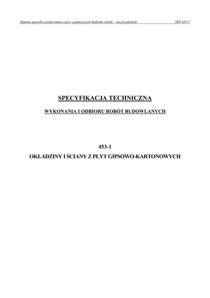 Zmiana sposobu uŜytkowania części pomieszczeń budynku szkoły – na przedszkole SST 453-1 SPECYFIKACJA TECHNICZNA WYKONANIA I ODBIORU ROBÓT BUDOWLANYCH 453-1 OKŁADZINY I ŚCIANY Z PŁYT GIPSOWO-KARTONOWYCH Zmiana sposobu uŜytkowania części pomieszczeń budynku szkoły – na przedszkole SST 453-1 SPIS TREŚCI 1. WSTĘP..........................................................................................................................................95 1.1. Przedmiot SST ........................................................................................................................95 1.2. Zakres stosowania SST ...........................................................................................................95 1.3. Określenia podstawowe ..........................................................................................................95 1.4. Zakres robót objętych SST......................................................................................................95 1.5. Ogólne wymagania dotyczące robót .......................................................................................95 2. MATERIAŁY...............................................................................................................................96 2.1. Wymagania ogólne .................................................................................................................96 2.2. Materiały potrzebne do wykonania robót ...............................................................................96 3. SPRZĘT ........................................................................................................................................98 3.1. Wymagania ogólne .................................................................................................................98 3.2. Sprzęt do wykonywania robót.................................................................................................98 4. TRANSPORT ...............................................................................................................................98 4.1. Wymagania ogólne .................................................................................................................98 4.2. Transport materiałów ..............................................................................................................98 4.3. Przechowywanie i składowanie materiałów ...........................................................................98 5. WYKONANIE ROBÓT ..............................................................................................................99 5.1. Wymagania ogólne .................................................................................................................99 5.2. Warunki przystąpienia do robót..............................................................................................99 5.3. MontaŜ okładzin z płyt gipsowo-kartonowych na ścianach na ruszcie ..................................99 5.4. Tyczenie rozmieszczenia płyt .................................................................................................99 5.5. Okładziny z płyt gipsowo-kartonowych ...............................................................................100 5.6. Szpachlowanie spoin.............................................................................................................100 6. KONTROLA JAKOŚCI ROBÓT ............................................................................................101 6.1. Wymagania ogólne ...............................................................................................................101 6.2. Badania w czasie wykonywania robót ..................................................................................101 7. OBMIAR ROBÓT .....................................................................................................................101 8. ODBIÓR ROBÓT ......................................................................................................................101 8.1. Ogólne zasady odbioru robót. ...............................................................................................101 8.2. Odbiór podłoŜy .....................................................................................................................101 8.3. Zgodność z dokumentacją.....................................................................................................101 8.4. Wymagania przy odbiorze ....................................................................................................102 9. PODSTAWA PŁATNOŚCI ......................................................................................................102 10. PRZEPISY ZWIĄZANE.........................................................................................................102 94 Zmiana sposobu uŜytkowania części pomieszczeń budynku szkoły – na przedszkole 453. SST 453-1 ROBOTY WYKOŃCZENIOWE 453-1 OKŁADZINY Z PŁYT GIPSOWO-KARTONOWYCH 1. WSTĘP 1.1. Przedmiot SST Przedmiotem niniejszej szczegółowej specyfikacji technicznej są wymagania dotyczące wykonania i odbioru okładzin, sufitów podwieszanych i ścian z płyt gipsowo-kartonowych w związku ze zmianą sposobu uŜytkowania części pomieszczeń na parterze budynku Szkoły Podstawowej nr 9 przy ul. Chemicznej 9 w Inowrocławiu na przedszkole. Klasyfikacja wg Wspólnego Słownika Zamówień (CPV) Grupa Klasa Kategoria 45400000-1 Opis Roboty wykończeniowe budowlanych. 45410000-4 w zakresie obiektów Tynkowanie. 1.2. Zakres stosowania SST Szczegółowa specyfikacja techniczna jest stosowana jako dokument przetargowy i kontraktowy przy zlecaniu i realizacji robót wymienionych w pkt. 1.1. 1.3. Określenia podstawowe Określenia i nazewnictwo uŜyte w niniejszej specyfikacji technicznej ST są zgodne z obowiązującymi podanymi w normach PN i przepisach Prawa budow