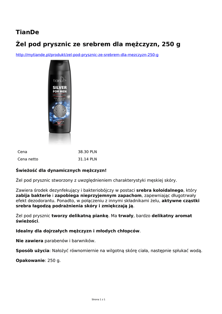 TianDe Żel pod prysznic ze srebrem dla mężczyzn, 250 g http://mytiande.pl/produkt/zel-pod-prysznic-ze-srebrem-dla-mezczyzn-250-g Cena 38.30 PLN Cena netto 31.14 PLN Świeżość dla dynamicznych mężczyzn! Żel pod prysznic stworzony z uwzględnieniem charakterystyki męskiej skóry. Zawiera środek dezynfekujący i bakteriobójczy w postaci srebra koloidalnego, który zabija bakterie i zapobiega nieprzyjemnym zapachom, zapewniając długotrwały efekt dezodorantu. Ponadto, w połączeniu z innymi składnikami żelu, aktywne cząstki srebra łagodzą podrażnienia skóry i zmiękczają ją. Żel pod prysznic tworzy delikatną piankę. Ma trwały, bardzo delikatny aromat świeżości. Idealny dla dojrzałych mężczyzn i młodych chłopców. Nie zawiera parabenów i barwników. Sposób użycia: Nałożyć równomiernie na wilgotną skórę ciała, następnie spłukać wodą. Opakowanie: 250 g. Strona 1 z 1 Powered by TCPDF (www.tcpdf.org)