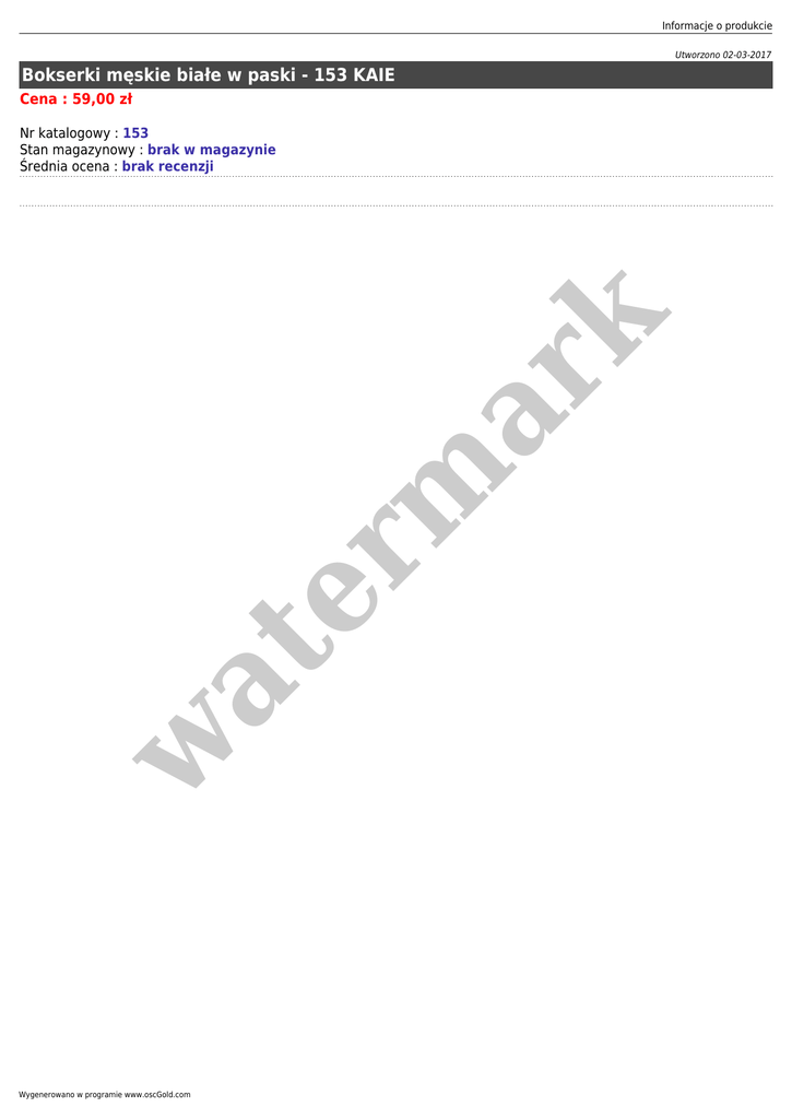 Informacje o produkcie Utworzono 02-03-2017 Bokserki męskie białe w paski - 153 KAIE Cena : 59,00 zł w at er m ar k Nr katalogowy : 153 Stan magazynowy : brak w magazynie Średnia ocena : brak recenzji Wygenerowano w programie www.oscGold.com