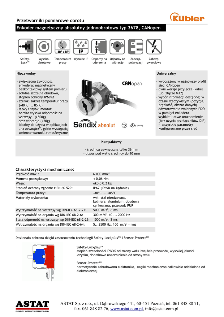 Przetworniki pomiarowe obrotu Enkoder magnetyczny absolutny jednoobrotowy typ 3678, CANopen SafetyLockTM Wysokoobrotowe Temperatura Wysokie IP pracy Odporny na Odporny na uderzenia wibracje Zabezp. polaryzacji Zabezp. zwarciowe Niezawodny Uniwersalny - zwiększona żywotność enkodera: magnetyczny bezkontaktowy system pomiaru - solidna szczelna obudowa, stopień ochrony IP69K! - szeroki zakres temperatur pracy (-40°C ... 85°C) - łatwy i szybki montaż - bardzo wysoka odporność na wstrząsy (>500g) oraz wibracje (>30g) - idealny do użycia w aplikacjach „na zewnątrz”, gdzie występują zmienne warunki atmosferyczne - wyposażony w najnowszy profil sieci CANopen - dwie wersje przyłącza (kabel lub złącze M12) - wybór informacji dostępnej w czasie rzeczywistym (pozycja, prędkość, obszar danych) - odwzorowanie zmiennych PDO w pamięci enkodera - szybkie i łatwe uruchomienie (bez użycia przełączników DIP) – wszystkie parametry konfigurowane przez sieć Kompaktowy - średnica zewnętrzna tylko 36 mm - otwór pod wał o średnicy do 10 mm Charakterystyki mechaniczne: Prędkość max.: Moment początkowy: Waga: Stopień ochrony zgodnie z EN 60 529: Temperatura pracy: Materiały wykonania: Wytrzymałość na wstrząsy wg DIN-IEC 68-2-27: Wytrzymałość na drgania wg DIN-IEC 68-2-6: Stała odporność na wstrząsy wg DIN-IEC 68-2-29: Wytrzymałość na drgania wg DIN-IEC 68-2-64: 6 000 min-1 < 0,06 Nm około 0,2 kg IP67 (IP69K na żądanie) -40°C ... +85°C wał: stal nierdzewna, kołnierz: aluminium, obudowa cynkowana, przewód: PUR 5000 m/s2, 6 ms 300 m/s2, 10 ... 2000 Hz 1000 m/s2, 2 ms 5...2500 Hz, 100 m/s2 - rms Doskonała ochrona dzięki zastosowaniu technologii Safety-Lockplus™ i Sensor-Protect™ Safety-Lockplus™ stopień szczelności IP69K od strony wału i wejścia przewodu, wysokiej jakości łożyska, dodatkowe uszczelnienie od strony wału Sensor-Protect™ hermetycznie zabudowana elektronika, część mechaniczna całkowicie oddzielona od elektronicznej ASTAT Sp. z o.o., ul. Dąbrowskiego 441, 60-451 Poznań, tel. 061 848 88 71, fax. 061 848 82 76, www.astat.com.pl, [email protected] Przetworniki pomiarowe obrotu Enkoder magnetyczny absolutny jednoobrotowy typ 3678, CANopen Charakterystyki elektryczne: Ogólna charakterystyka interfejsu CANopen: Ochrona przed zamianą biegunów zasilania: tak Zgodność z normami CE: EN 61000-6-1, EN 61000-6-4, EN 61000-6-3 Zakres pomiarowy: 360º Liniowość: < 1º Powtarzalność: < 0,1º Częstotliwość odświeżania: 400 µs Kod: Interfejs: Napięcie zasilania: 8 ... 30 VDC Pobór prądu (bez obciążenia): max. 25 mA (24 VDC) Dioda diagnostyczna LED (czerwona / zielona) Detekcja błędów: Wskaźnik statusu: LED czerwona LED zielona Rozdzielczość: skalowalna 1 ... 16384 (14 bitów), ustawienie fabryczne 16384 (14 bitów) binarny CAN High-Speed zgodnie z ISO11898, Basic- i Full-CAN Specyfikacja CAN 2.0 B Protokół: CANopen profil DS406 V3.1 ze specyfikacją oryginalną i dodatkową Usługa LSS DS305 V2.0 Prędkość transmisji: Adres: Funkcja terminatora: Usługa LSS 10 ... 1000 kbit/s (programowalna) 1 ... 127 (programowalny) programowalna protokół CIA LSS DS305 V2.0 Ogólne informacje na temat sieci CANopen: Profil komunikacyjny CANopen V3.1 Enkodery serii 3658 posiadają zaimplementowany najnowszy profil komunikacji sieci CANopen zgodnie z DS 301 V4.02. Dostępny jest również profil enkoderowy DS 406 V3.1. Mogą zostać wybrane następujące tryby pracy: odpytywania, okresowy (cykliczny, pierścieniowy), synchroniczny. Współczynnik skalowania, wartość nastawna, wartości graniczne i wiele innych dodatkowych parametrów można zaprogramować przez sieć CAN-Bus. Enkoder posiada pamięć EEPROM co pozwala zachować wszystkie zaprogramowane dane w przypadku np. awarii zasilania. Po zaniku napięcia zasilania wszystkie dane ładowane są z pamięci EEPROM. Poniższe wartości wyjściowe enkodera mogą być zmiennymi w kanale komunikacji PDO: pozycja, prędkość, przyspieszenie; podobnie jak status pracy enkodera. Poprzez sieć można zaprogramować adres urządzenia oraz prędkość transmisji. Enkodery serii 3658 posiadają układ nadzorujący typu „Watchdog”. Poniższe parametry mogą być programowane: - tryb zdarzeń - jednostka prędkości (kroki/s, obr./min) - współczynnik skalowania - 2 wartości graniczne (górna i dolna) - zmienne kanału PDO: pozycja, prędkość, przyspieszenie - linie błędów (błąd czujnika optycznego, przekroczenie temperatury i inne) - zachowanie się diody LED z tyłu obudowy Profil komunikacyjny CANopen V4.02: - NMT Slave - Protokół Heartbeat - High resolution Sync Protocol - Error Behaviour Object ASTAT Sp. z o.o., ul. Dąbrowskiego 441, 60-451 Poznań, tel. 061 848 88 71, fax. 061 848 82 76, www.astat.com.pl, [email protected] Przetworniki pomiarowe obrotu Enkoder magnetyczny absolutny jednoobrotowy typ 3678, CANopen Wymiary: Kołnierz o średnicy 36 mm, mocowanie z trzpieniem stopującym Kołnierz o średnicy 36 mm, mocowanie ze sprzęgłem stojana ASTAT Sp. z o.o., ul. Dąbrowskiego 441, 60-451 Poznań, tel. 061 848 88 71, fax. 061 848 82 76, www.astat.com.pl, [email protected] Przetworniki pomiarowe obrotu Enkoder magnetyczny absolutny jednoobrotowy typ 3678, CANopen Oznaczenia i przyporządkowanie sygnałów: Sygnał: +Ub 0V CAN GND CAN High CAN Low Nr pinu złącza M12: 2 3 1 4 5 Kolor: BN (brązowy) WH (biały) GY (szary) GN (zielony) YE (żółty) Kod zamówienia: 8.3678.XXXX.21XX Typ Opcje dodatkowe 1 1 = IP67 (IP69K na żądanie) Kołnierz 2 = mocowanie z trzpieniem stopującym 5 = mocowanie ze sprzęgłem stojana Otwór pod wał 2 = Ø 6 mm 3 = Ø 6,35 mm (1/4'') 4 = Ø 8 mm 6 = Ø 10 mm Opcje dodatkowe 2 1 = standard Profil sieci 21 = CANopen DS406 V3.1 Przyłącze 2 = kabel PUR 1 m, promieniowo 4 = złącze M12, promieniowo Układ wyjścia / Napięcie zasilania C = CANopen DS301 V4.02 / 8..30 VDC Preferowane przez producenta typy zostały wytłu