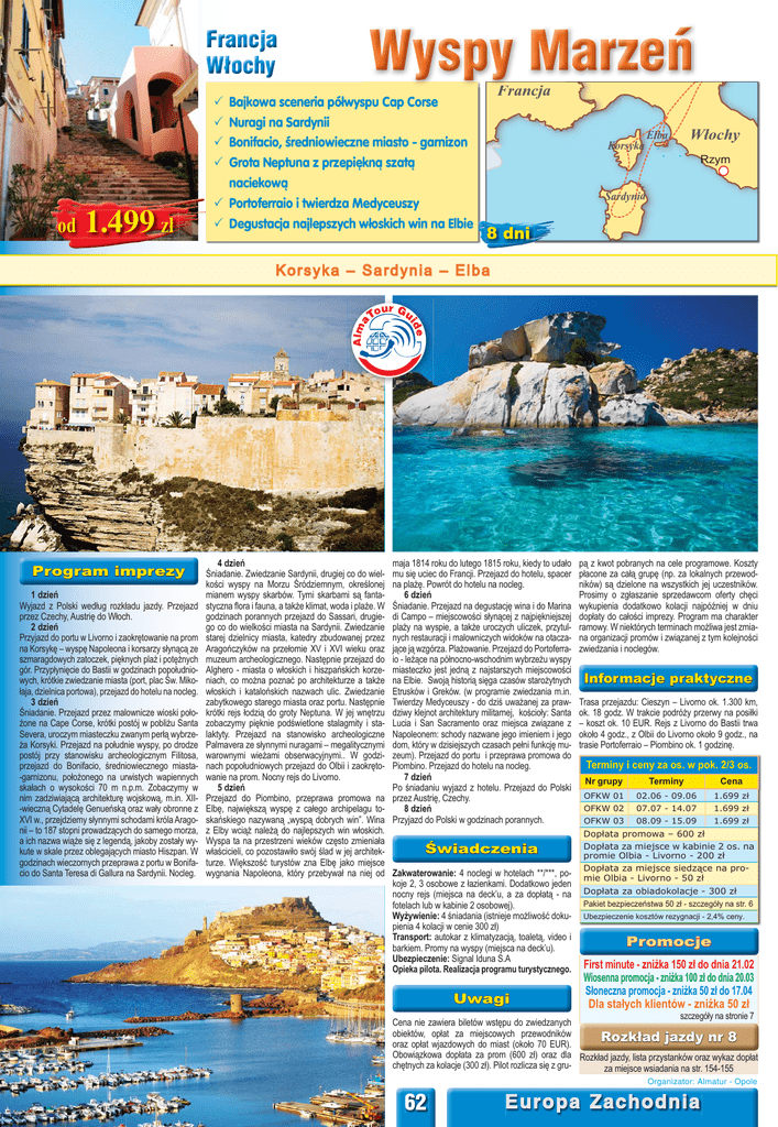 Wyspy Marzeń j Francja F od 1.499 zł Bajkowa sceneria półwyspu Cap Corse Nuragi na Sardynii Bonifacio, średniowieczne miasto - garnizon Grota Neptuna z przepiękną szatą naciekową Portoferraio i twierdza Medyceuszy Degustacja najlepszych włoskich win na Elbie Korsyka Elba Włochy Rzym Sardynia 8 dni Korsyka – Sardynia – Elba Program imprezy 1 dzień Wyjazd z Polski według rozkładu jazdy. Przejazd przez Czechy, Austrię do Włoch. 2 dzień Przyjazd do portu w Livorno i zaokrętowanie na prom na Korsykę – wyspę Napoleona i korsarzy słynącą ze szmaragdowych zatoczek, pięknych plaż i potężnych gór. Przypłynięcie do Bastii w godzinach popołudniowych, krótkie zwiedzanie miasta (port, plac Św. Mikołaja, dzielnica portowa), przejazd do hotelu na nocleg. 3 dzień Śniadanie. Przejazd przez malownicze wioski położone na Cape Corse, krótki postój w pobliżu Santa Severa, uroczym miasteczku zwanym perłą wybrzeża Korsyki. Przejazd na południe wyspy, po drodze postój przy stanowisku archeologicznym Filitosa, przejazd do Bonifacio, średniowiecznego miasta-garnizonu, położonego na urwistych wapiennych skałach o wysokości 70 m n.p.m. Zobaczymy w nim zadziwiającą architekturę wojskową, m.in. XII-wieczną Cytadelę Genueńską oraz wały obronne z XVI w., przejdziemy słynnymi schodami króla Aragonii – to 187 stopni prowadzących do samego morza, a ich nazwa wiąże się z legendą, jakoby zostały wykute w skale przez oblegających miasto Hiszpan. W godzinach wieczornych przeprawa z portu w Bonifacio do Santa Teresa di Gallura na Sardynii. Nocleg. 4 dzień Śniadanie. Zwiedzanie Sardynii, drugiej co do wielkości wyspy na Morzu Śródziemnym, określonej mianem wyspy skarbów. Tymi skarbami są fantastyczna flora i fauna, a także klimat, woda i plaże. W godzinach porannych przejazd do Sassari, drugiego co do wielkości miasta na Sardynii. Zwiedzanie starej dzielnicy miasta, katedry zbudowanej przez Aragończyków na przełomie XV i XVI wieku oraz muzeum archeologicznego. Następnie przejazd do Alghero - miasta o włoskich i hiszpańskich korzeniach, co można poznać po architekturze a także włoskich i katalońskich nazwach ulic. Zwiedzanie zabytkowego starego miasta oraz portu. Następnie krótki rejs łodzią do groty Neptuna. W jej wnętrzu zobaczymy pięknie podświetlone stalagmity i stalaktyty. Przejazd na stanowisko archeologiczne Palmavera ze słynnymi nuragami – megalitycznymi warownymi wieżami obserwacyjnymi.. W godzinach popołudniowych przejazd do Olbii i zaokrętowanie na prom. Nocny rejs do Livorno. 5 dzień Przejazd do Piombino, przeprawa promowa na Elbę, największą wyspę z całego archipelagu toskańskiego nazywaną „wyspą dobrych win”. Wina z Elby wciąż należą do najlepszych win włoskich. Wyspa ta na przestrzeni wieków często zmieniała właścicieli, co pozostawiło swój ślad w jej architekturze. Większość turystów zna Elbę jako miejsce wygnania Napoleona, który przebywał na niej od maja 1814 roku do lutego 1815 roku, kiedy to udało mu się uciec do Francji. Przejazd do hotelu, spacer na plażę. Powrót do hotelu na nocleg. 6 dzień Śniadanie. Przejazd na degustację wina i do Marina di Campo – miejscowości słynącej z najpiękniejszej plaży na wyspie, a także uroczych uliczek, przytulnych restauracji i malowniczych widoków na otaczające ją wzgórza. Plażowanie. Przejazd do Portoferraio - leżące na północno-wschodnim wybrzeżu wyspy miasteczko jest jedną z najstarszych miejscowości na Elbie. Swoją historią sięga czasów starożytnych Etrusków i Greków. (w programie zwiedzania m.in. Twierdzy Medyceuszy - do dziś uważanej za prawdziwy klejnot architektury militarnej, kościoły: Santa Lucia i San Sacramento oraz miejsca związane z Napoleonem: schody nazwane jego imieniem i jego dom, który w dzisiejszych czasach pełni funkcję muzeum). Przejazd do portu i przeprawa promowa do Piombino. Przejazd do hotelu na nocleg. 7 dzień Po śniadaniu wyjazd z hotelu. Przejazd do Polski przez Austrię, Czechy. 8 dzień Przyjazd do Polski w godzinach porannych. Świadczenia Zakwaterowanie: 4 noclegi w hotelach **/***, pokoje 2, 3 osobowe z łazienkami. Dodatkowo jeden nocny rejs (miejsca na deck’u, a za dopłatą - na fotelach lub w kabinie 2 osobowej). Wyżywienie: 4 śniadania (istnieje możliwość dokupienia 4 kolacji w cenie 300 zł) Transport: autokar z klimatyzacją, toaletą, video i barkiem. Promy na wyspy (miejsca na deck’u). Ubezpieczenie: Signal Iduna S.A Opieka pilota. Realizacja programu turystycznego. Uwagi pą z kwot pobranych na cele programowe. Koszty płacone za całą grupę (np. za lokalnych przewodników) są dzielone na wszystkich jej uczestników. Prosimy o zgłaszanie sprzedawcom oferty chęci wykupienia dodatkowo kolacji najpóźniej w dniu dopłaty do całości imprezy. Program ma charakter ramowy. W niektórych terminach możliwa jest zmiana organizacji promów i związanej z tym kolejności zwiedzania i noclegów. Informacje praktyczne Trasa przejazdu: Cieszyn – Livorno ok. 1.300 km, ok. 18 godz. W trakcie podróży przerwy na posiłki – koszt ok. 10 EUR. Rejs z Livorno do Bastii trwa około 4 godz., z Olbii do Livorno około 9 godz., na trasie Portoferraio – Piombino ok. 1 godzinę. Terminy i ceny za os. w pok. 2/3 os. Nr grupy Terminy Cena OFKW 01 02.06 - 09.06 1.699 zł OFKW 02 07.07 - 14.07 1.699 zł OFKW 03 08.09 - 15.09 1.699 zł Dopłata promowa – 600 zł Dopłata za miejsce w kabinie 2 os. na promie Olbia - Livorno - 200 zł Dopłata za miejsce siedzące na promie Olbia - Livorno - 50 zł Dopłata za obiadokolacje - 300 zł Pakiet bezpieczeństwa 50 zł - szczegóły na str. 6 Ubezpieczenie kosztów rezygnacji - 2,4% ceny. Promocje First minute - zniżka 150 zł do dnia 21.02 Wiosenna promocja - zniżka 100 zł do dnia 20.03 Słoneczna promocja - zniżka 50 zł do 17.04 Dla stałych klientów - zniżka 50 zł szczegóły na stronie 7 Cena nie z