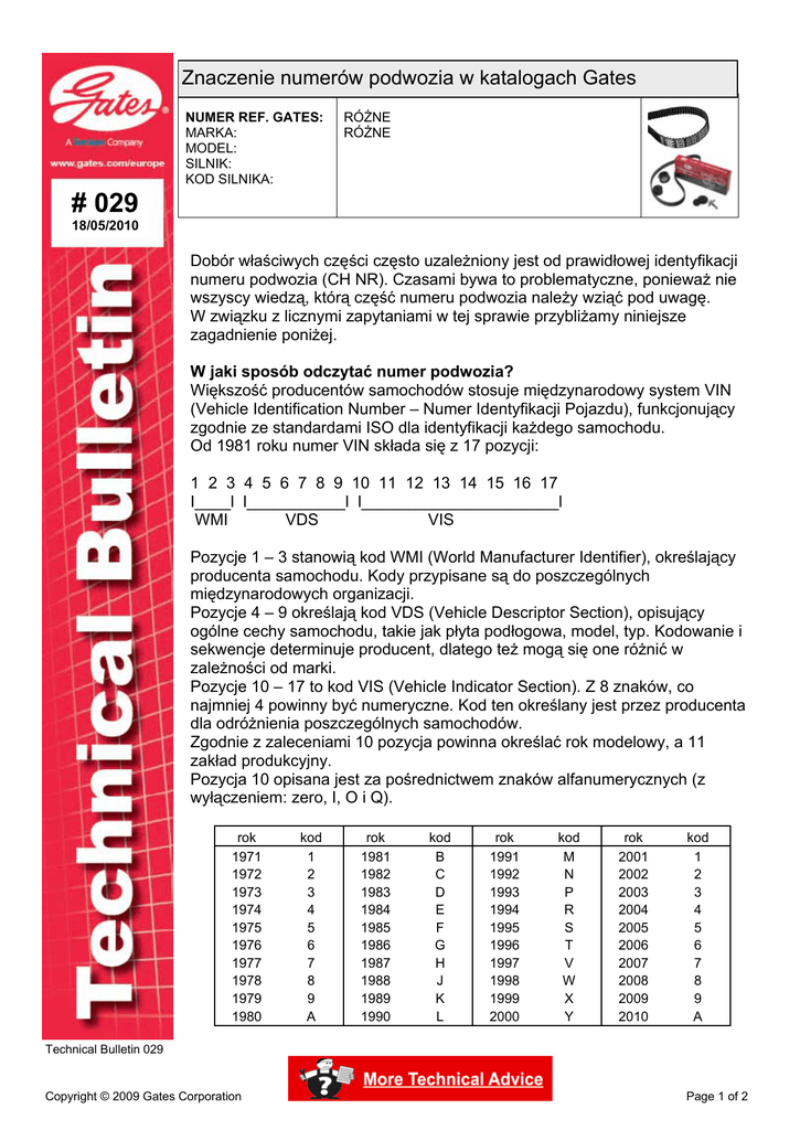 Znaczenie numerów podwozia w katalogach Gates NUMER REF. GATES: MARKA: MODEL: SILNIK: KOD SILNIKA: RÓŻNE RÓŻNE # 029 18/05/2010 Dobór właściwych części często uzależniony jest od prawidłowej identyfikacji numeru podwozia (CH NR). Czasami bywa to problematyczne, ponieważ nie wszyscy wiedzą, którą część numeru podwozia należy wziąć pod uwagę. W związku z licznymi zapytaniami w tej sprawie przybliżamy niniejsze zagadnienie poniżej. W jaki sposób odczytać numer podwozia? Większość producentów samochodów stosuje międzynarodowy system VIN (Vehicle Identification Number – Numer Identyfikacji Pojazdu), funkcjonujący zgodnie ze standardami ISO dla identyfikacji każdego samochodu. Od 1981 roku numer VIN składa się z 17 pozycji: 1 2 3 4 5 6 7 8 9 10 11 12 13 14 15 16 17 I____l l___________l l______________________l WMI VDS VIS Pozycje 1 – 3 stanowią kod WMI (World Manufacturer Identifier), określający producenta samochodu. Kody przypisane są do poszczególnych międzynarodowych organizacji. Pozycje 4 – 9 określają kod VDS (Vehicle Descriptor Section), opisujący ogólne cechy samochodu, takie jak płyta podłogowa, model, typ. Kodowanie i sekwencje determinuje producent, dlatego też mogą się one różnić w zależności od marki. Pozycje 10 – 17 to kod VIS (Vehicle Indicator Section). Z 8 znaków, co najmniej 4 powinny być numeryczne. Kod ten określany jest przez producenta dla odróżnienia poszczególnych samochodów. Zgodnie z zaleceniami 10 pozycja powinna określać rok modelowy, a 11 zakład produkcyjny. Pozycja 10 opisana jest za pośrednictwem znaków alfanumerycznych (z wyłączeniem: zero, I, O i Q). rok 1971 1972 1973 1974 1975 1976 1977 1978 1979 1980 kod 1 2 3 4 5 6 7 8 9 A rok 1981 1982 1983 1984 1985 1986 1987 1988 1989 1990 kod B C D E F G H J K L rok 1991 1992 1993 1994 1995 1996 1997 1998 1999 2000 kod M N P R S T V W X Y rok 2001 2002 2003 2004 2005 2006 2007 2008 2009 2010 kod 1 2 3 4 5 6 7 8 9 A Technical Bulletin 029 Copyright © 2009 Gates Corporation Page 1 of 2 Z powyższego opisu wynika, że większość zasad traktowana jest wyłącznie jako zalecenia i należy się liczyć z różnicami w konfiguracji numeru VIN w zależności od producenta. Z tego powodu w katalogu Gates wykorzystywane są dane zgodne z formatem określonym w dokumentacji technicznej producentów samochodów. # 029 18/05/2010 Przykłady: 1. W samochodach marki Mercedes bierzemy po uwagę ostatnie (6 lub) 7 pozycji (11) 12 13 14 15 16 17 (pozycja) (A) 3 4 8 1 1 8 2. W samochodach marki VW wyszczególnia się ostatnie 11 pozycji 7 8 9 10 11 12 13 14 15 16 17 (pozycja) 3 C - 6 - 3 0 0 0 0 0 aczkolwiek pozycja 9 i 11 (-) może być określona dowolną liczba bez wpływu na zalecenia. 3. W przypadku samochodów Opel/Vauxhall często podawane jest więcej niż jedno oznaczenie podwozia (ostatnie 8 pozycji) (patrz Vectra B 2.5 24V) ->I CH NR ->I CH NR ->I CH NR 10 W W W 11 1 5 7 12 2 2 1 13 8 7 5 14 5 6 4 15 4 8 2 16 4 2 5 I-> CH NR I-> CH NR I-> CH NR W 1 W 5 W 7 2 2 1 8 7 5 5 6 4 4 8 2 4 2 5 17 (pozycja) 6 5 K015453XS 8 7 6 9 K025453XS Może to prowadzić do przeświadczenia, iż numer podwozia kończący się oznaczeniem W5204751 jest niższy od W5276825 (K015453XS) i wyższy od W1285447 (K025453XS). Biorąc jednak pod uwagę, że 11 pozycja numeru podwozia określa zakład produkcyjny i nie stanowi części numeru seryjnego staje się jasnym, iż właściwym zestawem rozrządu dla samochodu oznaczonego końcówką numeru podwozia W5 204751 jest K015453XS. Mamy nadzieję, iż powyższe wyjaśnienia umożliwią uniknięcie dalszych problemów w przyszłości. Odwiedź nasz katalog on-line: www.gatesautocat.com Technical Bulletin 029 Copyright © 2009 Gates Corporation Page 2 of 2