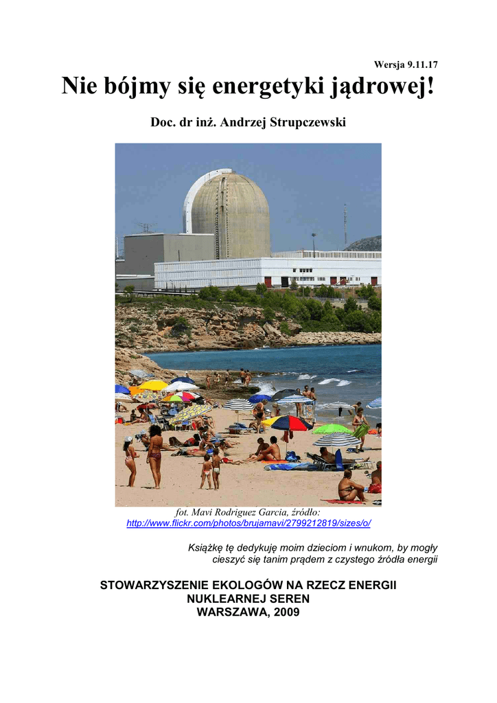 Wersja 9.11.17 Nie bójmy się energetyki jądrowej! Doc. dr inż. Andrzej Strupczewski fot. Mavi Rodriguez Garcia, źródło: http://www.flickr.com/photos/brujamavi/2799212819/sizes/o/ Książkę tę dedykuję moim dzieciom i wnukom, by mogły cieszyć się tanim prądem z czystego źródła energii STOWARZYSZENIE EKOLOGÓW NA RZECZ ENERGII NUKLEARNEJ SEREN WARSZAWA, 2009 Nie bójmy się energetyki jądrowej Spis treści 1. Czemu potrzebujemy energetyki jądrowej w Polsce? ............................................. 5 1.1. Co postanowił rząd polski w styczniu 2009 roku? ..............................................5 1.2. Na ile wystarczy nam węgla? ...............................................................................6 1.3. Renesans energetyki jądrowej na świecie ..........................................................7 1.4. Korzyści z energetyki jądrowej ........................................................................... 10 2. Czy zaszkodzi nam promieniowanie przy normalnej pracy elektrowni jądrowych? 14 2.1. Im wyżej tym promieniowanie większe - wielkość dawek od tła naturalnego 14 2.2. Gdzie poziom promieniowania jest większy – w Polsce czy w Finlandii? ...... 16 2.3. Gdy powstawało życie promieniowanie było silniejsze .................................... 17 2.4. Hipoteza o liniowej zależności zagrożenia od dawki promieniowania............ 17 2.5. Jakie są dawki promieniowania, które uważamy za dopuszczalne? .............. 19 2.6. Wpływ małych dawek promieniowania na duże grupy ludności ..................... 19 2.6.1. Badania w USA .............................................................................................19 2.6.2. Brak ujemnych efektów zdrowotnych podwyższonego promieniowania wśród dużej grupy mieszkańców Chin .....................................................................23 2.6.3. Różnice poziomu promieniowania w Polsce ..............................................24 2.6.4. Senatorowie USA też nie boją się przebywać w Bibliotece i w Gmachu Kongresu.....................................................................................................................24 2.6.5. Czemu nie mamy zmysłu wykrywającego promieniowanie? ...................25 2.7. Wpływ narażenia na promieniowanie powodowane przez człowieka ............ 25 2.7.1. Badania pracowników przemysłu jądrowego .............................................25 2.7.2. Badania brytyjskich radiologów ...................................................................27 2.7.3. Klucz do bezpieczeństwa - rozłożenie dawek w czasie ..........................28 2.7.4. Napromieniowanie rodziców małymi dawkami nie ma wpływu na potomstwo...................................................................................................................29 2.7.5. Nowe osiągnięcia w badaniach procesów biologicznych po napromieniowaniu ludzi .............................................................................................30 2.8. Podsumowanie .................................................................................................... 33 2.9. Dawki wokoło elektrowni jądrowych też są bardzo małe – i nie szkodzą! ..... 33 2.9.1. Stanowisko energetyki jądrowej – redukujemy dawki ile tylko można! ...33 2.9.2. Małe i wciąż obniżane narażenie radiacyjne pracowników elektrowni. ...34 2.9.3. Stałe zmniejszanie emisji promieniowania z elektrowni jądrowych. ........35 2.9.4. Dawki wokoło elektrowni jądrowych – dopuszczalne i rzeczywiste. ........36 2.9.5. Wodę z elektrowni jądrowej można pić! .....................................................38 2.9.6. Porównania ryzyka powodowanego bliskością elektrowni jądrowej ........39 2.10. Sprawa ognisk zwiększonej częstości występowania białaczki dziecięcej. 39 2.10.1. Ogniska zwiększonej częstości występowania białaczki dziecięcej w Wielkiej Brytanii ..........................................................................................................39 2.10.2. We Francji instalacje jądrowe również nie powodują zagrożenia ........40 2.11. Zarzuty Zielonych w Niemczech – i rzeczywistość. ...................................... 41 2.11.1. Przypadki białaczki blisko EJ Krummel – skutki produkcji materiałów wybuchowych .............................................................................................................41 2.11.2. Wyjaśnienie zagadki .................................................................................42 2.11.3. Analizy zachorowalności wokoło elektrowni jądrowych w Niemczech wykazują że promieniowanie z EJ nie może być przyczyną chorób. ....................42 2 Czy powinniśmy obawiać się odpadów radioaktywnych? ......................................45 3.1. Czym grożą nam odpady radioaktywne? .......................................................... 45 3.2. Recykling paliwa – zamknięty cykl paliwowy (paliwo jądrowe jako surowiec wtórny) ............................................................................................................................ 46 3.3. Co lepiej : czy odpady (radioaktywne lub nie, z elektrowni jądrowych czy z innych) wyrzucać do otoczenia, czy przechowywać pod kontrolą? .......................... 49 3.3.1. System barier zatrzymujących produkty radioaktywne z dala od biosfery 49 3.3.2. Jak długo system barier będzie skuteczny? ..............................................50 3.3.3. Okręt wojenny Wasa – skutki działania wody przez 350 lat .....................51 3.3.4. Odpady radioaktywne z reaktorów naturalnych w Oklo – co pozostało po 2 miliardach lat? .........................................................................................................51 3.3.5. Na jak długo musimy zabezpieczyć odpady radioaktywne? ....................53 4. Czy mamy bać się awarii jądrowych? .............................................