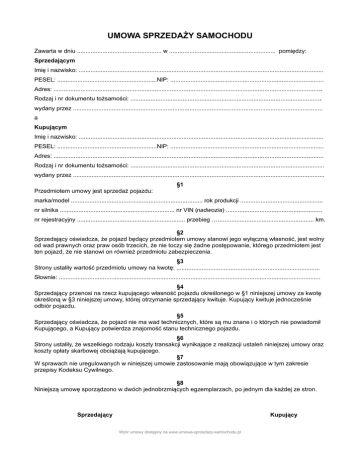 UMOWA SPRZEDAŻY SAMOCHODU Zawarta w dniu .................................................. w ............................................................... pomiędzy: Sprzedającym Imię i nazwisko: ................................................................................................................................................. PESEL: ...........................................................NIP: ........................................................................................... Adres: ................................................................................................................................................................ Rodzaj i nr dokumentu tożsamości: .................................................................................................................. wydany przez .................................................................................................................................................... a Kupującym Imię i nazwisko: ................................................................................................................................................. PESEL: ...........................................................NIP: ........................................................................................... Adres: ................................................................................................................................................................ Rodzaj i nr dokumentu tożsamości: ................................................................................................................... wydany przez ..................................................................................................................................................... §1 Przedmiotem umowy jest sprzedaż pojazdu: marka/model .............................................................................. rok produkcji ................................................. nr silnika .................................................................... nr VIN (nadwozia) ......................................................... nr rejestracyjny ................................................................ przebieg …......................................................... km. §2 Sprzedający oświadcza, że pojazd będący przedmiotem umowy stanowi jego wyłączną własność, jest wolny od wad prawnych oraz praw osób trzecich, że nie toczy się żadne postępowanie, którego przedmiotem jest ten pojazd, że nie stanowi on również przedmiotu zabezpieczenia. §3 Strony ustaliły wartość przedmiotu umowy na kwotę: ..................................................................................... Słownie: ........................................................................................................................................................... §4 Sprzedający przenosi na rzecz kupującego własność pojazdu określonego w §1 niniejszej umowy za kwotę określoną w §3 niniejszej umowy, której otrzymanie sprzedający kwituje. Kupujący kwituje jednocześnie odbiór pojazdu. §5 Sprzedający oświadcza, że pojazd nie ma wad technicznych, które są mu znane i o których nie powiadomił Kupującego, a Kupujący potwierdza znajomość stanu technicznego pojazdu. §6 Strony ustaliły, że wszelkiego rodzaju koszty transakcji wynikające z realizacji ustaleń niniejszej umowy oraz koszty opłaty skarbowej obciążają kupującego. §7 W sprawach nie uregulowanych w niniejszej umowie zastosowanie mają obowiązujące w tym zakresie przepisy Kodeksu Cywilnego. §8 Niniejszą umowę sporządzono w dwóch jednobrzmiących egzemplarzach, po jednym dla każdej ze stron. Sprzedający Kupujący Wzór umowy dostępny na www.umowa-sprzedazy-samochodu.pl
