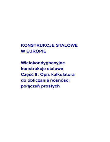 KONSTRUKCJE STALOWE W EUROPIE Wielokondygnacyjne konstrukcje stalowe Część 9: Opis kalkulatora do obliczania nośności połączeń prostych Wielokondygnacyjne konstrukcje stalowe Część 9: Opis kalkulatora do obliczania nośności połączeń prostych 9 - ii Część 9: Opis kalkulatora do obliczania nośności połączeń prostych PRZEDMOWA Niniejsza publikacja stanowi dziewiątą część przewodnika projektanta zatytułowanego Wielokondygnacyjne konstrukcje stalowe. Przewodnik Wielokondygnacyjne konstrukcje stalowe składa się z 10 następujących rozdziałów: Część 1: Część 2: Część 3: Część 4: Część 5: Część 6: Część 7: Część 8: Część 9: Część 10: Poradnik architekta Projekt koncepcyjny Oddziaływania Projekt wykonawczy Projektowanie połączeń Inżynieria pożarowa Wzorcowa specyfikacja konstrukcji Opis kalkulatora do obliczania nośności elementów konstrukcyjnych Opis kalkulatora do obliczania nośności połączeń prostych Wskazówki dla twórców oprogramowania do projektowania belek zespolonych Wielokondygnacyjne konstrukcje stalowe to jeden z dwóch przewodników projektanta. Drugi przewodnik nosi tytuł Jednokondygnacyjne konstrukcje stalowe. Obydwa przewodniki projektanta powstały w ramach europejskiego projektu „Wspieranie rozwoju rynku kształtowników na potrzeby hal przemysłowych i niskich budynków (SECHALO) RFS2-CT-2008-0030”. Przewodniki projektanta oraz powiązane oprogramowanie, do którego odnosi się niniejsza dokumentacja, zostały opracowane pod kierownictwem firm ArcelorMittal, Peiner Träger oraz Corus. Treść techniczna została przygotowana przez ośrodki badawcze CTICM oraz SCI współpracujące w ramach joint venture Steel Alliance. 9-1 Część 9: Opis kalkulatora do obliczania nośności połączeń prostych 9-2 Część 9: Opis kalkulatora do obliczania nośności połączeń prostych Spis treści Nr strony PRZEDMOWA 1 STRESZCZENIE 4 1 WPROWADZENIE 1.1 Visual Basic 1.2 Zakres opracowania 1.3 Zasady projektowania 5 5 5 7 2 OBSŁUGA SKOROSZYTU 2.1 Arkusz wprowadzający 2.2 Arkusz lokalizacji 2.3 Arkusz danych wejściowych 2.4 Funkcje dostępne w arkuszach połączeń 2.5 Arkusz styku słupa (Splice) 2.6 Arkusz blachy przykładki środnika (Fin Plate) 2.7 Arkusz blachy doczołowej (End Plate) 2.8 Arkusz łączników (Cleats) 2.9 Arkusz blachy podstawy (Baseplate) 8 8 8 8 10 10 11 12 13 13 3 ZRZUTY EKRANU 14 4 DANE WYJŚCIOWE 19 9-3 Część 9: Opis kalkulatora do obliczania nośności połączeń prostych STRESZCZENIE Niniejszy dokument zawiera opis przygotowanego w programie Excel kalkulatora nośności połączeń, takich jak połączenia nominalnie przegubowe używane w stężanych ramach stalowych. Przedstawiono w nim zakres informacji zawartych w skoroszycie oraz listę Załączników krajowych i języków obsługiwanych przez skoroszyt. W dokumentacji znajduje się opis każdego z arkuszy wraz z przypisanymi mu danymi wejściowymi. Dodatkowo przedstawiono zrzut ekranu z typowymi danymi wyjściowymi. 9-4 Część 9: Opis kalkulatora do obliczania nośności połączeń prostych 1 WPROWADZENIE Niniejszy dokument, będący częścią przewodnika projektanta Wielokondygnacyjne konstrukcje stalowe, zawiera wprowadzenie do pracy ze skoroszytem programu Excel dotyczącym projektowania połączeń nominalnie przegubowych zgodnie z normą EN 1993-1-8. Skoroszyt ma wielojęzyczny charakter i oferuje wybór wartości z Załączników krajowych. Obsługa skoroszytu została opisana w rozdziale 2. Zrzuty ekranu przedstawiające różne arkusze skoroszytu znajdują się w rozdziale 3. 1.1 Visual Basic Skoroszyt bazuje na rozbudowanym kodzie języka Visual Basic. U niektórych użytkowników konfiguracja zabezpieczeń może uniemożliwiać wykonywanie takiego kodu. Poziom zabezpieczeń można zmienić, wybierając kolejno: „Narzędzia”, „Opcje”. Należy wybrać zakładkę „Zabezpieczenia” i kliknąć przycisk „Bezpieczeństwo makr”. Należy ustawić przynajmniej „Średni” poziom zabezpieczeń. Aby wprowadzone zmiany poziomu zabezpieczeń zaczęły obowiązywać, konieczne jest zazwyczaj zamknięcie i ponowne uruchomienie programu Excel. 1.2 Zakres opracowania 1.2.1 Typy połączeń W skoroszycie omówiono połączenia nominalnie przegubowe wykorzystywane powszechnie w wielokondygnacyjnych konstrukcjach stalowych. W poszczególnych arkuszach skoroszytu omówiono następujące typy połączeń: podatne blachy doczołowe o niepełnej wysokości (nazywane również blachami czołowymi), blachy przykładki środnika, podwójne łączniki kątowe, styki słupa (typu dociskowego), podstawy słupów. W przypadku połączeń belek obliczana jest nośność zarówno przy ścinaniu pionowym, jak i przy działaniu poziomej siły ciągnienia. Wszystkie połączenia stykowe słupa to połączenia typu dociskowego. Oznacza to, że ich nośność przy ściskaniu osiowym nie jest obliczana. W przypadku styków słupa obliczana jest jedynie nośność przy rozciąganiu na potrzeby obliczeń ciągnienia. W przypadku połączeń blach podstaw obliczana jest jedynie nośność przy ściskaniu osiowym. Każdy typ połączenia został opisany w osobnym arkuszu. Domyślnymi danymi szczegółowymi połączenia są zalecane, znormalizowane dane szczegółowe. Dane szczegółowe połączeń są również nanoszone na schematy w każdym z arkuszy. 9-5 Część 9: Opis kalkulatora do obliczania nośności połączeń prostych Informacje dotyczące nośności połączeń oraz szczegóły na rysunku są natychmiast aktualizowane po zmianie przez użytkownika danych wejściowych. Przywrócenie szczegółowych danych znormalizowanych jest możliwe w dowolnym momencie. Jeżeli nie zostaną spełnione wszystkie wymagania dotyczące geometrii i w konsekwencji na schemacie zostanie wyświetlone ostrzeżenie, schemat nie zostanie zaktualizowany. Zaktualizowany schemat zostanie wyświetlony dopiero po rozwiązaniu problemu dotyczącego
