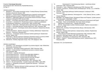 Przedmiot Technologia Remontów dla specjalności ESO i Mechatronika, Wydział Mechaniczny Nr Prog. 17 Literatura podstawowa: 1. Bielawski P.: Ocena jakości elementów maszyn. Fundacja Rozwoju Wyższej Szkoły Morskiej w Szczecinie, Szczecin 1999. 2. Bielawski P.: Promieniowanie elektromagnetyczne w badaniach nieniszczących. Materiały wewnętrzne programu TEMPUS S-JEP-07495-94, Szczecin 1997. 3. Bielawski P.: Diagnostyka drganiowa mechanizmów tłokowo-korbowych maszyn okrętowych. Monografia WSM, Szczecin 2002. 4. Doerffer J.: Technologia wyposażania statków, Wydawnictwo Morskie Gdańsk 1975. 5. Grudziński K., Jaroszewicz W.: Posadowienie maszyn i urządzeń na podkładkach fundamentowych odlewanych z tworzywa EPY. Zapol, Szczecin 2005. 6. Jakubiec W., Malinowski J. Metrologia wielkości geometrycznych. WNT, Warszawa 1996. 7. Jezierski J.: Technologia tłokowych silników spalinowych. WNT, Warszawa 1999. 8. Kowalski A., Zaczek Z.: Technologia remontu siłowni okrętowych. Wydawnictwo Morskie. Gdańsk 1973. 9. Lewińska-Romińska A.: Badania nieniszczące. Podstawy defektoskopii. Wydawnictwo Naukowo – Techniczne, Warszawa 2001. 10. Piaseczny L.: Technologia naprawy okrętowych silników spalinowych. Wydawnictwo Morskie. Gdańsk 1992. 11. Raunmiagi Z.: Naprawy wybranych okrętowych elementów maszyn za pomocą obróbki ubytkowej. Wydawnictwo Naukowe Akademii Morskiej, Szczecin 2010. 12. Żółtowski B.: Podstawy diagnostyki maszyn. Wyd. ATR, Bydgoszcz 1996. 14. 15. 16. 17. 18. 19. 20. 21. 22. 23. 24. 25. 26. 27. 28. Kozaczewski W.: Konstrukcja grupy tłokowo – cylindrowej silników spalinowych. WKiŁ, Warszawa 2004. Krukowski A., Tutaj J. Połączenia odkształceniowe PWN, Warszawa 1987. Lipnicki M., Szulwach Z., Podstawy badań ultradźwiękowych. Koli Sp. z o.o. w Gdańsku. Gdańsk 1995. Łukomski : Technologia spalinowych silników kolejowych i okrętowych. WKiŁ, Warszawa 1972. Materiały reklamowe i informacyjne firm – Unitor, Belzona, Devcon, Loctitle i Chester Molecular. MAN B&W: The Intelligent Engine. Development Status and Prospects. Cylinder pressure measuring system. Copenhagen 11.2000. MAPEX PR – Monitoring and Maintenance Performance Enhancement with Expert Knowledge – Piston-running Reliability. New Sulzer Diesel catalogue. Nagrzewnice indukcyjne firmy – materiały informacyjne. NK-100 – Diesel Engine Condition Monitoring System. Maritime Instrumentation – Autronica, Oct 1997. Nowikow M.P., Podstawy Technologii Montażu Maszyn i Mechanizmów. WNT, Warszawa 1972. Piotrowski I. Okrętowe silniki spalinowe. Zasady budowy i działania. Wydawnictwo Morskie, Gdańsk 1983. Praca zbiorowa Poradnik Metrologa warsztatowego. WNT, Warszawa 1994. Sadowski A. Metrologia długości i kąta. WNT, Warszawa 1988. Śliwiński A.: Ultradźwięki i ich zastosowania. WNT, Warszawa 1993. Wajand J., Wajand T.: Tłokowe silniki spalinowe średnio i szybkoobrotowe. WNT, Warszawa 2000. Opracował: dr inż. Jan Drzewieniecki Literatura uzupełniająca: 1. Arendarski J. i inni: Sprawdzanie przyrządów do pomiarów długości i kąta. Politechnika Warszawska. Warszawa 2009. 2. Brodowicz W.: Technologia silników spalinowych. WSiP, Warszawa 1984. 3. Jezierski J. Analiza tolerancji i niedokładności pomiarów w budowie maszyn. WNT Warszawa 1994. 4. Chris Marine – materiały informacyjne. 5. Dokumentacja techniczno – ruchowa silnika MAN B&W 6S90MC-C. 6. Dokumentacja techniczno – ruchowa silnika MAN B&W S28L. 7. Dokumentacja techniczno – ruchowa silnika DU-SULZER 7RTA84T. 8. Diesel Marine International – katalogi napraw i regeneracji. 9. Gourd L.: Podstawy technologii spawalniczych. WNT, Warszawa 1995. 10. Hikima T.: The best seamanship – A guide to engine skills. IMMAJ, Japan 2005. 11. Jezierski G.: Radiografia przemysłowa. Wydawnictwo Naukowo – Techniczne. Warszawa 1993. 12. Jędrzejowski J.: Obliczanie tłokowych silników spalinowych. WNT, Warszawa 1988. 13. Kemel Air Seal – materiały instruktażowe. Przedmiot Urządzenia transmisji mocy dla specjalności Diagnostyka i Remonty Maszyn i Urządzeń Okrętowych, Wydział Mechaniczny Nr Prog. 29. Przedmiot Ocena jakości elementów maszyn dla specjalności Diagnostyka i Remonty Maszyn i Urządzeń Okrętowych, Wydział Mechaniczny Nr Prog. 30. Literatura podstawowa: 1. Balcerski A.: Siłownie okrętowe. Podstawy termodynamiki. Silniki i napędy główne. Urządzenia pomocnicze. Instalacje. Wydawnictwo Politechniki Gdańskiej, Gdańsk 1986 2. Charchalis A.: Siłownie okrętowe dla mechaników. Cz.I. Opory okrętu i pędniki okrętowe. Wyd. WSMW, Gdynia 1982 3. Cudny K.: Linie wałów okrętowych. Wydawnictwo Morskie Gdańsk 1976 4. Dudziak : Teoria okrętu. Fundacja Promocji Przemysłu okrętowego i Gospodarki Morskiej. Gdańsk 2008 5. Kowalski A., Krzyżanowski J.: Okrętowe siłownie parowe. Wyższa Szkoła Morska, Gdynia 1991 6. Nowak M.: Siłownie okrętowe dla mechaników. Cz.II. Okrętowy układ napędowy. Wyższa Szkoła Marynarki Wojennej, Gdynia, 1984 7. Wojnowski W.: Okrętowe siłownie spalinowe. Część I. Wyd. Akademii Marynarki Wojennej, Gdynia 1998. 8. Zając M.: Układy przeniesienia napędu samochodów ciężarowych i autobusów. Wydawnictwa Komunikacji i Łączności, Warszawa 2003 Literatura podstawowa: Literatura uzupełniająca: 1. Dietrich M.: Podstawy konstrukcji maszyn, tom 2. WNT, Warszawa 1999 2. Dietrich M.: Podstawy konstrukcji maszyn, tom 3. WNT, Warszawa 1999 3. Jarzyna H.: Pędniki okrętowe. Ossolineum, IMP PAN, w serii Maszyny Przepływowe, Tom 25, Gdańsk 1995 4. Skoć A., Spałek J.: Podstawy konstrukcji maszyn. Tom 1. WNT, Warszawa 2006 5. Skoć A., Spałek J., Markusik S.: Podstawy konstrukcji maszyn. Tom 2. WNT, Warszawa 2008 Literatura uzupełniająca: 1. Bielawski P.: Promieniowanie elektromagnetyczne w badaniach nieniszczących. Szczecin 1997 2. Bielawski P.: Ocena jakości elementów maszyn. WSM Szczecin 1999 3. pr. zb. pod red. Humienny Zb.: Specyfikacje geometrii wyrobów.
