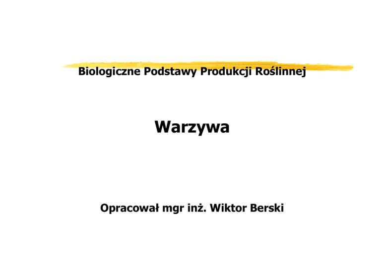 Biologiczne Podstawy Produkcji Roślinnej Warzywa Opracował mgr inż. Wiktor Berski Wykorzystano materiały z następujących źródeł: • http://www.ppr.pl/ • http://encyklopedia.pwn.pl/ • http://wiem.onet.pl/ WARZYWNE ROŚLINY, warzywa, rośliny roczne, dwuletnie lub byliny (rzadko krzewy lub drzewa) służące w całości lub części (np. owoce, nasiona, pędy, liście, kwiatostany, korzenie) jako pokarm człowieka; spożywane w postaci surowej, gotowanej albo w przetworach. Niektóre, jak np. chrzan, czosnek, papryka ostra, są używane jako przyprawy. Rośliny warzywne należą do wielu rodzin botanicznych i pochodzą z różnych stref klimatycznych. W warunkach klimatu umiarkowanego Polski uprawia się w polu około 40 gatunków; natomiast rośliny o większych wymaganiach cieplnych i długim okresie wegetacji, jak pomidor, papryka, uprawia się z rozsady produkowanej w inspektach lub cieplarniach. Warzywa są pożywieniem dodatkowym, odgrywają bardzo ważną rolę w odżywianiu człowieka — stanowią źródło witamin, zwłaszcza witaminy C i prowitaminy A, związków mineralnych oraz błonnika, a warzywa strączkowe są ponadto bogatym źródłem białka roślinnego. Ważną zaletą roślin warzywnych jest wysoka wartość biologiczna i dietetyczna (m.in. działanie odkwaszające, zapobieganie niektórym chorobom) przy na ogół niskiej wartości energetycznej. Warzywa są artykułami niskokalorycznymi (10 – 60 kcal/ 100g), a w szczególności warzywa liściaste. Nie występują w nich w większej ilości takie grupy składników, jak węglowodany, białka, tłuszcze. Ilość substancji białkowych waha się na ogół od 1-4%, tłuszcz występuje w ilościach bardzo małych, jedynie nieco więcej znajduje się w warzywach węglowodanów. Węglowodany przyswajalne występują w ilościach 3-9%, w tym cukry proste nie przekraczają 4%. Zawartość celulozy znacznie się waha od około 0,22,0%. Najwięcej zawierają wody 65-96%, która też przyczynia się do krótkiego okresu ich świeżości i różnego stopnia przechowywania. Wartość biologiczna warzyw jest znaczna, gdyż zawierają różnorodne witaminy i sole mineralne. Najwięcej Ca zawiera jarmuż i brokuł, P – zawierają strączkowe, Fe – liściowe szpinak i sałata. Warzywa zawierają również pektyny, które wpływają na obniżenie cholesterolu we krwi oraz usuwają szkodliwe związki z organizmu. Bogaty w pektyny jest seler korzeniowy i burak ćwikłowy. Warzywa nalezą do artykułów spożywczych przyczyniających się do odkwaszenia organizmu (do artykułów spożywczych zakwaszających organizm zalicza się artykuły wysokobiałkowe jak mięso, jaja oraz artykuły mączne). Rośliny strączkowe dostarczają białka. Do warzyw można także zaliczyć wielkie glony morskie - brunatnice, krasnorosty i zielenice (np. Ulva sałatowa), spożywane w krajach Dalekiego Wschodu i na wyspach Pacyfiku w postaci jarzyn i sałatek. Do warzyw zalicza się także grzyby (pieczarka, grzyby leśne) oraz porosty, spożywane dawniej m.in. przez ludność Islandii (płucnica islandzka), Indian Ameryki Północnej (porosty z rodzaju Alectoria), czy przez ludność zachodniej Azji i Afryki (występująca na pustyniach krusznica jadalna). Klasyfikacja warzyw może być botaniczna jak i praktyczno-użytkowa. W Polsce przyjęła się klasyfikacja pośrednia uwzględniająca ich właściwości biologiczne, pokrewieństwo botaniczne, oraz sposób użytkowania. Podział warzyw na grupy użytkowe, zwany również podziałem wg Lityńskiego, gdzie jednym z kryteriów jest część jadalna rośliny. Podział ten ma duże znaczenie, gdyż rośliny należące do danej grupy użytkowej wymagają podobnych zabiegów agrotechnicznych. 1.Cebulowe /cebula, por, czosnek/ - część jadalna zgrubiałe pochwy liściowi zwane u cebuli łuskami. W wewnętrznych łuskach mięsistych gromadzą się materiały zapasowe - zewnętrzne suche pełnią funkcję ochronną. 2.Dyniowate /ogórek, cukinia, kabaczek, patison, dynia, melon, kawon/ część jadalna stanowi owoc. 3.Kapustne /kapusta głowiasta, biała i czerwona, kapusta włoska, kapusta brukselska, kalafior, brokuł, kalarepa/ - część jadalna: liście u kapust kwiatostan u brokuła, zgrubiała łodyga u kalarepy, kalafior - wielokrotnie rozgałęziająca się część szczytowa łodygi. 4.Korzeniowe /marchew, pietruszka, seler, burak ćwikłowy/ - część jadalna korzeń spichrzowy. 5.Liściowe /sałata szpinak/ - część jadalna: liście. 6.Psiankowate /pomidor, papryka, bakłażan/ - część jadalna owoc. 7.Strączkowe /fasola, groch, bób, groszek zielony/ - do warzyw zalicza się tylko strączkowe spożywane w stanie niedojrzałym - nasiona grochu, strąki fasoli szparagowej /czyli owoc/; strączkowe używane jako suche ziarno zalicza się do roślin rolniczych. 8.Rzepowate /rzodkiew, rzepa/ - część jadalna to zgrubienie części podliścieniowej i górnej części korzenia. 9.Wieloletnie /szparag, rabarbar, chrzan/ - część jadalna to: szparag - młode pędy, rabarbar - ogonek liściowy. 10.Przyprawowe i smakowe majeranek, kukurydza cukrowa/. /koper, pietruszka naciowa, kminek, Omówienie wybranych grup warzyw, głównie w ich aspekcie przydatności do przerobu. Warzywa liściowe (sałata, szpinak) Warzywa psiankowate (pomidor) Warzywa dyniowate (ogórek) Są to warzywa, których części jadalne charakteryzują się bardzo delikatną tkanką, o dużej zawartości wody (94-96%). Poza sałatą wszystkie stanowią surowiec dla przemysłu spożywczego, wszystkie są bardzo wrażliwe na transport i nie nadają się do przechowywania. Warzywa należące do tych grup są uprawiane pod różnego rodzaju osłonami: szklarnie ogrzewane, nieogrzewane, namioty foliowe. Warzywa liściowe (sałata, szpinak) maja krótki okres wegetacji i mogą być wysiewane i zbierane kilka razy do roku. Sałata – bywa uprawiana w szklarni, inspektach pod folią, oraz w uprawie polowej na zbiór wio