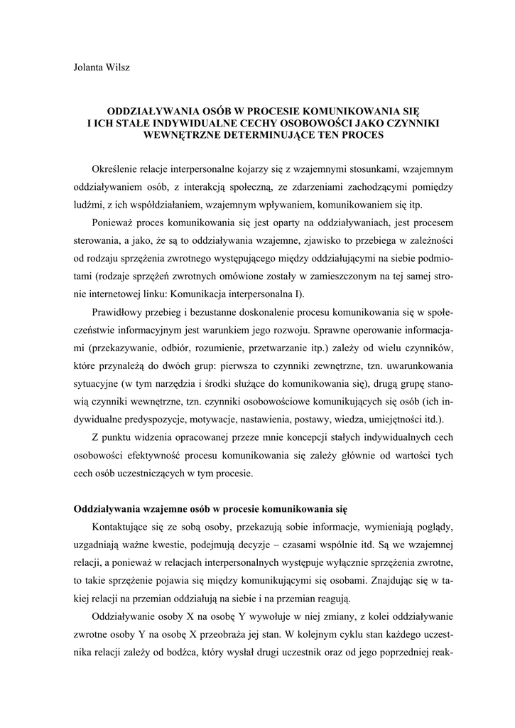 Jolanta Wilsz ODDZIAŁYWANIA OSÓB W PROCESIE KOMUNIKOWANIA SIĘ I ICH STAŁE INDYWIDUALNE CECHY OSOBOWOŚCI JAKO CZYNNIKI WEWNĘTRZNE DETERMINUJĄCE TEN PROCES Określenie relacje interpersonalne kojarzy się z wzajemnymi stosunkami, wzajemnym oddziaływaniem osób, z interakcją społeczną, ze zdarzeniami zachodzącymi pomiędzy ludźmi, z ich współdziałaniem, wzajemnym wpływaniem, komunikowaniem się itp. Ponieważ proces komunikowania się jest oparty na oddziaływaniach, jest procesem sterowania, a jako, że są to oddziaływania wzajemne, zjawisko to przebiega w zależności od rodzaju sprzężenia zwrotnego występującego między oddziałującymi na siebie podmiotami (rodzaje sprzężeń zwrotnych omówione zostały w zamieszczonym na tej samej stronie internetowej linku: Komunikacja interpersonalna I). Prawidłowy przebieg i bezustanne doskonalenie procesu komunikowania się w społeczeństwie informacyjnym jest warunkiem jego rozwoju. Sprawne operowanie informacjami (przekazywanie, odbiór, rozumienie, przetwarzanie itp.) zależy od wielu czynników, które przynależą do dwóch grup: pierwsza to czynniki zewnętrzne, tzn. uwarunkowania sytuacyjne (w tym narzędzia i środki służące do komunikowania się), drugą grupę stanowią czynniki wewnętrzne, tzn. czynniki osobowościowe komunikujących się osób (ich indywidualne predyspozycje, motywacje, nastawienia, postawy, wiedza, umiejętności itd.). Z punktu widzenia opracowanej przeze mnie koncepcji stałych indywidualnych cech osobowości efektywność procesu komunikowania się zależy głównie od wartości tych cech osób uczestniczących w tym procesie. Oddziaływania wzajemne osób w procesie komunikowania się Kontaktujące się ze sobą osoby, przekazują sobie informacje, wymieniają poglądy, uzgadniają ważne kwestie, podejmują decyzje – czasami wspólnie itd. Są we wzajemnej relacji, a ponieważ w relacjach interpersonalnych występuje wyłącznie sprzężenia zwrotne, to takie sprzężenie pojawia się między komunikującymi się osobami. Znajdując się w takiej relacji na przemian oddziałują na siebie i na przemian reagują. Oddziaływanie osoby X na osobę Y wywołuje w niej zmiany, z kolei oddziaływanie zwrotne osoby Y na osobę X przeobraża jej stan. W kolejnym cyklu stan każdego uczestnika relacji zależy od bodźca, który wysłał drugi uczestnik oraz od jego poprzedniej reak- cji. Tak więc kolejne stany i zachowania uczestników relacji zależą od ich poprzednich stanów i wcześniejszych reakcji. Przeanalizuję najmniej skomplikowaną sytuację, tzn. taką, w której uczestniczą dwie osoby. Wzajemne kontakty rozpoczynają się, kiedy oddziaływanie osoby X, dotrze do osoby Y. Jeśli -osoba Y odbierze i przetworzy to oddziaływanie, wówczas powinna na nie zareagować, z kolei, jeśli jej reakcja dotrze do osoby X, a ta odbierze i przetworzy ją – również powinna na nią zareagować. Komunikujące się osoby występują na przemian w roli nadawcy, gdy przekazują informację (komunikat) – pełnią wtedy funkcję systemu sterującego1 albo w roli odbiorcy, gdy ją otrzymują – realizują wówczas funkcję systemu sterowanego2, oczywiście za pośrednictwem kanałów komunikacyjnych, którymi są tory sterownicze3: 1XY, 1YX, 2XY, 2YX, nXY, nYX, oznaczone na rys. 1. Wzajemne kontakty rozpoczynają się, gdy osoba X przekazuje swą pierwszą reakcję RX1, za pośrednictwem toru sterowniczego 1XY osobie Y, dla której stanowi ona bodziec BY1, oczywiście, jeśli reakcja ta zostanie dostrzeżona/zaobserwowana przez osobę Y. Odpowiedzią na ten bodziec jest reakcja RY1 osoby Y, przesłana dzięki torowi informacyjnemu 1YX do osoby X, która odbiera ją jako bodziec BX1 itd. Jeśli nie nastąpi przerwanie sprzężenia zwrotnego między komunikującymi się osobami, występuje wzajemne wielokrotne przekazywanie komunikatów w kolejnych cyklach sprzężenia zwrotnego. Wszystkie reakcje i bodźce są sygnałami, reakcje sygnałami emitowanymi, a bodźce sygnałami odbieranymi. W relacji między osobą X i osobą Y, podobnie jak w innego typu relacjach interpersonalnych, jej uczestnicy działają czy też wypowiadają się, na przemian. Relacje te polegają więc na oddziaływaniach skokowych. Transformacja bodźca w reakcję dokonuje się kolejno, najpierw w osobie X – będącej w roli nadawcy, potem w osobie Y – będącej w roli odbiorcy itd. Przebieg sprzężenia zwrotnego między tymi osobami stanowi ciąg kolejnych jego cyklów. Na każdy z nich składa się jedna reakcja osoby X i jedna reakcja osoby Y. System sterujący jest to system, którego działanie prowadzi do określonych zmian w innym systemie. System sterowany jest to system, w którym do określonych zmian prowadzi działanie innego systemu. 3 Tor sterowniczy jest to system, za którego pośrednictwem system sterujący oddziałuje na system sterowany, bądź za którego pośrednictwem system sterowany oddziałuje na system sterujący. 2 1 2 Rys. 1. Relacje dwóch oddziałujących na siebie osób Reakcja RX1 osoby X, będąca jej zachowaniem, dociera do osoby Y i stanowi dla niej bodziec (RX1 = BY1). Osoba Y przetwarza go zgodnie z własną transformacją (TY) – w efekcie powinna nastąpić jej reakcja: RY1 = TY (BY1). Reakcja ta z kolei stanowi bodziec (RY1 = BX1) dla osoby X, która przetwarza go zgodnie z swą własną transformacją (TX), w rezultacie u osoby X powinna pojawić się kolejna reakcja RX2 = TX (BX1). Tak więc reakcja każdego z uczestników wzajemnej relacji zależy od jego transformacji oraz od reakcji drugiego uczestnika. Można też powiedzieć, że reakcja każdego uczestnika zależy od jego reaktywności (rX – reaktywność osoby X, rY – reaktywność osoby Y), która jest stosunkiem jego reakcji do działającego na niego bodźca (rY = RYn : BYn, ponieważ BYn = RXn to rY = RYn : RXn, natomiast rX = RXn : BX(n-1), ponieważ BX(n-1) = RY(n-1) to rX = RXn : RY(n-1)). Tak więc reakcja 