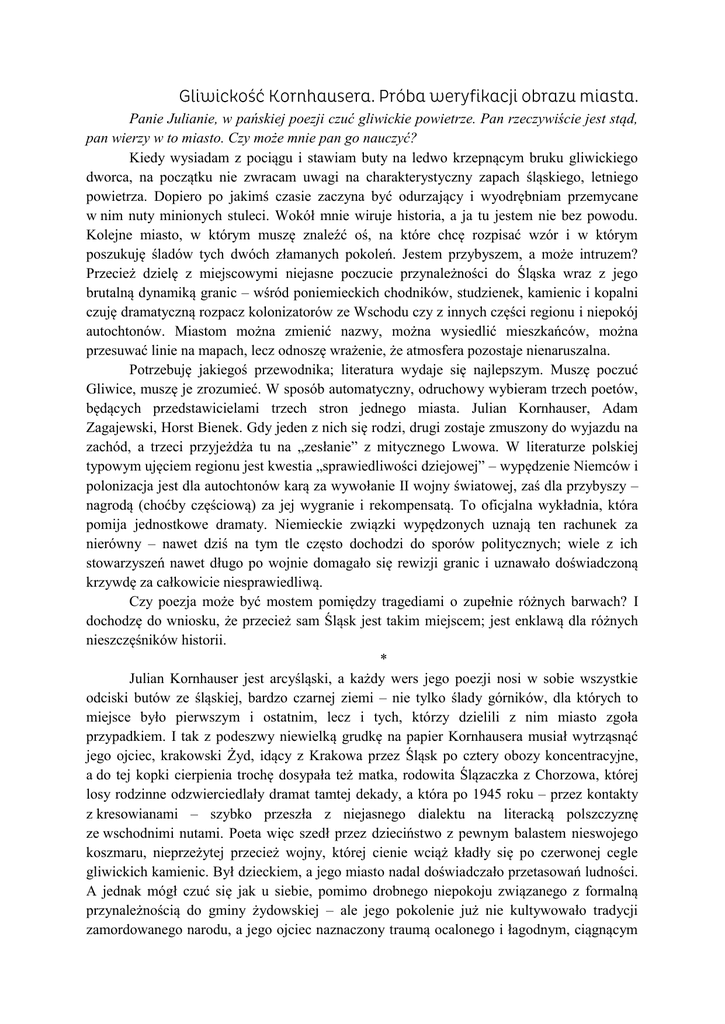 Panie Julianie, w pańskiej poezji czuć gliwickie powietrze. Pan rzeczywiście jest stąd, pan wierzy w to miasto. Czy może mnie pan go nauczyć? Kiedy wysiadam z pociągu i stawiam buty na ledwo krzepnącym bruku gliwickiego dworca, na początku nie zwracam uwagi na charakterystyczny zapach śląskiego, letniego powietrza. Dopiero po jakimś czasie zaczyna być odurzający i wyodrębniam przemycane w nim nuty minionych stuleci. Wokół mnie wiruje historia, a ja tu jestem nie bez powodu. Kolejne miasto, w którym muszę znaleźć oś, na które chcę rozpisać wzór i w którym poszukuję śladów tych dwóch złamanych pokoleń. Jestem przybyszem, a może intruzem? Przecież dzielę z miejscowymi niejasne poczucie przynależności do Śląska wraz z jego brutalną dynamiką granic – wśród poniemieckich chodników, studzienek, kamienic i kopalni czuję dramatyczną rozpacz kolonizatorów ze Wschodu czy z innych części regionu i niepokój autochtonów. Miastom można zmienić nazwy, można wysiedlić mieszkańców, można przesuwać linie na mapach, lecz odnoszę wrażenie, że atmosfera pozostaje nienaruszalna. Potrzebuję jakiegoś przewodnika; literatura wydaje się najlepszym. Muszę poczuć Gliwice, muszę je zrozumieć. W sposób automatyczny, odruchowy wybieram trzech poetów, będących przedstawicielami trzech stron jednego miasta. Julian Kornhauser, Adam Zagajewski, Horst Bienek. Gdy jeden z nich się rodzi, drugi zostaje zmuszony do wyjazdu na zachód, a trzeci przyjeżdża tu na „zesłanie” z mitycznego Lwowa. W literaturze polskiej typowym ujęciem regionu jest kwestia „sprawiedliwości dziejowej” – wypędzenie Niemców i polonizacja jest dla autochtonów karą za wywołanie II wojny światowej, zaś dla przybyszy – nagrodą (choćby częściową) za jej wygranie i rekompensatą. To oficjalna wykładnia, która pomija jednostkowe dramaty. Niemieckie związki wypędzonych uznają ten rachunek za nierówny – nawet dziś na tym tle często dochodzi do sporów politycznych; wiele z ich stowarzyszeń nawet długo po wojnie domagało się rewizji granic i uznawało doświadczoną krzywdę za całkowicie niesprawiedliwą. Czy poezja może być mostem pomiędzy tragediami o zupełnie różnych barwach? I dochodzę do wniosku, że przecież sam Śląsk jest takim miejscem; jest enklawą dla różnych nieszczęśników historii. * Julian Kornhauser jest arcyśląski, a każdy wers jego poezji nosi w sobie wszystkie odciski butów ze śląskiej, bardzo czarnej ziemi – nie tylko ślady górników, dla których to miejsce było pierwszym i ostatnim, lecz i tych, którzy dzielili z nim miasto zgoła przypadkiem. I tak z podeszwy niewielką grudkę na papier Kornhausera musiał wytrząsnąć jego ojciec, krakowski Żyd, idący z Krakowa przez Śląsk po cztery obozy koncentracyjne, a do tej kopki cierpienia trochę dosypała też matka, rodowita Ślązaczka z Chorzowa, której losy rodzinne odzwierciedlały dramat tamtej dekady, a która po 1945 roku – przez kontakty z kresowianami – szybko przeszła z niejasnego dialektu na literacką polszczyznę ze wschodnimi nutami. Poeta więc szedł przez dzieciństwo z pewnym balastem nieswojego koszmaru, nieprzeżytej przecież wojny, której cienie wciąż kładły się po czerwonej cegle gliwickich kamienic. Był dzieckiem, a jego miasto nadal doświadczało przetasowań ludności. A jednak mógł czuć się jak u siebie, pomimo drobnego niepokoju związanego z formalną przynależnością do gminy żydowskiej – ale jego pokolenie już nie kultywowało tradycji zamordowanego narodu, a jego ojciec naznaczony traumą ocalonego i łagodnym, ciągnącym się latami smutkiem nie wyróżniał się z tłumu jako Żyd. Młody Kornhauser oswajał to bez większych problemów i z czasem poczuł, że ta egzotyka miasta jest całkiem kusząca. I Gliwice były całkowicie jego. Wrastał w nie od urodzenia i był śląskim Polakiem. (Pod tym samym niebem, w powtarzalnej sekwencji podobnych ulic, kresowych przyśpiewek słuchał starszy o rok Adam Zagajewski; zaś z dala od tego przymglonego dymem nieba młody Horst Bienek uparcie tęsknił do Gleiwitz, które stracił bezpowrotnie, nawet się nie łudząc, że jeszcze je zobaczy) Słowa Kornhausera – zwłaszcza z wczesnych tomów – są przepełnione robotniczym zmęczeniem, ironią, brakiem zaufania wobec szeroko rozumianej elity, bezwzględną wiarą w odwieczne wartości. Wykluwa się z nich obraz najszczerszego wobec siebie i realiów gliwiczanina, który – niezależnie od pochodzenia i zajęcia – jest wręcz przebity specyfiką miejsca zamieszkania. Poeta dostał miasto i przyjął je bez wahania; wrósł w nie, zrozumiał na wskroś, jest krainą jego dzieciństwa i przestrzenią dorosłości. Nie tkwią tam wprawdzie jego korzenie, ale nie pochyla się nad tym w swoich wierszach, w zasadzie rzadko nawiązując do rodziny. I wyczuwa pewien dysonans, którego może być elementem: rozłam na dwie opowieści o Gliwicach. W 2007 roku opublikowany został tom „Origami”, dopieszczony w formie, choć minimalistyczny. Wiersze te są krótkie, oszczędne, koncentrują się zwykle na uważnej obserwacji natury, otoczenia i społeczeństwa. Kornhauser czasem zagłębia się we własną przeszłość, nie znajduje swojego nazwiska na liście internowanych1, jest na swoim miejscu, choć daleko od siebie2. I dedykuje Wolfgangowi Bittnerowi utwór „Na ulicy mojego dzieciństwa”. To swoiste podanie ręki ponad granicą i rozpadem historii; Wolfgang Bittner jest niewiele starszy od Kornhausera i urodził się w Gliwicach, z których został wypędzony jako dziecko. Tak oto poprowadzona zostaje nić pomiędzy dwiema narracjami – wypędzonych i pozostawionych. Zresztą już w pierwszym wersie Kornhauser wdaje się w polemikę z tytułem – „czy mojego?”. Przypisuje dzieciństwo raczej epoce, krótkiemu przystankowi w dziejach świata, kiedy nie rozumie się drastycznie p