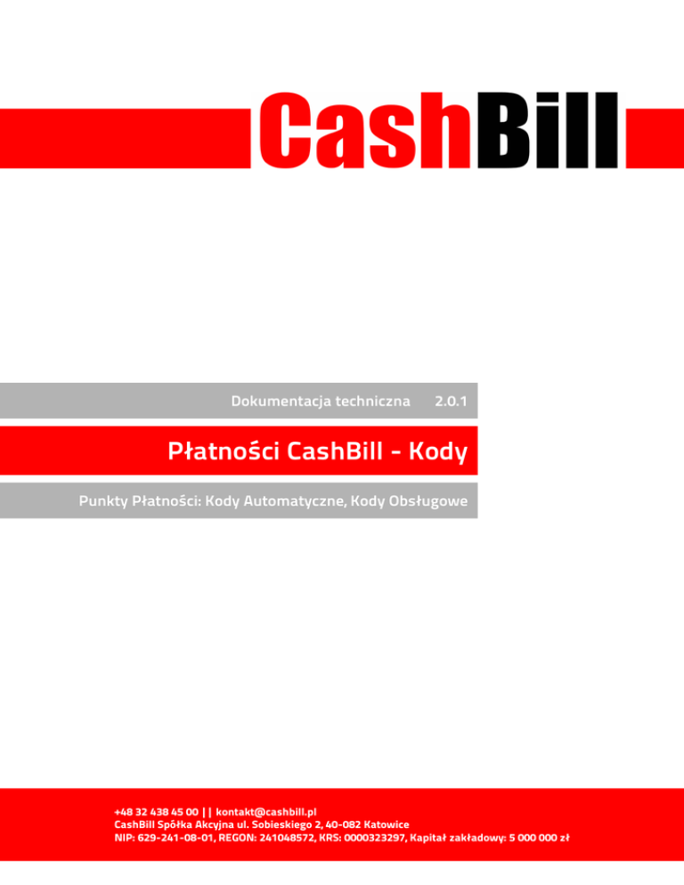 Dokumentacja techniczna 2.0.1 Płatności CashBill - Kody Punkty Płatności: Kody Automatyczne, Kody Obsługowe +48 32 438 45 00 || [email protected] CashBill Spółka Akcyjna ul. Sobieskiego 2, 40-082 Katowice NIP: 629-241-08-01, REGON: 241048572, KRS: 0000323297, Kapitał zakładowy: 5 000 000 zł Płatności CashBill - Kody Spis treści 1 Kody Automatyczne........................................................................................................................ 3 1.1 Procedura uruchomienia usługi............................................................................................... 3 1.2 Proces inicjalizacji nowej transakcji......................................................................................... 4 1.3 Opis metody sprawdzenia poprawności kodu........................................................................4 2 Kody Obsługowe............................................................................................................................. 5 2.1 Procedura uruchomienia usługi............................................................................................... 5 2.2 Proces inicjalizacji nowej transakcji......................................................................................... 6 3 Historia zmian................................................................................................................................. 6 2 Płatności CashBill - Kody 1 Kody Automatyczne Usługa Punktu Płatności, Kody Automatyczne daje możliwość pozyskania płatnego dostępu do witryny www o ustalonej wartości i czasie ważności. Obsługa i weryfikacja kodów leży po stronie systemu CashBill. Udostępniany jest gotowy skrypt do umieszczenia na serwis internetowym, niezbędny do weryfikacji poprawności wpisywanego kodu dostępu. 1.1 Procedura uruchomienia usługi Użytkownik składa wniosek o zawarcie Umowy Płatności poprzez wypełnienie formularza zgłoszenia Punktu Płatności. Formularz dostępny jest w systemie CashBill w menu „Płatności Internetowe/dodaj nową usługę”. Z sekcji „Dodaj nową usługę płatności” należy wybrać „Punkt Płatności Kody Automatyczne”. W celu uruchomienia usługi należy uzupełnić następujące dane: parametr opis Identyfikator Punktu Płatności Parametr na podstawie adres sklepu, przykład: „example.com” lub „example.com(kodyVIP)” Opis Punktu Płatności Opis towaru lub usługi jakiej dotyczy transakcja Adres powrotu przeglądarki Adres URL, na który zostanie przekierowana przeglądarka klienta po sfinalizowaniu transakcji Cena zakupu kodu Koszt zakupu kodu wyrażony w kwocie brutto Czas ważności kodu Okres ważności kodu (przedział czasowy od momentu aktywacji kodu) wyrażony w sekundach. W przypadku ustawienia czasu ważności na 0, przydzielony kod jest kodem jednorazowym Adres emailowego potwierdzenia transakcji Adres email, na który system CashBill wyśle powiadomienie dotyczące zmiany statusu transakcji Wypełnienie formularza wniosku należy zakończyć kliknięciem przycisku „uruchom usługę”. Wniosek o uruchomienie Punktu Płatności zostanie przesłany do akceptacji. Od tego momentu, Punkt Płatności jest widoczny w liście „Płatności internetowe/punkty płatności”. Oznaczenie „[oczekuje na zatwierdzenie]” oznacza iż do pełnego uruchomienia sprzedaży konieczna jest weryfikacja punktu przez personel Cashbill. Kody Automatyczne 3 Płatności CashBill - Kody 1.2 Proces inicjalizacji nowej transakcji Inicjalizacja nowej transakcji polega na przekierowaniu przeglądarki klienta z określonymi danymi na adres: https://pay.cashbill.pl/code/paycode.php?id=id gdzie: parametr opis id identyfikator Punktu Płatności Po pozytywnej autoryzacji transakcji klientowi zostanie wysłany na podany w procesie płatności adres e-mail wygenerowany kod dostępu do serwisu. 1.3 Opis metody sprawdzenia poprawności kodu Aby sprawdzić poprawność wpisanego przez użytkownika serwisu kodu, należy wysłać zapytanie metodą GET na adres URL: https://pay.cashbill.pl/code/backcode_check.php?id=id&check=check podając odpowiednie parametry żądania. Parametry żądania: parametr opis id identyfikator Punktu Płatności check wpisany przez użytkownika kod do sprawdzenia W odpowiedzi na tak wysłane żądanie możliwe są następujące odpowiedzi: ERROR Podany kod jest nieprawidłowy lub minął termin jego ważności Kody Automatyczne 4 Płatności CashBill - Kody OK ilosc_sekund Podany kod jest prawidłowy i aktywny. Do końca ważności kodu pozostało ilosc_sekund sekund 2 Kody Obsługowe Punkt Płatności, Kody Obsługowe to usługa pozwalająca na realizację płatnego dostępu do serwisu www na zasadzie kodów. Właściciel usługi sam generuje paczki kodów w panelu systemu CashBill, a następnie obsługuje je po swojej stronie, weryfikując ich poprawność. 2.1 Procedura uruchomienia usługi Użytkownik składa wniosek o zawarcie Umowy Płatności poprzez wypełnienie formularza zgłoszenia Punktu Płatności. Formularz dostępny jest w systemie CashBill w menu „Płatności Internetowe/dodaj nową usługę”. Z sekcji „Dodaj nową usługę płatności” należy wybrać „Punkt Płatności Kody Obsługowe”. W celu uruchomienia usługi należy uzupełnić następujące dane: parametr opis Identyfikator Punktu Płatności Parametr na podstawie adres sklepu, przykład: „example.com” lub „example.com(kodyVIP)” Opis Punktu Płatności Opis towaru lub usługi jakiej dotyczy transakcja Adres powrotu przeglądarki Adres URL, na który zostanie przekierowana przeglądarka klienta po sfinalizowaniu transakcji Cena zakupu kodu Koszt zakupu kodu wyrażony w kwocie brutto Adres e-mailowego potwierdzenia transakcji Adres e-mail, na który system CashBill wyśle powiadomienie dotyczące zmiany statusu transakcji Wypełnienie formularza wniosku należy zakończyć kliknięciem przycisku „uruchom usługę”. Wniosek o uruchomie