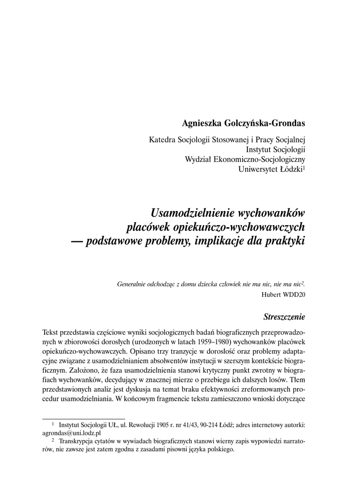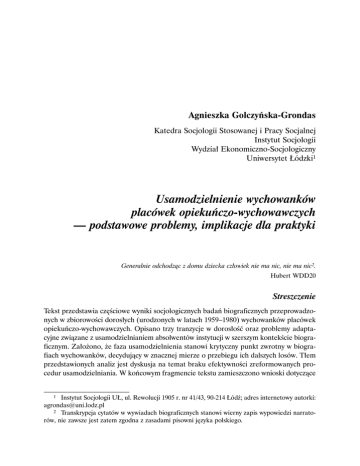 Agnieszka Golczyńska-Grondas Katedra Socjologii Stosowanej i Pracy Socjalnej Instytut Socjologii Wydział Ekonomiczno-Socjologiczny Uniwersytet Łódzki1 Usamodzielnienie wychowanków placówek opiekuńczo-wychowawczych — podstawowe problemy, implikacje dla praktyki Generalnie odchodząc z domu dziecka człowiek nie ma nic, nie ma nic2. Hubert WDD20 Streszczenie Tekst przedstawia częściowe wyniki socjologicznych badań biograficznych przeprowadzonych w zbiorowości dorosłych (urodzonych w latach 1959–1980) wychowanków placówek opiekuńczo-wychowawczych. Opisano trzy tranzycje w dorosłość oraz problemy adaptacyjne związane z usamodzielnianiem absolwentów instytucji w szerszym kontekście biograficznym. Założono, że faza usamodzielnienia stanowi krytyczny punkt zwrotny w biografiach wychowanków, decydujący w znacznej mierze o przebiegu ich dalszych losów. Tłem przedstawionych analiz jest dyskusja na temat braku efektywności zreformowanych procedur usamodzielniania. W końcowym fragmencie tekstu zamieszczono wnioski dotyczące 1 Instytut Socjologii UŁ, ul. Rewolucji 1905 r. nr 41/43, 90-214 Łódź; adres internetowy autorki: [email protected] 2 Transkrypcja cytatów w wywiadach biograficznych stanowi wierny zapis wypowiedzi narratorów, nie zawsze jest zatem zgodna z zasadami pisowni języka polskiego. Agnieszka Golczyńska-Grondas 78 zasadności wprowadzenia w praktykę instytucjonalną innowacyjnego modelu usamodzielnienia opartego na pracy asystenta usamodzielnienia. Słowa kluczowe: wychowankowie placówek opiekuńczo-wychowawczych, usamodzielnienie, asystent usamodzielnienia, badania biograficzne Wprowadzenie Mimo niżu demograficznego, w ostatnich latach stale rośnie liczba dzieci objętych w Polsce różnymi formami pieczy zastępczej. Liczba dzieci w placówkach opiekuńczo-wychowawczych utrzymuje się na dość wysokim poziomie około 20 tys. osób3; co roku w dorosłość wkracza około 2 tys. pełnoletnich wychowanków takich instytucji4 (2,3 tys. w roku 2013) (Pomoc społeczna i opieka… 2014, s. 34, 36). Sytuacja wchodzących w dorosłe życie „absolwentów” placówek jest w wielu wymiarach odmienna od sytuacji ich rówieśników wychowywanych w „wystarczająco dobrych rodzinach”. Ci pierwsi, obciążeni traumatycznymi przeżyciami z wcześniejszych lat życia, pozbawieni są jakichkolwiek zasobów materialnych. Mają ograniczone możliwości korzystania z czyjegokolwiek wsparcia; dysfunkcje rodziny prokreacji były przeważnie bezpośrednim powodem instytucjonalizacji, co więcej — więzi z bliskimi, także z „pierwotnym” środowiskiem sąsiedzkim, mogły ulec w okresie pobytu dziecka w placówce rozluźnieniu, a nawet destrukcji. Kapitał społeczny, jakim byli wychowankowie dysponują u progu dorosłości, jest więc znikomy. Ponadto, przez wiele lat podopieczni polskich placówek, zaspokajających wszystkie ich potrzeby bytowe, w znikomym stopniu byli przygotowywani emocjonalnie i zadaniowo do samodzielnego życia. Proces usamodzielnienia wychowanków instytucji przyciąga w ostatnich latach uwagę nie tylko badaczy zainteresowanych rezultatami trwającej od końca lat 90. XX w. reformy systemu opieki nad dziećmi i młodzieżą, ale także bezpośrednich wykonawców zadań polityki społecznej — pracowników instytucji samorządowych, organizacji pozarządowych oraz organów władzy państwowej. Zrealizowane w połowie pierwszej dekady XXI w. projekty badawcze i ekspertyzy (Informacja o wynikach kontroli… 2001; Sokołowska 2004; Kwak 2006; Giermanowska, Racław-Markowska 2007; Kaczmarek 2007) oraz przeprowadzona w 2014 r. kontrola NIK (Informacja o wynikach kontroli… 2014) wykazały, że wdrożone w 2004 r. procedury usamodzielnienia (uaktualnione w 2012 r. ustawą o wspieraniu rodziny i systemie pieczy zastępczej5), z założenia obejmujące poza świadczeniami mateW latach 2005–2008 obserwowano niewielką tendencją spadkową (20 190 dzieci w instytucjach w 2005 r., 19 271 w roku 2008). Od 2009 r. liczba ta ulega wahaniom, w 2013 r. w placówkach przebywało 19 252 dzieci i nastolatków. Liczba dzieci objętych różnymi formami rodzinnej pieczy zastępczej w tym samym okresie stale wzrastała (49 667 w 2005 r., 57 820 w 2013 r.) (Pomoc społeczna i opieka… 2014, s. 31). 4 Oraz około 3 tys. wychowanków spokrewnionych i niespokrewnionych rodzin zastępczych i rodzinnych domów dziecka (3,3 tys. w 2013 r.) (Pomoc społeczna i opieka… 2014, s. 34, 36). 5 Obecnie wychowankowie są usamodzielniani na podstawie dwóch ustaw — o pomocy społecznej oraz o wspieraniu rodziny i systemie pieczy zastępczej. W raporcie NIK stwierdza się: „Ustawa o pieczy zastępczej nie precyzuje wielu ważnych kwestii, uregulowanych poprzednio w ustawie 3 Usamodzielnienie wychowanków placówek opiekuńczo-wychowawczych… 79 rialnymi także pomoc o charakterze doradczym, w pełni nie zaspokajają potrzeb osób usamodzielnianych nawet w wymiarze ekonomicznym. We wzmiankowanych opracowaniach wskazuje się na: niedostatek zasobów mieszkaniowych6, ograniczanie pomocy materialnej ze względu na brak środków finansowych powiatów, nieprzygotowanie kadr pomocy społecznej do udzielania wychowankom pomocy pozamaterialnej i sporadyczność tej ostatniej formy, formalizację funkcji opiekuna usamodzielnienia oraz zbyt późne rozpoczynanie programów usamodzielnienia. Nadto, część osób opuszczających placówki nie jest objęta żadnymi oddziaływaniami pomocowymi lub też rezygnuje z procedury usamodzielnienia. W literaturze wskazuje się także na brak monitoringu losów podopiecznych, w tym braki w bazach danych uniemożliwiające prowadzenie pogłębionych analiz, zwłaszcza w dłuższej perspektywie temporalnej (Giermanowska, Racław-Markowska 2007, s. 151, 154; Informacja o wynikach kontroli… 2014). Niniejszy artykuł w sposób szczególny wypełnia tę lukę, opiera się bowiem na badaniach przeprowadzonych w latach 2011–2013 z d