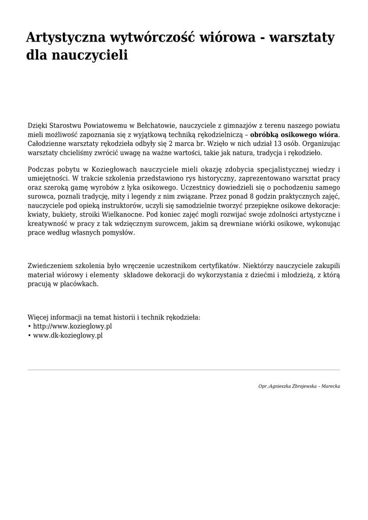 Artystyczna wytwórczość wiórowa - warsztaty dla nauczycieli Dzięki Starostwu Powiatowemu w Bełchatowie, nauczyciele z gimnazjów z terenu naszego powiatu mieli możliwość zapoznania się z wyjątkową techniką rękodzielniczą – obróbką osikowego wióra. Całodzienne warsztaty rękodzieła odbyły się 2 marca br. Wzięło w nich udział 13 osób. Organizując warsztaty chcieliśmy zwrócić uwagę na ważne wartości, takie jak natura, tradycja i rękodzieło. Podczas pobytu w Koziegłowach nauczyciele mieli okazję zdobycia specjalistycznej wiedzy i umiejętności. W trakcie szkolenia przedstawiono rys historyczny, zaprezentowano warsztat pracy oraz szeroką gamę wyrobów z łyka osikowego. Uczestnicy dowiedzieli się o pochodzeniu samego surowca, poznali tradycję, mity i legendy z nim związane. Przez ponad 8 godzin praktycznych zajęć, nauczyciele pod opieką instruktorów, uczyli się samodzielnie tworzyć przepiękne osikowe dekoracje: kwiaty, bukiety, stroiki Wielkanocne. Pod koniec zajęć mogli rozwijać swoje zdolności artystyczne i kreatywność w pracy z tak wdzięcznym surowcem, jakim są drewniane wiórki osikowe, wykonując prace według własnych pomysłów. Zwieńczeniem szkolenia było wręczenie uczestnikom certyfikatów. Niektórzy nauczyciele zakupili materiał wiórowy i elementy składowe dekoracji do wykorzystania z dziećmi i młodzieżą, z którą pracują w placówkach. Więcej informacji na temat historii i technik rękodzieła: • http://www.kozieglowy.pl • www.dk-kozieglowy.pl Opr.:Agnieszka Zbrojewska – Marecka