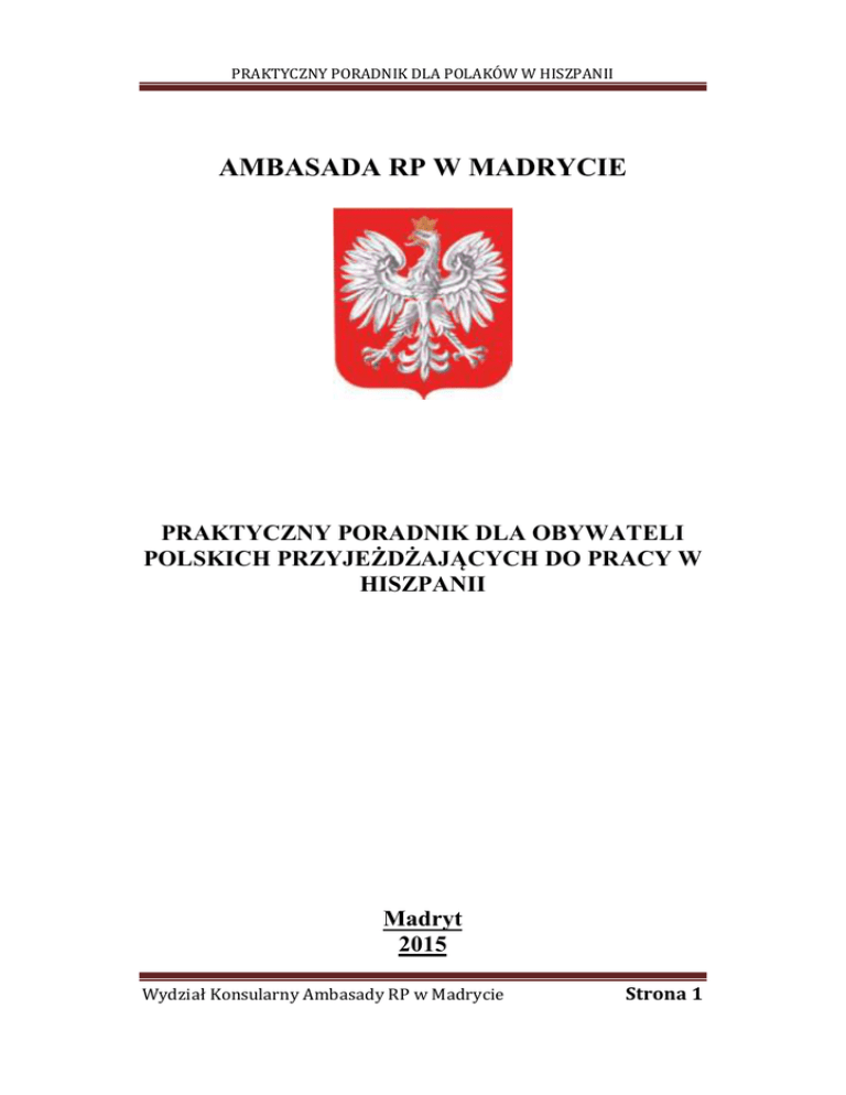PRAKTYCZNY PORADNIK DLA POLAKÓW W HISZPANII AMBASADA RP W MADRYCIE PRAKTYCZNY PORADNIK DLA OBYWATELI POLSKICH PRZYJEŻDŻAJĄCYCH DO PRACY W HISZPANII Madryt 2015 Wydział Konsularny Ambasady RP w Madrycie Strona 1 PRAKTYCZNY PORADNIK DLA POLAKÓW W HISZPANII 1. HISZPANIA. INFORMACJE POSTAWOWE. 2. 2.1. 2.2. 2.3. WJAZD NA TERYTORIUM HISZPANII. System prawny Informacje praktyczne dla przyjeżdżających Święta w Hiszpanii 3. 3.1. 3.2. 3.3. PRAWO POBYTOWE. Pobyt do trzech miesięcy Meldunek Pobyt powyżej trzech miesięcy 4. 4.1. 4.2. 4.3. 4.4. 4.5. 4.6. PRACA I PODATKI W HISZPANII. Ostrzeżenie przed fałszywymi ofertami pracy Podstawowe zasady prawa pracy Praca sezonowa Pomoc w sytuacji sporu z pracodawcą Opodatkowanie dochodów z pracy w Hiszpanii Polsko-hiszpańska umowa o unikaniu podwójnego opodatkowania 5. 5.1. 5.2. 5.3. 5.4. 5.5. 5.6. 5.7. ŚWIADCZENIA SOCJALNE. Zasiłek rodzinny Zasiłek rodzinny wyrównawczy Zasiłek dla bezrobotnych Zasiłek doraźny Świadczenie przedemerytalne Zasiłek przejściowy Transfer zasiłków dla bezrobotnych z Polski do krajów UE, w których poszukuje się pracy Wydział Konsularny Ambasady RP w Madrycie Strona 2 PRAKTYCZNY PORADNIK DLA POLAKÓW W HISZPANII 6. SŁUŻBA ZDROWIA. 6.1. Korzystanie z hiszpańskiej służby zdrowia przez osoby zamieszkujące na stałe. 6.2. Ubezpieczenie przy pobytach turystycznych 7. SZKOŁA W HISZPANII. 7.1. Organizacja systemu szkolnictwa 7.2. Polonijne szkoły sobotnie 8. INFORMACJE DLA KIEROWCÓW I POSIADACZY SAMOCHODÓW. 8.1. Obowiązek przerejestrowania samochodu 8.2. Podstawowe zasady dot. korzystania z samochodu i dróg w Hiszpanii 9. PRZYDATNE INFORMACJE I ADRESY. 9.1. Przepisy celne 9.2. Bezpieczeństwo 10. ADRESY POLSKICH PRZEDSTAWICIELSTW DYPLOMATYCZNYCH I KONSULARNYCH W HISZPANII. Uwaga: Niniejsze opracowanie jest jedynie materiałem informacyjno-promocyjnym i nie ma mocy prawnej. Wydział Konsularny Ambasady RP w Madrycie nie ponosi odpowiedzialności za skutki decyzji i działań podjętych na podstawie zawartych w nim informacji. Moc wiążącą posiadają jedynie hiszpańskie przepisy w języku hiszpańskim. Wydział Konsularny Ambasady RP w Madrycie Strona 3 PRAKTYCZNY PORADNIK DLA POLAKÓW W HISZPANII 1. HISZPANIA. INFORMACJE POSTAWOWE Stolica: Madryt Obszar: 504.645 km Ludność: 47, 021 mln Waluta: euro (EUR) Królestwo Hiszpanii jest monarchią konstytucyjną, której głową jest Król Filip VI. Administracyjnie Hiszpania podzielona jest na 17 wspólnot autonomicznych (las Comunidades Autónomas): Andaluzja (Andalucía), Aragonia (Aragón), Asturia (Asturias), Baleary (Islas Baleares), Estremadura (Extremadura), Galicja (Galicia), Kantabria (Cantabria), Kastylia La Mancha (Castilla-La Mancha), Kastylia-León (Castilla y León), Katalonia (Cataluña), Kraj Basków (País Vasco), La Rioja (La Rioja), Madryt (Madrid), Murcja (Murcia), Nawarra (Navarra), Walencja (Valencia) oraz Wyspy Kanaryjskie (Islas Canarias). Istnieją także dwa hiszpańskie miasta autonomiczne położone na terytorium afrykańskim: Ceuta i Melilla. Wspólnoty autonomiczne cieszą się różnego rodzaju odrębnością administracyjną i prawną, najbardziej niezależne są: Katalonia i Kraj Basków. Językiem urzędowym w całej Hiszpanii jest język kastylijski. Oprócz tego w Katalonii, Walencji i na Balearach oficjalnym językiem obok hiszpańskiego jest kataloński, w Kraju Basków i na północy Nawarry – baskijski, a w Galicji – galicyjski. Bez podstawowej chociażby znajomości języka hiszpańskiego nie ma możliwości funkcjonowania zarówno na rynku pracy, jak Wydział Konsularny Ambasady RP w Madrycie Strona 4 PRAKTYCZNY PORADNIK DLA POLAKÓW W HISZPANII i w życiu codziennym. Znajomość języka angielskiego jest zdecydowanie nieprzydatna i nie wystarcza do załatwiania spraw w urzędach i z pracodawcą. Najważniejsze telefony alarmowe: Ogólny telefon alarmowy 112 Informacja telefoniczna 11811 Ogólnokrajowa Informacja (ruch drogowy, mandaty, numery telefonów administracji publicznej, etc.) 060 Numery telefonów na policję, straż pożarną i pogotowie różnią się w zależności od regionu autonomicznego. 2. WJAZD NA TERYTORIUM HISZPANII Obywatele polscy korzystają z prawa do swobodnego przepływu osób w ramach Unii Europejskiej oraz Europejskiego Obszaru Gospodarczego. Dokumentem podróży uprawniającym do wjazdu i pobytu nieprzekraczającego 3 miesięcy (niezależnie od jego celu) na terytorium Hiszpanii jest paszport lub dowód osobisty. Przed wyjazdem należy się upewnić, czy dokument jest ważny, w wystarczająco dobrym stanie i czy pozwala na potwierdzenie tożsamości. Wydział Konsularny Ambasady RP w Madrycie Strona 5 PRAKTYCZNY PORADNIK DLA POLAKÓW W HISZPANII 2.1. System prawny. Hiszpania jest państwem podzielonym na gminy, prowincje i wspólnoty autonomiczne. System prawny po zmianach ustrojowych zapadłych po 1975 r. opiera się na Konstytucji z dnia 6 grudnia 1978 r. Wspólnoty autonomiczne cieszą się dużą samodzielnością, jednakże nie posiadają uprawnień konstytucyjnych ani suwerenności. Każda ze wspólnot posiada swój statut, który określa podział kompetencji między administracją centralną a władzą terenową. Posiadają one także własne parlamenty i rządy. Należy mieć na uwadze, że duża część kwestii życia publicznego a nawet prywatnego i rodzinnego w przypadku niektórych wspólnot (tzw. „derecho foral”) regulowana jest na poziomie konkretnej wspólnoty autonomicznej. Obywatel polski przebywający w Hiszpanii nie tylko ponosi przewidziane tutejszym prawem konsekwencje drobnych wykroczeń. W przypadku popełnienia czynu karalnego będzie sądzony przed hiszpańskim sądem na podstawie tutejszego prawa, zaś ewentualną karę będzie odbywać w miejscowym więzieniu. Miejscowe przepisy będą miały również zastosowanie w sprawach regulowanych prawem cywilnym – np. w zakresie stosunków pomiędzy rodzicami i dziećmi zamieszkałymi legalnie n