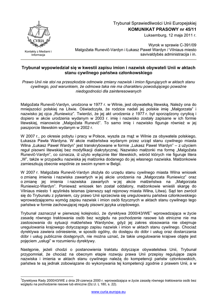 Trybunał Sprawiedliwości Unii Europejskiej KOMUNIKAT PRASOWY nr 45/11 Luksemburg, 12 maja 2011 r. Kontakty z Mediami i Informacja Wyrok w sprawie C-391/09 Malgožata Runevič-Vardyn i Łukasz Paweł Wardyn / Vilniaus miesto savivaldybės administracija i in. Trybunał wypowiedział się w kwestii zapisu imion i nazwisk obywateli Unii w aktach stanu cywilnego państwa członkowskiego Prawo Unii nie stoi na przeszkodzie odmowie zmiany nazwisk i imion figurujących w aktach stanu cywilnego, pod warunkiem, że odmowa taka nie ma charakteru powodującego poważne niedogodności dla zainteresowanych Malgožata Runevič-Vardyn, urodzona w 1977 r. w Wilnie, jest obywatelką litewską. Należy ona do mniejszości polskiej na Litwie. Oświadczyła, że rodzice nadali jej polskie imię „Małgorzata” i nazwisko jej ojca „Runiewicz”. Twierdzi, że jej akt urodzenia z 1977 r. był sporządzony cyrylicą i dopiero w akcie urodzenia wydanym w 2003 r. imię i nazwisko zostały zapisane w ich formie litewskiej, mianowicie „Malgožata Runevič”. To samo imię i nazwisko figuruje również w jej paszporcie litewskim wydanym w 2002 r. W 2007 r., po okresie pobytu i pracy w Polsce, wyszła za mąż w Wilnie za obywatela polskiego, Łukasza Pawła Wardyna. W akcie małżeństwa wydanym przez urząd stanu cywilnego miasta Wilna „Łukasz Paweł Wardyn” jest transkrybowane w formie „Lukasz Pawel Wardyn” – z użyciem reguł pisowni litewskiej bez modyfikacji diakrytycznej. Nazwisko małżonki ma formę „Malgožata Runevič-Vardyn”, co oznacza, iż użyto wyłącznie liter litewskich, wśród których nie figuruje litera „W”, także w przypadku nazwiska jej małżonka dodanego do jej własnego nazwiska. Małżonkowie zamieszkują obecnie wspólnie ze swoim synem w Belgii. W 2007 r. Malgožata Runevič-Vardyn złożyła do urzędu stanu cywilnego miasta Wilna wniosek o zmianę imienia i nazwiska zawartych w jej akcie urodzenia na „Małgorzata Runiewicz” oraz o zmianę jej imienia i nazwiska zawartych w jej akcie małżeństwa na „Małgorzata Runiewicz-Wardyn”. Ponieważ wniosek ten został oddalony, małżonkowie wnieśli skargę do Vilniaus miesto 1 apylinkės teismas (pierwszy sąd rejonowy miasta Wilna, Litwa). Sąd ten zwrócił się do Trybunału z pytaniem, czy prawo Unii sprzeciwia się uregulowaniu państwa członkowskiego wprowadzającemu wymóg zapisu nazwisk i imion osób fizycznych w aktach stanu cywilnego tego państwa w formie zachowującej reguły pisowni języka urzędowego. Trybunał zaznaczył w pierwszej kolejności, że dyrektywa 2000/43/WE1 wprowadzająca w życie zasadę równego traktowania osób bez względu na pochodzenie rasowe lub etniczne nie ma zastosowania do sytuacji małżeństwa Wardynów, gdyż jej zakres stosowania nie obejmuje uregulowania krajowego dotyczącego zapisu nazwisk i imion w aktach stanu cywilnego. Chociaż dyrektywa zawiera odniesienie, w sposób ogólny, do dostępu do dóbr i usług oraz dostarczania dóbr i usług publicznie dostępnych, nie można uznać, że takie uregulowanie krajowe objęte jest pojęciem „usługi” w rozumieniu dyrektywy. Następnie, jeżeli chodzi o postanowienia traktatu dotyczące obywatelstwa Unii, Trybunał przypomniał, że chociaż na obecnym etapie rozwoju prawa Unii przepisy regulujące zapis nazwiska i imienia w aktach stanu cywilnego należą do kompetencji państw członkowskich, państwa te są jednak zobowiązane do wykonywania tej kompetencji zgodnie z prawem Unii, a w 1 Dyrektywa Rady 2000/43/WE z dnia 29 czerwca 2000 r. wprowadzająca w życie zasadę równego traktowania osób bez względu na pochodzenie rasowe lub etniczne (Dz.U. L 180, s. 22). www.curia.europa.eu szczególności postanowieniami traktatu dotyczącymi przyznanej każdemu obywatelowi Unii swobody przemieszczania się i pobytu na terytorium państw członkowskich. Trybunał zauważył, że imię i nazwisko osoby jest jednym z elementów składowych jej tożsamości i życia prywatnego, które podlegają ochronie na podstawie Karty praw podstawowych Unii Europejskiej oraz europejskiej Konwencji o ochronie praw człowieka i podstawowych wolności. Trybunał wypowiedział się w kwestii złożonego przez Malgožatę Runevič-Vardyn wniosku o zmianę jej imienia i nazwiska panieńskiego w litewskich aktach stanu cywilnego. I tak, w sytuacji gdy obywatel Unii przemieszcza się do innego państwa członkowskiego i następnie zawiera związek małżeński w tym państwie, fakt, iż nazwisko i imię tego obywatela noszone przed zawarciem małżeństwa mogą być zmienione i zapisane w aktach stanu cywilnego jego państwa pochodzenia wyłącznie literami języka tego państwa członkowskiego, nie może stanowić traktowania mniej korzystnego niż to, które przysługiwało mu przed skorzystaniem z wprowadzonych traktatem ułatwień w zakresie swobodnego przemieszczania się osób. W konsekwencji brak takiego prawa nie może zniechęcić obywatela Unii do wykonywania prawa do przemieszczania się przyznanych w traktacie i nie stanowi ograniczenia w tym zakresie. W odniesieniu do wniosku małżonków o zmianę, w litewskim akcie małżeństwa, nazwiska Ł. P. Wardyna dodanego do nazwiska panieńskiego jego małżonki (Wardyn zamiast Vardyn), Trybunał nie wykluczył, że odmowa dokonania takiej zmiany może powodować niedogodności dla zainteresowanych. Niemniej jednak odmowa taka może stanowić ograniczenie swobód przyznanych w traktacie wyłącznie, jeżeli ma charakter powodujący dla zainteresowanych „poważne niedogodności” na płaszczyźnie administracyjnej, zawodowej i prywatnej. Do sądu krajowego należy ustalenie, czy odmowa zmiany wspólnego nazwiska małżonków może powodować dla zainteresowanych takie niedogodności. Jeżeli ma to miejsce, oznacza to ograniczenie swobód przyznanych w traktacie każdemu obywatelowi Unii. Do sądu krajowego należy również ustalenie, czy odmowa taka uwzględnia słuszną 