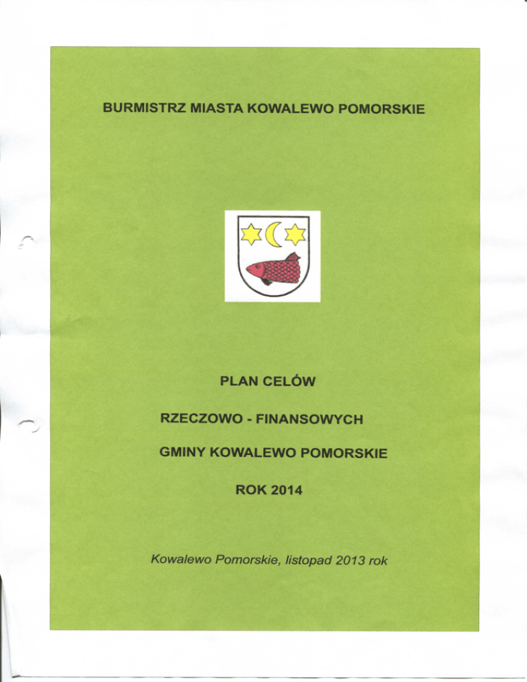 BURMISTRZ MIASTA K O W A L E W O P O M O R S K I E PLAN CEL6W RZECZOWO - FINANSOWYCH GMINY K O W A L E W O P O M O R S K I E R O K 2014 Kowalewo Pomorskie, listopad 2013 rok Panie Przewodniczący, Wysoka Rado Przedkładam Państwu projekt budżetu na rok 2014 wraz z częścią informacyjną o planowanych zadaniach z prośbą o jego analizę i zatwierdzenie ich realizacji. Zaproponowane Wysokiej Radzie zadania wynikają z rozpoznania potrzeb naszej społeczności, są konsekwencją nałożonych na Gminę obowiązków. Spełnienie oczekiwań społeczeństwa naszej gminy powoduje zróżnicowanie tematyczne proponowanych działań. W roku przyszłym planowane jest zakończenie tak wyczekiwanej przez większość mieszkańców inwestycji jaką jest budowa pływalni. Na dzień dzisiejszy mogę stwierdzić, iż realizacja przebiega sprawnie, bez żadnych komplikacji. Mam nadzieję, że tak będzie do samego końca a społeczność lokalna, w szczególności dzieci i młodzież w sposób nieograniczony będą korzystać z dobrodziejstw tego obiektu, wykorzystując go nie tylko do celów rekreacyjnych, ale też sportowych czy zdrowotnych. Kolejną dużą inwestycją jest planowana od dłuższego czasu budowa nowej siedziby urzędu. Na dzień dzisiejszy siedziba urzędu mieści się w trzech budynkach, z których jeden wpisany jest do Rejestru zabytków, a drugi objęty jest wojewódzką ewidencją zabytków. W obecnych obiektach warunki techniczne nie spełniają wymaganych norm, na co skarżą się petenci urzędu. Nowe warunki lokalowe wpłyną na poprawę funkcjonalności, dostępności dla petentów oraz podwyższą standard warunków pracy zatrudnionym w urzędzie pracownikom. Dalej zadaniami strategicznymi, nie wchodzącymi w zakres zadań własnych gminy, a mającymi strategiczny wpływ na rozwój społeczno - gospodarczy pozostają: budowa obwodnicy dla miasta Kowalewa Pomorskiego jak też modernizacja drogi powiatowej Kowalewo Pomorskie-Wąbrzeźno. Proszę zatem Wysoką Radę o zatwierdzenie tego planu, co pozwoli mi go w pełni realizować. 1 PLAN CELÓW RZECZOWO- FINANSOWYCH GMINY KOWALEWO POMORSKIE ROK 2014 Burmistrz Miasta Kowalewa Pomorskiego /-/ Andrzej Grabowski zatwierdzam dokument zawiera 106 stron 2 I. ROLNICTWO 1. Promocja możliwości uzyskania dofinansowania z funduszy unijnych w nowej perspektywie finansowej 2014-2020. 2. Współorganizowanie szkoleń i kursów dla rolników. 3. Kształtowanie warunków pracy i życia ludności wiejskiej, odpowiadających standardom cywilizacyjnym i pozwalającym mieszkańcom wsi realizować ich cele ekonomiczne, edukacyjne, kulturowe i społeczne. 4. Pomoc gminy w sytuacjach klęskowych tj. obsługa gminnej komisji i udział w terenowym szacowaniu strat w gospodarstwach rolnych, pomoc w pozyskiwaniu środków rekompensujących straty i umożliwiających ciągłość produkcji rolnej. 5. Współdziałanie z właściwym miejscowo inspektoratem ochrony roślin i przekazywanie zawiadomienia o występowaniu organizmu szkodliwego podlegającego zwalczaniu w razie ewentualnego zagrożenia roślin uprawnych. 6. Współpraca ze służbą weterynaryjną w zakresie zwalczania zaraźliwych chorób zwierzęcych i organizacji profilaktyki weterynaryjnej. II. DZIAŁALNOŚĆ GOSPODARCZA I HANDEL 1. Świadczenie merytorycznej pomocy osobom zainteresowanym prowadzeniem własnej działalności gospodarczej oraz wspieranie przedsiębiorców już działających. 2. Współpraca z jednostkami kontrolującymi: Sanepidem, Policją, Urzędem Celnym w zakresie wydawanych zezwoleń i licencji. III. REALIZACJA ZADAŃ WYNIKAJĄCYCH Z ROZWIĄZYWANIA PROBLEMÓW ALKOHOLOWYCH GMINNEGO PROGRAMU 1. Edukacja dzieci i młodzieży poprzez realizację programów profilaktycznych związanych tematycznie z uzależnieniami. 2. Kontynuacja działalności Punktu Konsultacyjno- Informacyjnego, jako miejsca pierwszego kontaktu dla osób nadużywających alkoholu, członków ich rodzin oraz rodziców dzieci pijących – prowadzonego przez instruktora terapii uzależnień. 3. Działania mające na celu niesienie pomocy dzieciom i młodzieży pochodzącej z rodzin zagrożonych patologicznie poprzez prowadzenie świetlicy socjoterapeutycznej. 4. Działania interwencyjno- kontrolne członków Gminnej Komisji Rozwiązywania Problemów Alkoholowych. IV. OCHRONA ŚRODOWISKA I MELIORACJE 1. Pomoc spółkom wodnym działającym na terenie gminy w postaci dotacji udzielanych na realizację prac konserwacyjnych rowów i przepustów na drogach gminnych. 2. Pomoc w poszukiwaniu dodatkowych źródeł dochodu i dofinansowania zadań statutowych oraz zakupu sprzętu dla spółek wodnych. 3. Propagowanie i wspieranie budowy nowych oraz naprawy już istniejących obiektów i urządzeń melioracyjnych. 4. Realizacja Programu Ochrony Środowiska. 5. Opracowanie Planu gospodarki niskoemisyjnej dla Gminy Kowalewo Pomorskie. 6. Starania o pozyskanie funduszy na zadrzewienia terenów miejskich i wiejskich. 3 7. Utrzymanie właściwego stanu fitosanitarnego drzew i krzewów posadowionych na terenie gminy. 8. Aktualizacja bazy danych o azbeście zlokalizowanym na terenie gminy. Realizacja działań mających na celu likwidację wyrobów zawierających azbest. INNE 1. Wdrożenie projektu „Program działań dla miejskich obszarów funkcjonalnych Bydgoszczy i Torunia w nowej perspektywie finansowej 2014-2020.” V. OPIEKA SPOŁECZNA Pomoc społeczna jest instytucją polityki społecznej państwa mająca na celu umożliwienie osobom i rodzinom przezwyciężanie trudnych sytuacji życiowych, których nie mogą pokonać, wykorzystując własne zasoby, możliwości i uprawnienia. Pomoc społeczna ma także umożliwić osobom i rodzinom bytowanie w warunkach odpowiadających godności człowieka, ma zapobiegać trudnym sytuacjom i doprowadzać do życiowego usamodzielnienia świadczeniobiorców oraz zintegrować ich ze środowiskiem. Ośrodek Pomocy Społecznej jest jednostką organizacyjną Gminy Kowalewo Pomorski