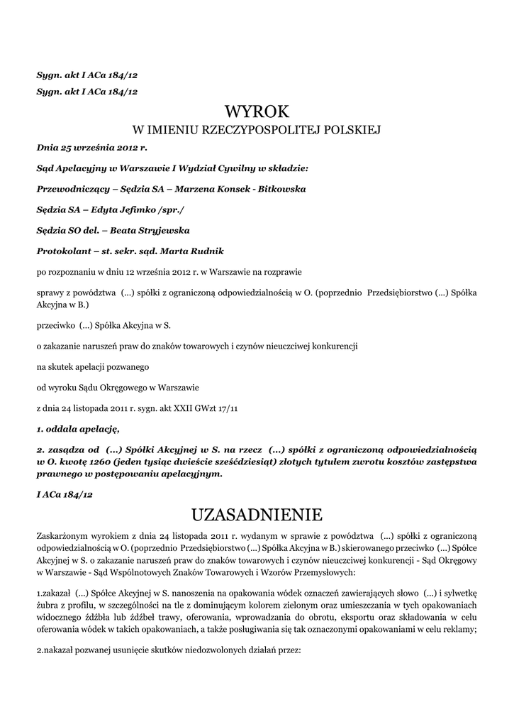 Sygn. akt I ACa 184/12 Sygn. akt I ACa 184/12 WYROK W IMIENIU RZECZYPOSPOLITEJ POLSKIEJ Dnia 25 września 2012 r. Sąd Apelacyjny w Warszawie I Wydział Cywilny w składzie: Przewodniczący – Sędzia SA – Marzena Konsek - Bitkowska Sędzia SA – Edyta Jefimko /spr./ Sędzia SO del. – Beata Stryjewska Protokolant – st. sekr. sąd. Marta Rudnik po rozpoznaniu w dniu 12 września 2012 r. w Warszawie na rozprawie sprawy z powództwa (...) spółki z ograniczoną odpowiedzialnością w O. (poprzednio Przedsiębiorstwo (...) Spółka Akcyjna w B.) przeciwko (...) Spółka Akcyjna w S. o zakazanie naruszeń praw do znaków towarowych i czynów nieuczciwej konkurencji na skutek apelacji pozwanego od wyroku Sądu Okręgowego w Warszawie z dnia 24 listopada 2011 r. sygn. akt XXII GWzt 17/11 1. oddala apelację, 2. zasądza od (...) Spółki Akcyjnej w S. na rzecz (...) spółki z ograniczoną odpowiedzialnością w O. kwotę 1260 (jeden tysiąc dwieście sześćdziesiąt) złotych tytułem zwrotu kosztów zastępstwa prawnego w postępowaniu apelacyjnym. I ACa 184/12 UZASADNIENIE Zaskarżonym wyrokiem z dnia 24 listopada 2011 r. wydanym w sprawie z powództwa (...) spółki z ograniczoną odpowiedzialnością w O. (poprzednio Przedsiębiorstwo (...) Spółka Akcyjna w B.) skierowanego przeciwko (...) Spółce Akcyjnej w S. o zakazanie naruszeń praw do znaków towarowych i czynów nieuczciwej konkurencji - Sąd Okręgowy w Warszawie - Sąd Wspólnotowych Znaków Towarowych i Wzorów Przemysłowych: 1.zakazał (...) Spółce Akcyjnej w S. nanoszenia na opakowania wódek oznaczeń zawierających słowo (...) i sylwetkę żubra z profilu, w szczególności na tle z dominującym kolorem zielonym oraz umieszczania w tych opakowaniach widocznego źdźbła lub źdźbeł trawy, oferowania, wprowadzania do obrotu, eksportu oraz składowania w celu oferowania wódek w takich opakowaniach, a także posługiwania się tak oznaczonymi opakowaniami w celu reklamy; 2.nakazał pozwanej usunięcie skutków niedozwolonych działań przez: a. zniszczenie znajdujących się w jej dyspozycji etykiet na butelki wódek z oznaczeniami zawierającymi element słowny (...) de (...) lub (...), sylwetkę żubra z profilu, w szczególności na tle z dominującym kolorem zielonym, przechowywanych w siedzibie (...) S.A. w S. lub w innych miejscach, b. wycofanie wprowadzonych do obrotu, a będących jeszcze własnością pozwanej, butelek i innych opakowań wódek z oznaczeniami zawierającymi element słowny (...) de (...) lub (...), sylwetką żubra z profilu, w szczególności na tle z dominującym kolorem zielonym oraz z widocznym źdźbłem lub źdźbłami trawy; 3.oddalił w pozostałej części powództwo ; 4.opłatę ostateczną ustalił na kwotę 5.000 zł, uznając ją za pobraną od powódki do kwoty 1.000 zł; 5.nakazał pobrać od (...) S.A. w S. na rzecz Skarbu Państwa – Sądu Okręgowego w Warszawie kwotę 4.000 zł tytułem pozostałej części opłaty ostatecznej; 6.zasądził od pozwanej na rzecz powódki kwotę 1.019zł , tytułem zwrotu kosztów procesu. Powyższy wyrok Sąd Okręgowy wydał na podstawie następujących ustaleń faktycznych i wniosków. (...) spółka z ograniczoną odpowiedzialnością w O. (poprzednio Przedsiębiorstwo (...) Spółka Akcyjna w B.) jest producentem alkoholi, któremu przysługują prawa wyłączne do : 1. 1. słowno-graficznego wspólnotowego znaku towarowego nr (...), chronionego od 22 grudnia 2006 r. dla towarów w klasie 33 klasyfikacji nicejskiej, tj. napojów alkoholowych (z wyjątkiem piwa); wódki i drinków zawierających wódkę, 2. przestrzennego wspólnotowego znaku towarowego nr (...), chronionego od 21 sierpnia 2007 r. dla towarów w klasie 33 klasyfikacji nicejskiej, tj. napojów alkoholowych (z wyjątkiem piwa); wódki i drinków zawierających wódkę, 3. słowno-graficznego znaku towarowego zarejestrowanego pod nr R- (...), chronionego od 31 października 1966 r. dla towarów w klasie 33 klasyfikacji nicejskiej, tj. napojów alkoholowych, 4. przestrzennego znaku towarowego zarejestrowanego pod nr R- (...), chronionego od 30 sierpnia 1995 r. dla towarów w klasie 33 klasyfikacji nicejskiej, tj. napojów alkoholowych, 5. słowno-graficznego znaku towarowego zarejestrowanego pod nr R- (...), chronionego od 20 listopada 1991 r. dla towarów w klasie 33 klasyfikacji nicejskiej, tj. napojów alkoholowych, 6. słowno-graficznego znaku towarowego zarejestrowanego pod nr R- (...), chronionego od 20 listopada 1991 r. dla towarów w klasie 33 klasyfikacji nicejskiej, tj. napojów alkoholowych, 7. słownego znaku towarowego (...) zarejestrowanego pod nr R- (...), chronionego od 29 czerwca 1995 r. dla towarów w klasie 33 klasyfikacji nicejskiej, tj. napojów alkoholowych, 8. słowno-graficznego znaku towarowego zarejestrowanego pod nr R- (...), chronionego od 13 listopada 1997 r. dla towarów w klasie 33 klasyfikacji nicejskiej, tj. napojów alkoholowych, 9. przestrzennego znaku towarowego (...) zarejestrowanego pod nr R- (...), chronionego od 15 kwietnia 2005 r. dla towarów w klasie 33 klasyfikacji nicejskiej, tj. napojów alkoholowych, 10. słowno-graficznego znaku towarowego (...), zarejestrowanego pod nr R- (...), chronionego z pierwszeństwem od 21 maja 2007 r. dla towarów w klasie 33 klasyfikacji nicejskiej, tj. napojów alkoholowych, 11. przestrzennego znaku towarowego zarejestrowanego pod nr R- (...). chronionego od 21 maja 2007 r. dla towarów w klasie 33 klasyfikacji nicejskiej, tj. napojów alkoholowych Powódka produkuje i oferuje m.in. wódkę ziołową, znaną na polskim rynku pod nazwą (...) od lat 50-tych XX wieku. Wódka ta jest sprzedawana w opakowaniach szklanych, różnej pojemności, także w wydaniach miniaturowych i kolekcjonerskich, w których umieszczone jest źdźbło trawy, z etykietą w kolorze zielonym lub białym z wizerunkiem żubra. Jest znana i ceniona także poza granicami Polski, pod nazwą : w wersji angielskiej - (...)