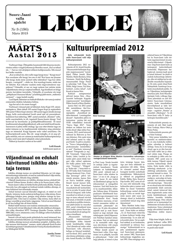 Suure-Jaani valla ajaleht Nr 3 (156) Märts 2013 LEOLE MÄRTS Aastal 2013 Veebruari lõpp. Õhtupäike kuumutab läbi klaasi ja mootorimüra sekka voogab Johanna ja Henriku suust „Kui sa tahad nii...“. Taevas värvub järjest rohkem kuldpunaseks. Mis muud kui hetke nautida. „Kui sa tahad nii, olen sulle nagu keegi muu.“ Keegi muu? Kas suudame olla keegi, kes me ei ole? Kui kaua me jõuame olla keegi, keda meie asemel näha tahetakse? Aga kui oleks hoopis „vastupidi“ – oleks ise. Kui muidugi teame, mida me ise tahame. Kas oskame vaadata enda sügavaimatesse soppidesse? Võimalik, et see on isegi raskem kui mõista teiste väljaütlemata sõnu ja varjatud mõtteid. Aga kindlasti on kõige parem, kui jääme iseendaks. Võimalik, et suudame siis isegi „põhjakaare lõunasse lükata“ ja kellelegi jääb meist „mälestus surmani“ – nagu laulab raadio. Laul lõpeb, läänetaevas hakkab lillakaks värvuma ja märtsi esimesteks öödeks lubatakse külma. Aga kevad ei ole enam kaugel. Veebruari viimasel päeval tähistati Artur Kapi 135. sünniaastapäeva. Mais täitub 105 aastat Eugen Kapi ja septembris 100 aastat Villem Kapi sünnist. 180 aastat tagasi sündis Joosep Kapp, kelle eestvedamisel loodi omal ajal nii pasunakoor, laulukoor kui näitering. 1887. aastal asutatud „Ilmatari” selts, mille auesimeheks ta oli, tegutseb Suure-Jaanis tänagi. Veel kestavad ka koorilaulu- ja puhkpillitraditsioonid. Et need traditsioonid edaspidigi jätkuksid, selle eest tuleb hoolt kanda. Iseenesest ei juhtu mitte midagi. Iga uue ettevõtmise taga on mõni inimene ja ka traditsioonide tekkimise ning püsimise taga on inimesed. Kuigi kipume seda vahel unustama. On kultuuripärandi aasta. Eks ole seegi märgiks, et on aeg selgeks mõelda, mis on vaimne ja materiaalne kultuuripärand ja kuidas neid meie järel tulejatele edasi pärandada. Päikest ja kaunist saabuvat kevadet! Leili Kuusk [email protected] Viljandimaal on edukalt käivitunud isikliku abistaja teenus Isikliku abistaja teenus on mõeldud liikumis- ja/või nägemisraskustega inimestele, et nad ise saaksid kodust välja minna, oma asju ajada, liikuda ning suhelda. Viljandi maakonnas on isikliku abistaja teenus edukalt käivitunud Võhma linnas, Karksi vallas ja ka Suure-Jaani vallas. Suure-Jaani vallas on hetkel kolm piirkonda (Kildu, Paala ja Navesti), kus abivajajad on leidnud endale isikliku abistaja, et oma käimised turvalisemaks muuta. Antud teenust saavad kliendid räägivad, et nüüd on neil lõpuks inimene, keda oodata ja kellega koos välja minna. Koos abistajaga käiakse poes, pangas ning tehakse autoga ka kaugemaid sõite. Üksi nad ei suudaks välja minna, kuna ühel on kõrge vererõhk ja teisel kehv nägemine. Talvel on teed libedad ja on hea kellegi käe alt kinni hoida. Hetkel tuleb teenuse eest maksta minimaalne omaosalus. Kui ka teil või teie lähedasel võiks abi olla isiklikust abistajast, siis võtke ühendust MTÜ Teemega (Jaanika Toome, telefon 5880 2462, www.mtuteeme.com) või rääkige sellest kohalikule sotsiaaltöötajale. Samuti võivad meie poole pöörduda ka need inimesed, kes juba aitavad mõnda liikumis- ja/või nägemisraskusega inimest. Isikliku abistaja teenust arendatakse projekti „Isikliku abistaja teenuse käivitamine“ raames, mida rahastab Eesti-Šveitsi koostööprogrammi Vabaühenduste Fond ja Kodanikuühiskonna Sihtkapital KÜSK. Jaanika Toome MTÜ Teeme Kultuuripreemiad 2012 Juba seitsmendat korda andis Suure-Jaani vald välja kultuuripreemiaid. Kultuuripreemia 2012 nominente oli 14: Anneli Kundla, ”Muuseumiöö heliloojate Kappide majamuuseumis” korraldajad, Pikkar Joandi, Riina Mankin, Madis Randaru, Erika Tetsmann, Heidi Oja-Kalberg, meesansambel Pange Poisid ja juhendaja Valli Pang, Liis Pihlik, Helgi Linnas, Tiiu Siim, kontsert „Loitsu tahud”, Leili Kuusk ja Jaanus Siim. Kultuuri aastapreemiad pälvisid Jaanus Siim, „Muuseumiöö heliloojate Kappide majamuuseumis” korraldajad, Pikkar Joandi ja Riina Mankin. Jaanus Siim viis 2012 aastal läbi meistriklasse Ida-Virumaal, osaledes integratsiooniprojektis „Kunstilised nädalavahetused. Loominguline dessant“. Septembris pälvis ta tunnustuse parima töö eest XVIII vabariiklikul festivalil “Narva Sügis 2012”. Tema töödest on rohkem kui tosin korda olnud väljas näitus Suure-Jaanis. 2012. aastal toimusid näitused ka Rakveres ja Soomes Jokioises. Edu saatis tema töid eelmisel aastal ka väljapool Eestit. Ta pälvis eriauhinna “Terava fotograafipilgu ja professionaalse meisterlikkuse eest” Peterburis toimunud näitusel “Fotograafia ja aeg”. 450 Venemaalt, Valgevenest, Eestist, Lätist, Leedust ja Iisraelist pärit autori tööde hulgast välja valitud sajakonna töö hulka pääses kolm tema oma: “Trummar”, “Dirigent” ja “Kolm õde”. 7 tema tööd valiti 103 hulka Eesti Fotokunsti Ühingu konkursil. Foto „Viiuldaja Jeesusega“ pälvis kolmanda preemia. Jaanus Siim on Narva fotoklubi auliige. Ilmselt teavad Jaanust kõik, kes on käinud Suure-Jaani muusikafestivalil kontsertidel, sest ta on juba 14 aastat olnud festivali fotograaf, kelle kohta muusikud on öelnud, et aastatega on tema oskused niivõrd kasvanud, et fotodele on peale muusikute ja publiku õnnestunud jäädvustada ka muusika! 2012. aastal võimaldasid tema fotod kokku panna Suure-Jaani muusikafestivali ajalugu käsitleva fotoalbumi. „Muuseumiöö heliloojate Kappide majamuuseumis” korraldajate kohta kirjutab nende kandidaadiks esitaja: „Nad ühendavad endas mitut Suure-Jaani valla allasutust, kellega on liitunud teotahtelised huvilised. 2012. aastal olid ettevõtmise põhilisteks vedajateks Anneli Kundla, Liis Pihlik Niini Veskioja FOTO: Leili Kuusk. Ilmatar ja dirigent Riina Mankin Vastemõisa rahvamajas isetegevuslaste kontserdil. FOTO: Leili Kuusk. ja Piret Luup. Nende koostöö on eeskuju andev ja tegutsemislust kaasahaarav. Nende fantaasia on kadedakstegev. 2012. aastal näitasid nad, et Suure-Jaani valla