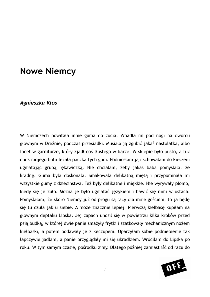 Nowe Niemcy Agnieszka Kłos W Niemczech powitała mnie guma do żucia. Wpadła mi pod nogi na dworcu głównym w Dreźnie, podczas przesiadki. Musiała ją zgubić jakaś nastolatka, albo facet w garniturze, który zjadł coś tłustego w barze. W sklepie było pusto, a tuż obok mojego buta leżała paczka tych gum. Podniosłam ją i schowałam do kieszeni ugniatając grubą rękawiczką. Nie chciałam, żeby jakaś baba pomyślała, że kradnę. Guma była doskonała. Smakowała delikatną miętą i przypominała mi wszystkie gumy z dzieciństwa. Też były delikatne i miękkie. Nie wyrywały plomb, kiedy się je żuło. Można je było ugniatać językiem i bawić się nimi w ustach. Pomyślałam, że skoro Niemcy już od progu są tacy dla mnie gościnni, to ja będę się tu czuła jak u siebie. A może znacznie lepiej. Pierwszą kiełbasę kupiłam na głównym deptaku Lipska. Jej zapach unosił się w powietrzu kilka kroków przed psią budką, w której dwie panie smażyły frytki i szatkowały mechanicznym nożem kiełbaski, a potem podawały je z keczupem. Oparzyłam sobie podniebienie tak łapczywie jadłam, a panie przyglądały mi się ukradkiem. Wróciłam do Lipska po roku. W tym samym czasie, pośrodku zimy. Dlatego później zamiast iść od razu do 1 Instytutu, łaziłam z walizką po zaśnieżonych ulicach i przypominałam sobie wszystko. W dali był mały placyk, na której w zeszłym roku stała zabytkowa, wielka karuzela. Bernd powiedział, że ktoś ją podpalił. Kręciła się jeszcze przed Bożym Narodzeniem, a potem ktoś podłożył pod nią ogień. Plac był pusty. A jednak wszystkie ulice Lipska w samym centrum były takie mityczne, wyczekujące i zaśnieżone. Wlokłam walizkę po grubym śniegu i nie widziałam ani jednego człowieka. Kiedy zatoczyłam koło, zobaczyłam, że psia budka jest zamknięta na gruby łańcuch. Chciałam zjeść kolejną kiełbaskę, ale było zamknięte. Zobaczyłam przez szybę pozmywane blaty, umyte noże, powieszone suszarki do ziemniaków, mokre fartuszki i ściereczki. Kobiet nie było. W pokoju gościnnym usiadłam w butach i kurtce. Było tak ciepło i cicho, że przysiadłam na chwilę. Nasłuchiwałam pokoju. Naprzeciw były biura i rano migały mi w oknach dwie panie, które stukały w klawisze komputera, odrywały oczy i wpatrywały się bezwiednie w moje okna. Wyskakiwałam w piżamie jakby budził mnie ich wzrok, a potem zasłaniałam żaluzje. W południe przychodził do nich facet. Wpatrywał się w komputer, stał nad nimi przechylony. Bezwstydnie. Rozporek miał na wysokości ich oczu i ust. To się zdarzyło pierwszej nocy. Wyszłam do miasta, żeby napić się piwa i zobaczyć raz jeszcze ciche, mityczne uliczki małego Lipska. Obejść wokół placyku, na której spłonęła piękna karuzela. Wraz z moim koniem, na którego wsiadłam ubiegłej zimy. Koń był biały, ogromny, z ledwością się na niego wdrapałam. Na ulicy nie było nikogo. Podeszłam do sklepu chińskiego i zatoczyłam koło, a potem zrobiło mi się tak zimno, że postanowiłam wrócić. I wtedy zaczepiło mnie tych dwoje. Najpierw facet na cichym wózku. Jeździł nim po pustym deptaku i żebrał. Mechaniczne kółeczka mknęły po śniegu i lodzie, a on na wydechu prosił o kasę. Wokół mnie zatoczył tylko kółko jakbym była niewidoczna i popędził do starszej kobiety. Odbił się od niej jak na tafli lodu, obrócił wokół osi i wykonał taką wdzięczną figurę, a potem odjechał. Nie pamiętam nawet czy dostał forsę. Kobieta spytała, czy nie znam knajpy Baum, bo ona chętnie napiłaby się kawy. Wiedziałam, że knajpa leży zaraz przy Instytucie, ale nie umiałam jej 2 tego powiedzieć. Kiwnęłam tylko ręką i prowadziłam przez uliczki Lipska. Nie ufała mi, nie wierzyła, stawała i kręciła głową, raz próbowała zawrócić, chwyciła za rękę, cofnęła się ostentacyjnie na ulicę, prosiła ręką zawracajmy, ale nie dałam za wygraną. Chodź, mówiłam po polsku. Alles Gut, zapewniałam. Nach Baum, kafee. Niemka mi nie wierzyła, bała się, kiedy weszłyśmy w ciemny zaułek. Puściła mnie przodem, chciała zwiać. W końcu stanęłyśmy przed knajpą. Pokazałam na wejście. Baum, widzisz? Ale ona straciła nagle cały swój zapał. Wpatrywała się tempo w napis, oglądała okienka oświetlone mlecznym światłem. To Baum, Kafe Baum, widzisz? Dotarłyśmy, możesz iść na kawę. Kafe Baum alte, pokazywałam jej ręką. Nie pomogło. Niemka widocznie zrezygnowała w ostatniej chwili i za nic w świecie nie chciała tam wejść. Ja idę, powiedziałam na głos. Odchodzę, guten Nacht. I poszłam w stronę Instytutu. Nie mogłam się nie roześmiać, śmiałam się jak obłąkana z Niemki, która zna gorzej Lipsk ode mnie i nie dociera sama do najstarszej knajpy w tym mieście. Odkrywam ją przed nią, zachęcam do wejścia, tłumaczę, że jesteśmy na miejscu i przypominam sobie właśnie jej słowa; kafee. Chciała się tylko napić kawy. Samej kawy. Nie w zabytkowej knajpie, nie w Baum, gdziekolwiek indziej, nie tam. Zatoczyłyśmy razem kółko, obiegłyśmy deptak, pusty plac po karuzeli i dotarłyśmy do małego placyku z fontanną pośrodku. Skręcało mnie ze śmiechu i śmiałam się w kilku dalszych miejscach; przy wejściu do windy, na schodach na piętro i tuż przy moich drzwiach. Zapomniałam o piwie. Chciałam się wrócić. Zeszłam po schodach, weszłam na dziedziniec, podeszłam w stronę zimnej uliczki. Na dworze było pusto. Sądziłam , że spotkam moją Niemkę, że raz jeszcze zobaczę jej ciemny skafander na tle śniegu, ale nie było żywej duszy. Powietrze stało od mrozu. To była polska zima ze stanu wojennego. Delikatnie, kropla po kropli dotarła do Niemiec i po wielu, wielu latach mogłam jej wreszcie dotknąć. Miasto wyglądało jak po imprezie. Sprzątnięte, umyte na noc. Nie było świątecznych straganów, kiełbasek na ruszcie, kubeczków z grzanym winem. Wszystko się