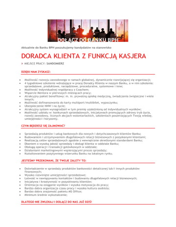 Aktualnie do Banku BPH poszukujemy kandydatów na stanowisko DORADCA KLIENTA Z FUNKCJĄ KASJERA MIEJSCE PRACY: SANDOMIERZ DZIĘKI NAM ZYSKASZ: Możliwość rozwoju zawodowego w ramach globalnej, dynamicznie rozwijającej się organizacji; 4 tygodniowe szkolenie wdrażające w pracę Doradcy Klienta w naszym Banku, a w nim szkolenia: sprzedażowe, produktowe, narzędziowe, proceduralne, systemowe i inne; Możliwość indywidualnej współpracy z Coachem; Wsparcie Mentora w pierwszych miesiącach pracy; Atrakcyjny pakiet benefitowy: m. in. prywatną opiekę medyczną, świadczenia świąteczne i wiele innych; Możliwość dofinansowania do karty multiport/multibilet, wypoczynku; Ubezpieczenie NNW i na życie; Atrakcyjny system wynagrodzeń w tym premię uzależnioną od indywidualnych wyników; Możliwość udziału w: konkursach sprzedażowych, inicjatywach promujących zdrowy tryb życia, rozwój zawodowy, licznych akcjach wolontariackich, szkoleniach poszerzających Twoją wiedzę, umiejętności i horyzonty. CZYM BĘDZIESZ SIĘ ZAJMOWAĆ? Sprzedażą produktów i usług bankowych dla nowych i dotychczasowych klientów Banku; Budowaniem i utrzymywaniem długofalowych relacji biznesowych z pozyskanymi klientami; Realizacją celów sprzedażowych zgodnie z wewnętrznie określonymi standardami Banku; Dbaniem o wysoką jakość sprzedaży i obsługi klienta w oddziale Banku; Obsługą operacji i transakcji gotówkowych w oddziale; Działaniami marketingowymi wspierającymi proces sprzedaży; Kształtowaniem pozytywnego wizerunku Banku na lokalnym rynku. JESTEŚMY PRZEKONANI, ŻE TWOJE ZALETY TO: Doświadczenie w sprzedaży produktów bankowości detalicznej lub/i innych produktów finansowych; Wysoko rozwinięte umiejętności sprzedażowe; Łatwość w nawiązywaniu kontaktów i budowaniu długofalowych relacji biznesowych; Inicjatywa i kreatywność w pozyskiwaniu klientów; Orientacja na osiąganie wyników i wysoka motywacja do pracy; Bardzo dobra organizacja czasu pracy i wysoka kultura osobista; Bardzo dobra znajomość pakietu MS Office; Minimum średnie wykształcenie; DLATEGO NIE ZWLEKAJ I DOŁĄCZ DO NAS JUŻ DZIŚ! Osoby zainteresowane prosimy o przesyłanie aplikacji na adres: [email protected] Na ofertach prosimy o zamieszczenie klauzuli: “Zgodnie z ustawą z dn. 29.08.97 r. o ochronie danych osobowych (Dz. U. nr 133 poz. 883), wyrażam zgodę na przetwarzanie moich danych osobowych dla celów związanych z procesem rekrutacji i selekcji realizowanych przez Bank BPH S A, z siedzibą w Gdańsku, przy ul. płk. Jana Pałubickiego 2, 80-175, Gdańsk.” Uprzejmie informujemy, że skontaktujemy się jedynie z wybranymi osobami. Do zakresu obowiązków osoby zatrudnionej na tym stanowisku należeć będzie wykonywanie czynności agencyjnych w rozumieniu ustawy z dnia 22 maja 2003 r. o pośrednictwie ubezpieczeniowym (jedn. tekst Dz. U. 2014 poz. 1450). W momencie zawarcia umowy o pracę z Bankiem BPH konieczne będzie przedłożenie aktualnego zaświadczenia z Krajowego Rejestru Karnego oraz dokumentu potwierdzającego wykształcenie.