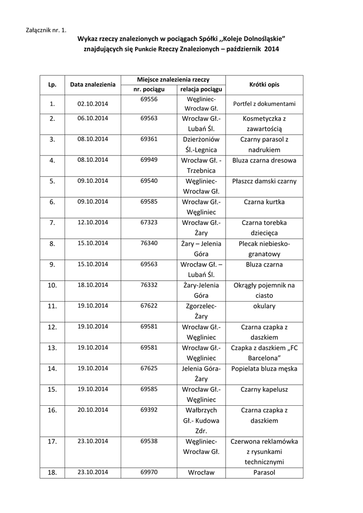 Załącznik nr. 1. Wykaz rzeczy znalezionych w pociągach Spółki ,,Koleje Dolnośląskie” znajdujących się Punkcie Rzeczy Znalezionych – październik 2014 Lp. Data znalezienia 1. 02.10.2014 2. 06.10.2014 Miejsce znalezienia rzeczy nr. pociągu relacja pociągu 69556 WęgliniecWrocław Gł. 69563 Wrocław Gł.- 3. 08.10.2014 69361 4. 08.10.2014 69949 5. 09.10.2014 69540 6. 09.10.2014 69585 7. 12.10.2014 67323 8. 15.10.2014 76340 9. 15.10.2014 69563 10. 18.10.2014 76332 11. 19.10.2014 67622 12. 19.10.2014 69581 13. 19.10.2014 69581 14. 19.10.2014 67625 15. 19.10.2014 69585 16. 20.10.2014 69392 17. 23.10.2014 69538 18. 23.10.2014 69970 Lubań Śl. Dzierżoniów Śl.-Legnica Wrocław Gł. Trzebnica WęgliniecWrocław Gł. Wrocław Gł.Węgliniec Wrocław Gł.Żary Żary – Jelenia Góra Wrocław Gł. – Lubań Śl. Żary-Jelenia Góra ZgorzelecŻary Wrocław Gł.Węgliniec Wrocław Gł.Węgliniec Jelenia GóraŻary Wrocław Gł.Węgliniec Wałbrzych Gł.- Kudowa Zdr. WęgliniecWrocław Gł. Wrocław Krótki opis Portfel z dokumentami Kosmetyczka z zawartością Czarny parasol z nadrukiem Bluza czarna dresowa Płaszcz damski czarny Czarna kurtka Czarna torebka dziecięca Plecak niebieskogranatowy Bluza czarna Okrągły pojemnik na ciasto okulary Czarna czapka z daszkiem Czapka z daszkiem „FC Barcelona” Popielata bluza męska Czarny kapelusz Czarna czapka z daszkiem Czerwona reklamówka z rysunkami technicznymi Parasol 19. 25.10.2014 69517 20. 25.10.2014 69517 21. 25.10.2014 69812 22. 26.10.2014 69581 23. 26.10.2014 69970 24. 27.10.2014 69801 25. 27.10.2014 69548 26. 28.10.2014 69565 27. 29.10.2014 69563 28. 31.10.2014 69567 29. 31.10.2014 69975 Nadodrze Trzebnica Wrocław Gł.Węgliniec Wrocław Gł.Węgliniec Dzierżoniów Śl.- Wrocław Gł. Wrocław Gł.Węgliniec TrzebnicaWrocław Nadodrze Wrocław Gł.Dzierżoniów Śl. WęgliniecWrocław Gł. Wrocław Gł.Węgliniec Wrocław Gł.Lubań Śl. Wrocław Gł.Lubań Śl. Wrocław N/OTrzebnica pomarańczowo-zielony Zaświadczenie o uczęszczaniu na studia Trzy plastikowe pojemniki Czarny portfel Brązowa sztruksowa czapka z daszkiem Klucze z brelokiem Czarna parasolka z napisem Plecak czarny Czarna czapka z daszkiem Reklamówka białozielona Czarna męska kurtka Tuba z dwoma plakatami