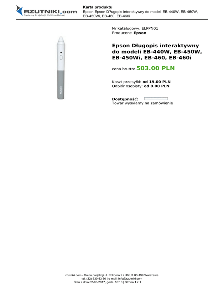 Karta produktu Epson Epson D?ugopis interaktywny do modeli EB-440W, EB-450W, EB-450Wi, EB-460, EB-460i Nr katalogowy: ELPPN01 Producent: Epson Epson Długopis interaktywny do modeli EB-440W, EB-450W, EB-450Wi, EB-460, EB-460i cena brutto: 503.00 PLN Koszt przesyłki: od 19.00 PLN Odbiór osobisty: od 0.00 PLN Dostępność: Towar wysyłamy na zamówienie rzutniki.com - Salon projekcji ul. Pokorna 2 / U6,U7 00-199 Warszawa tel. (22) 530 63 50 | e-mail: [email protected] Stan z dnia 02-03-2017, godz. 16:16 | Strona 1 z 1